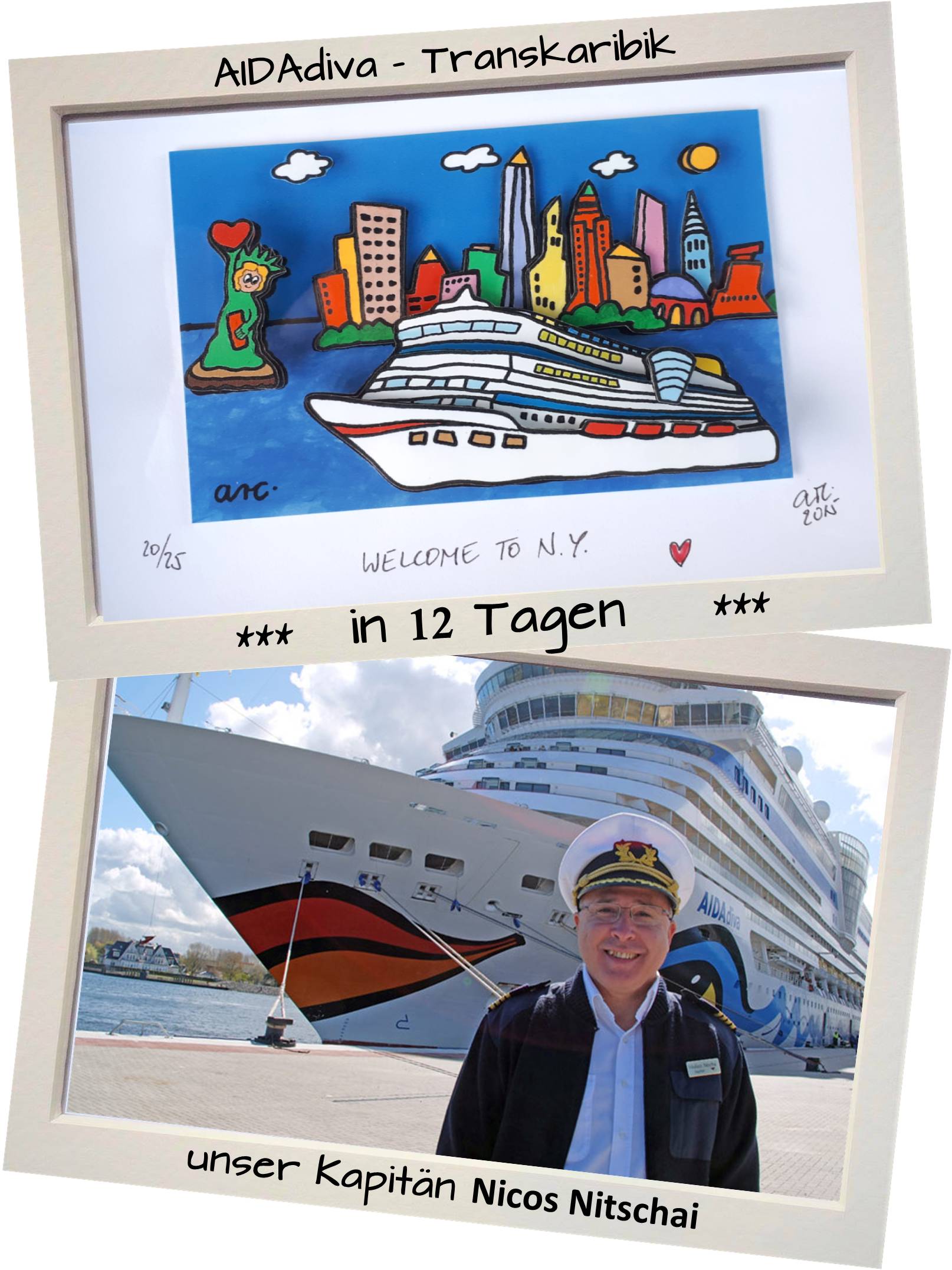 Hallo zusammen! Mein Mann und ich fahren vom 3.11.2018 bis 25.11.2018 mit der Diva von New York bis Montego Bay. Wir fliegen von Frankfurt am Main und kommen aus der Nähe von Aschaffenburg. Wir sind insgesamt das achte Mal mit Aida unterwegs. Wir werden sehr wahrscheinlich auch alle Ausflüge individuell gestalten. Mein Mann spricht fließend Englisch und wir waren auch schon einmal für eine Woche in New York.