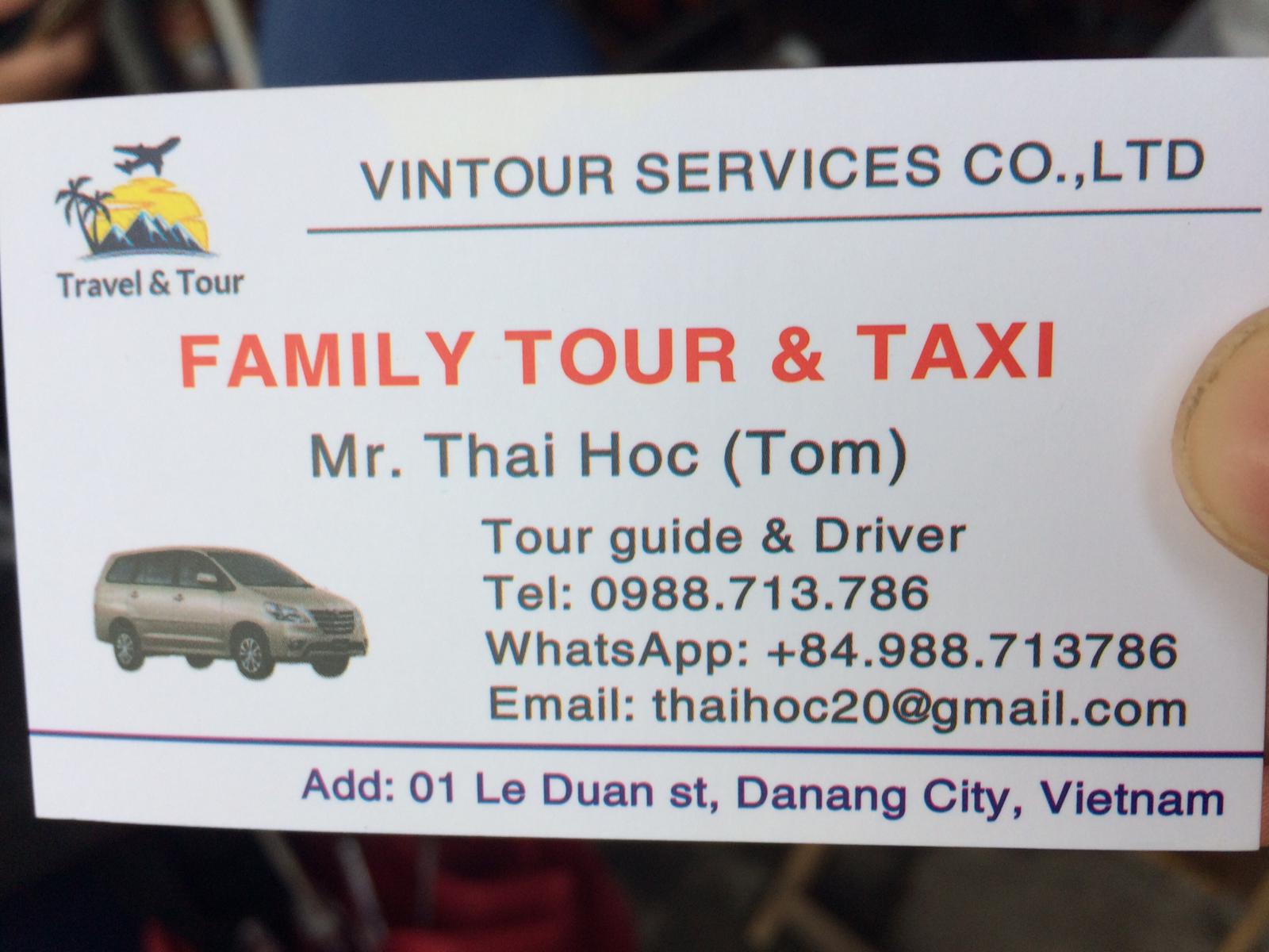Für Da Nang kann ich euch nur wärmstens "Mr. Tom" empfehlen. Der hat uns sieben 6 Stunde mit seinem Taxi die Sehenswürdigkeiten gezeigt und spricht ein sehr gutes Englisch. Insgesamt hat für die Tour 60 USD genommen, d. h. für das Taxi, also unter 10 $ p. P. Er fährt auch am Abend nach Hoi An, wir hatten das mit Schink gemacht.