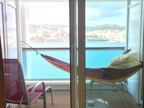 Der (Glas-) Balkon ist recht groß und bietet Platz für 2 Stühle, Fußteil, Tisch und Hängematte.
