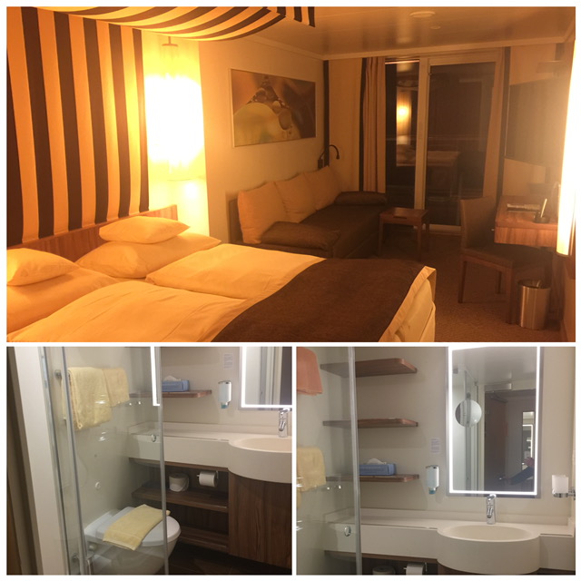 Die Kabine liegt im hinteren Bereich, Backbord und gleich an den beiden Aufzügen, zu den Restaurants.