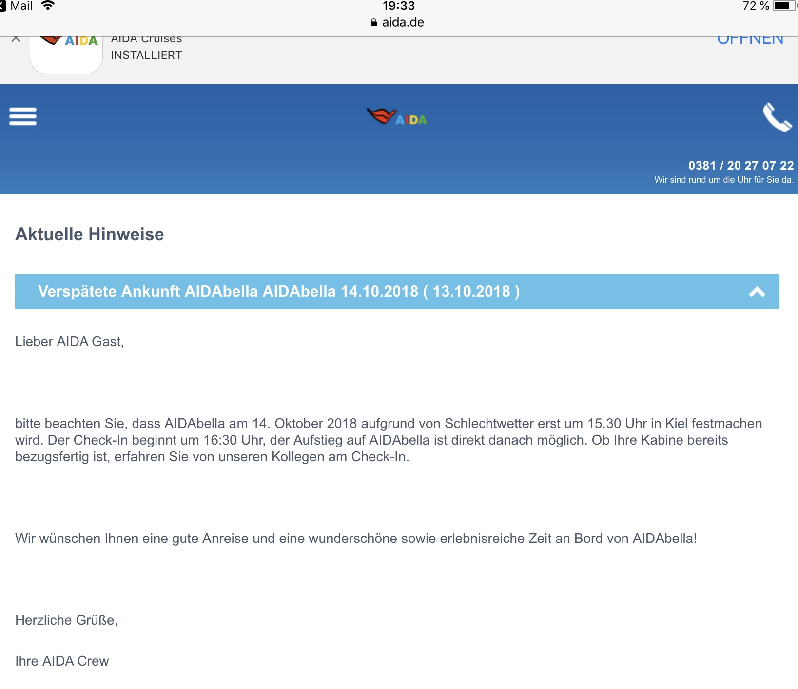 Das kann leider mal passieren, dass es später los geht. Klar wird dann heute seeehr viel los sein beim Einchecken und es dauert deutlich länger, aber für eine Sturm kann Aida leider nichts.
