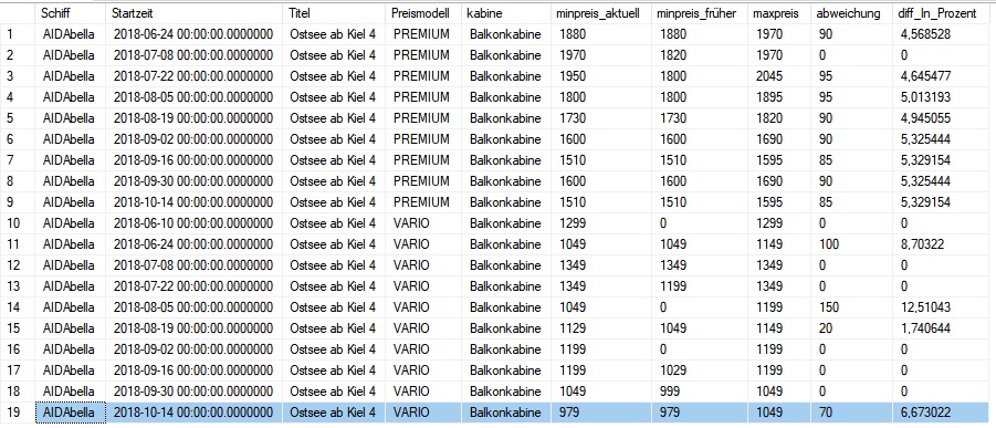 daher hab ich auch erst Preise seit kurzem, aber dafür schon lückenlos für alle AIDA-Kreuzfahrten :D. Da tut sich ja doch relativ viel bei den Vario Preisen. Spannend sind ja auch immer neben den fallenden Preisen, die Steigenden und auch in den unterschiedlichen Preismodellen ![]()