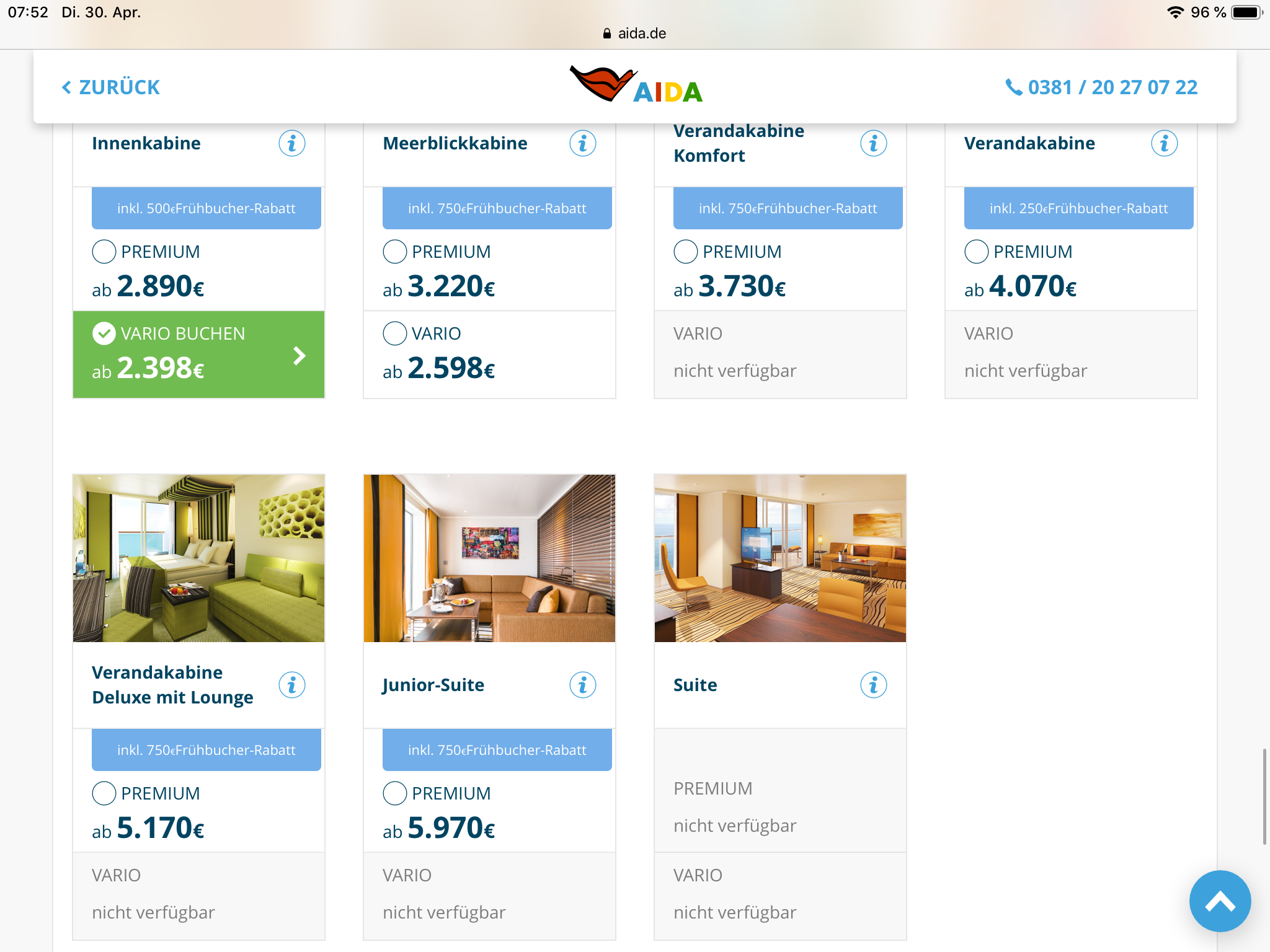 Wir buchen Premium, wenn wir auf einer Reise besonderen Wert auf eine bestimmte Kabine legen. Danach schaue ich mir nicht die Variopreise an, da wir ja das bekommen haben, welches uns wichtig war. Vario buchen wir, wenn uns die Lage der Kabine nicht so wichtig ist. Für Just sind wir leider noch in Lohn und Brot, von daher sind die Urlaubszeiten begrenzt und zT vorgegeben.