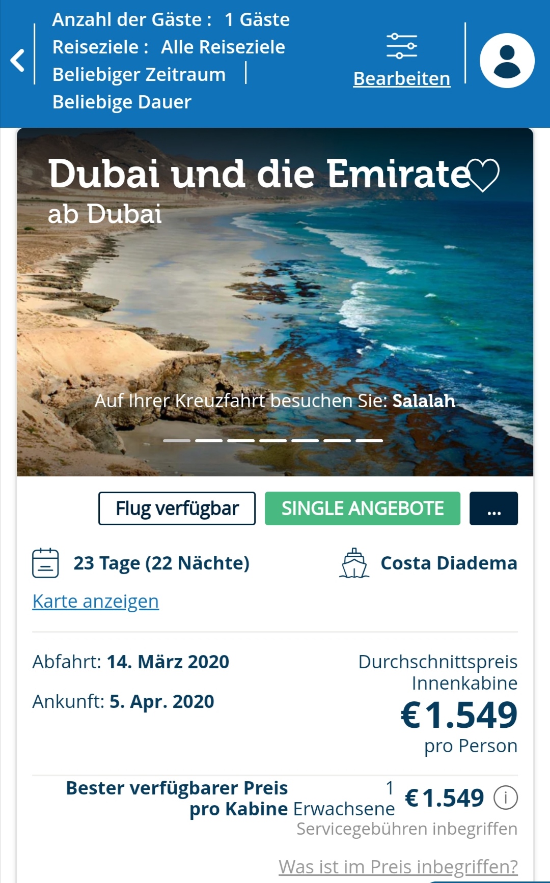 Ich persönlich würde mich in diesem Fall bei einer Reederei umsehen, die Single-Angebote hat.