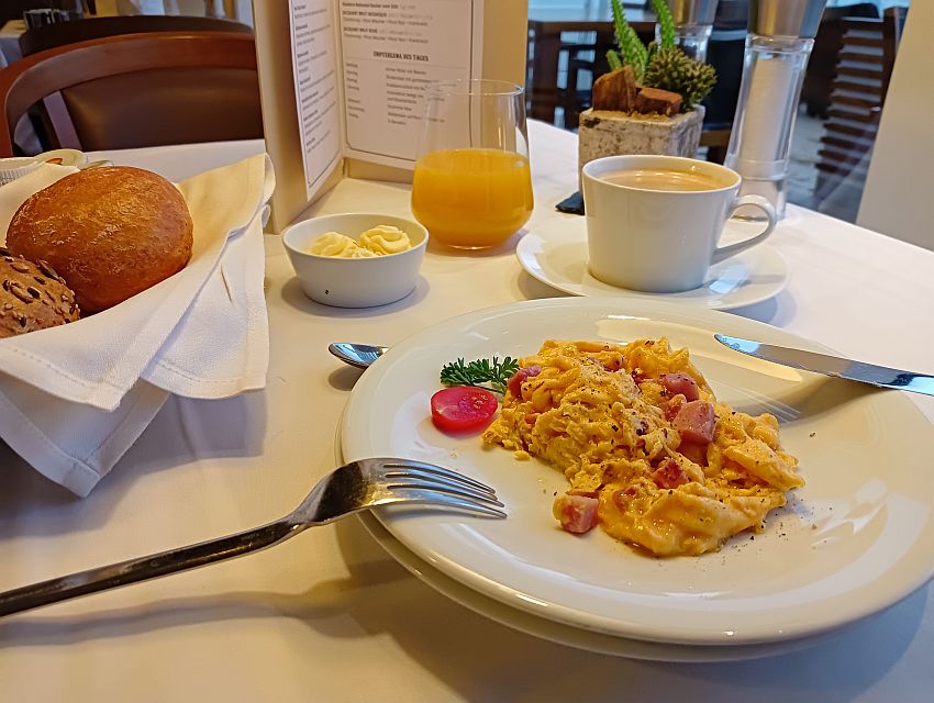 Entschieden hatte ich mich für Rührei mit Schinken sowie die Etagere mit verschiedenen Salamisorten, Käse und Fisch bestücken lassen. Dazu ein frisch gepresster Orangensaft und Kaffee, der den Begriff "Kaffee" wirklich verdient hatte.