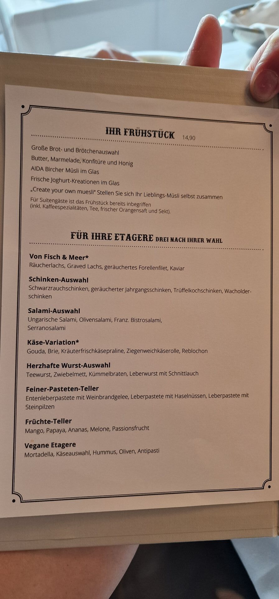 Hi, wenn ich dran denke, mache ich dir morgen gern ein Foto - heute (Sonntag) gab es Krabbensalat - sind gerade auf der Cosma. Das Gourmet-Frühstück lohnt sich in unseren Augen wirklich. Hier mal ein paar Eindrücke