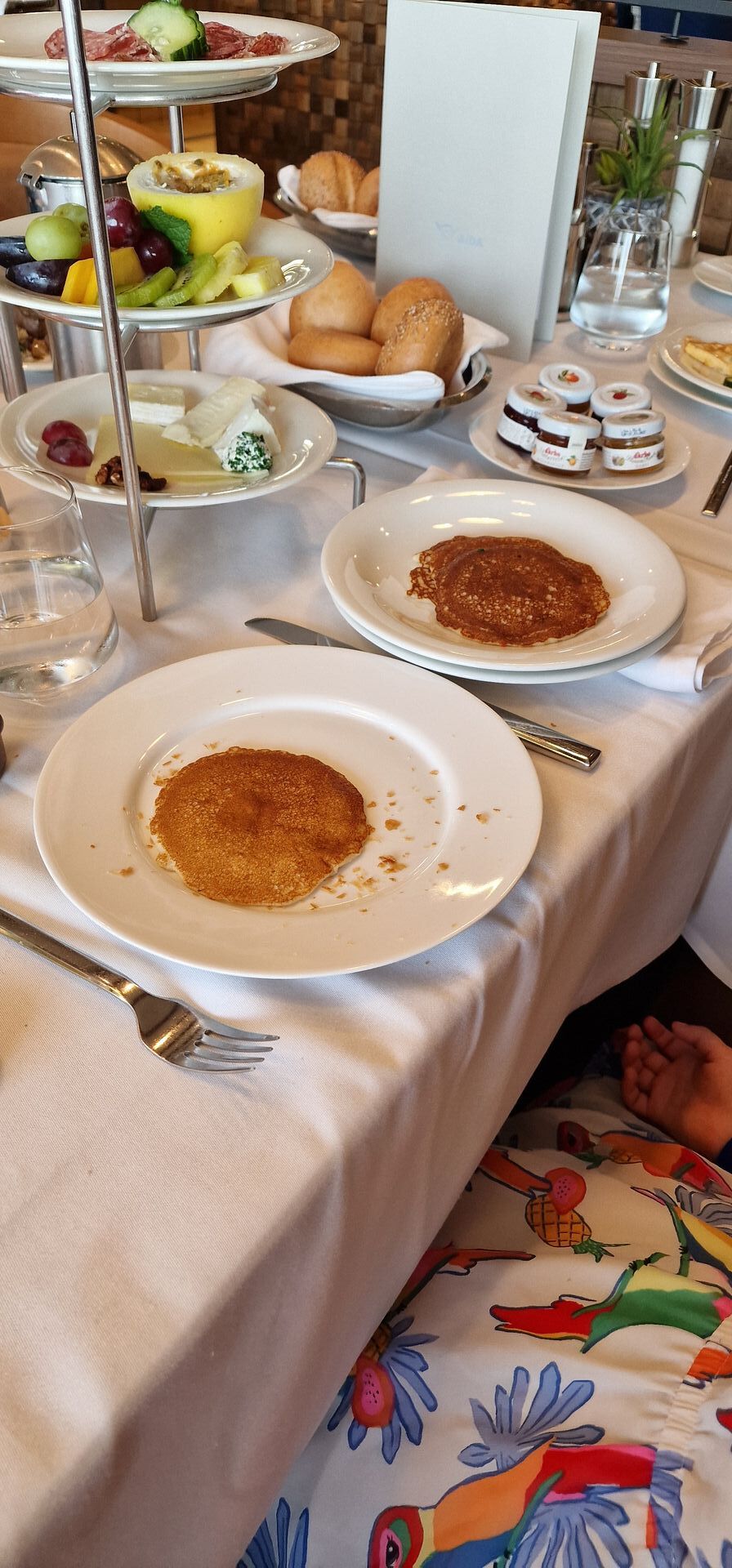Hier scheint überall alles anders/ möglich zu sein. Jetzt grade auf der Perla nix mit Brötchenwagen... Wurstauswahl begrenzt am Buffet. Etagerenbestellung oder man holt sich einzelnes selber.