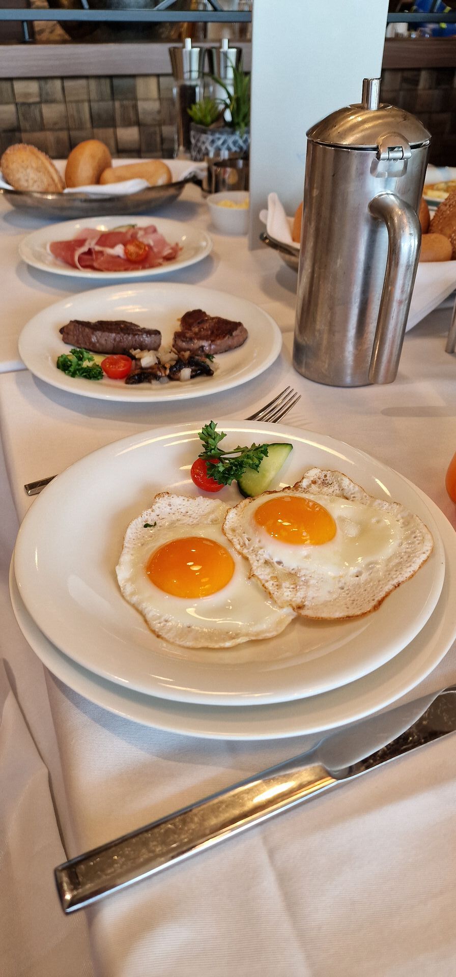 Das Frühstück im Steakhouse ist ruhiger, persönlicher, hochwertiger (Steaks, Highlight des Tages). Und doch hat es uns schon das eine oder andere Mal (eher nicht am Seetag) ins Buffetrestaurant gezogen, weil die Auswahl dort einfach viel größer ist und sich jeder punktgenau das auf den Teller laden kann, was er gerne möchte.