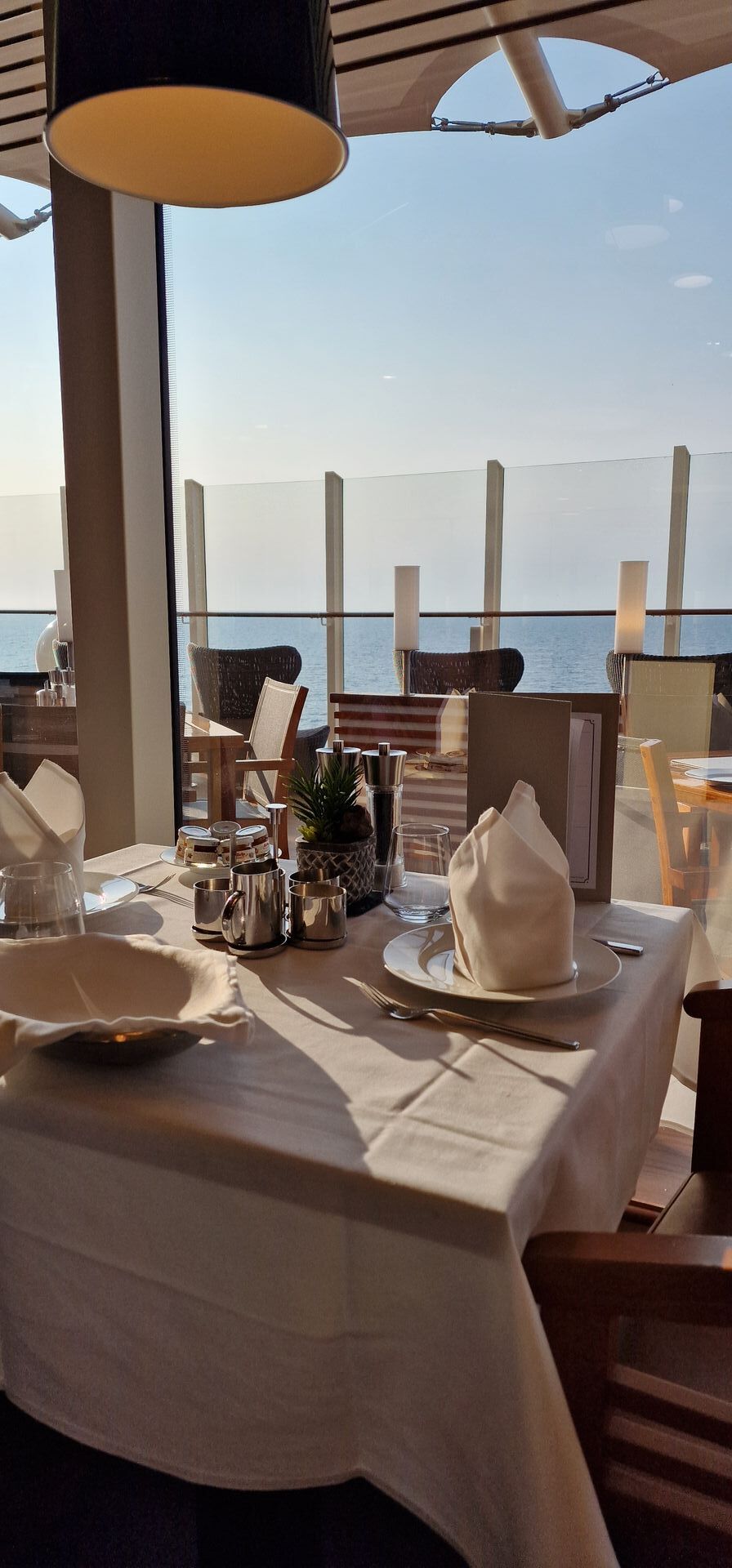Die Woche ist Frühstück zwischen 07.30 Uhr und 10.00 Uhr. Wir waren heute am Seetag gegen 8 Uhr da - da war es noch sehr ruhig, gegen 9.30 Uhr wurde es voller. Die Kellner sind sehr aufmerksam. Neben den zu bestellenden Sachen werde dir sogar Brötchen und Säfte/Wasser zum Platz gebracht. Kann man sich aber auch am Buffet holen.