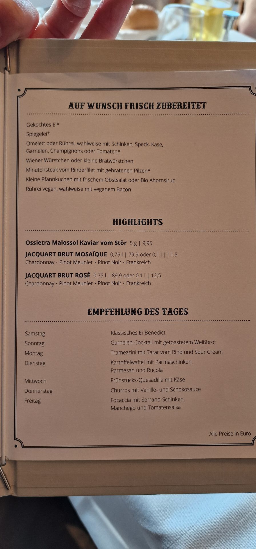Hi, wenn ich dran denke, mache ich dir morgen gern ein Foto - heute (Sonntag) gab es Krabbensalat - sind gerade auf der Cosma. Das Gourmet-Frühstück lohnt sich in unseren Augen wirklich. Hier mal ein paar Eindrücke