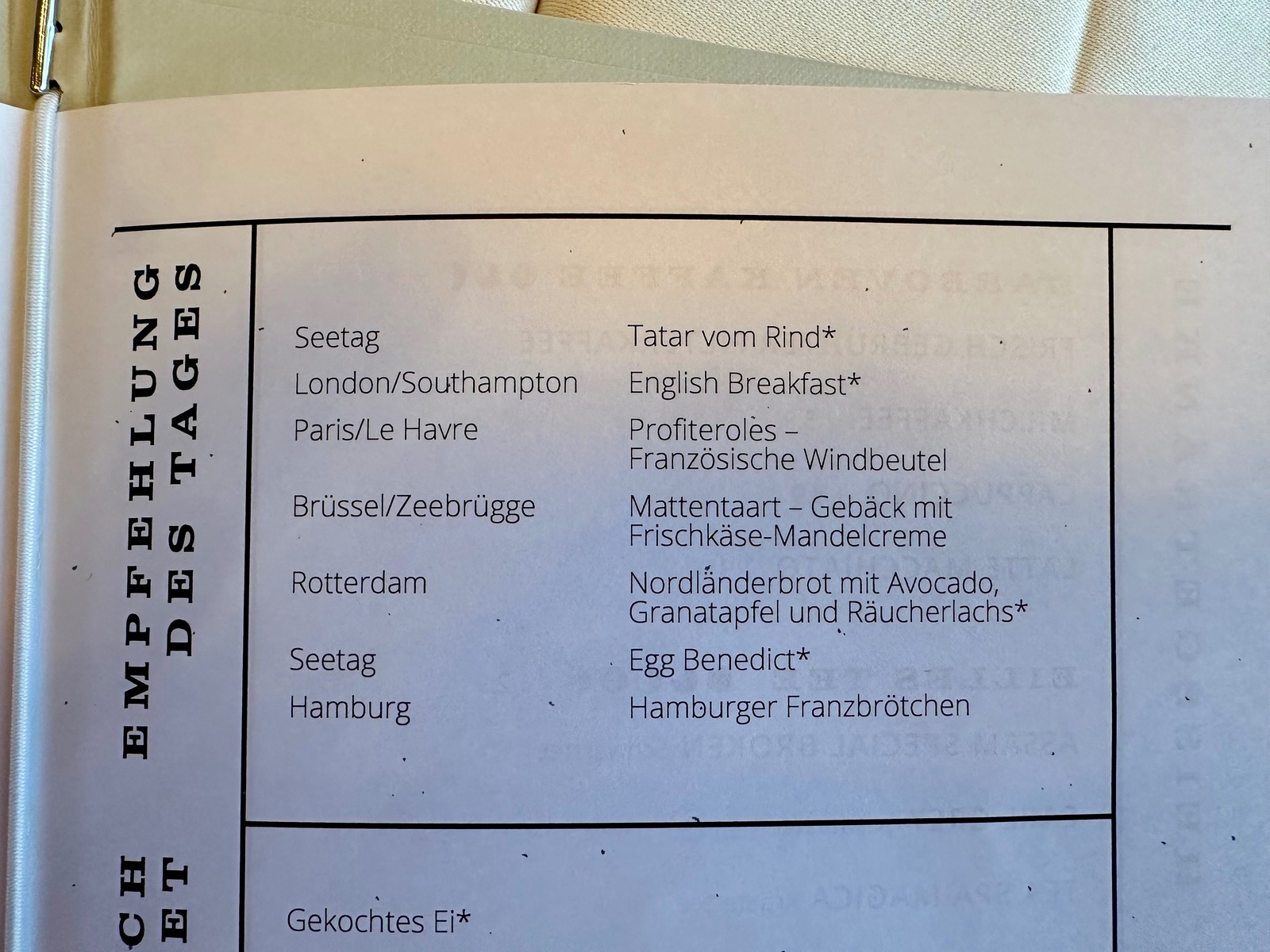 Zumindest gleich am Anreisetag hätte ich im Juni an Bord der Nova noch die Möglichkeit gehabt, an manchen Tagen das Gourmet-Frühstück zu buchen. Ich hatte allerdings schon von zu Hause aus gebucht, war nur aus Interesse, dass ich nachgesehen hatte.