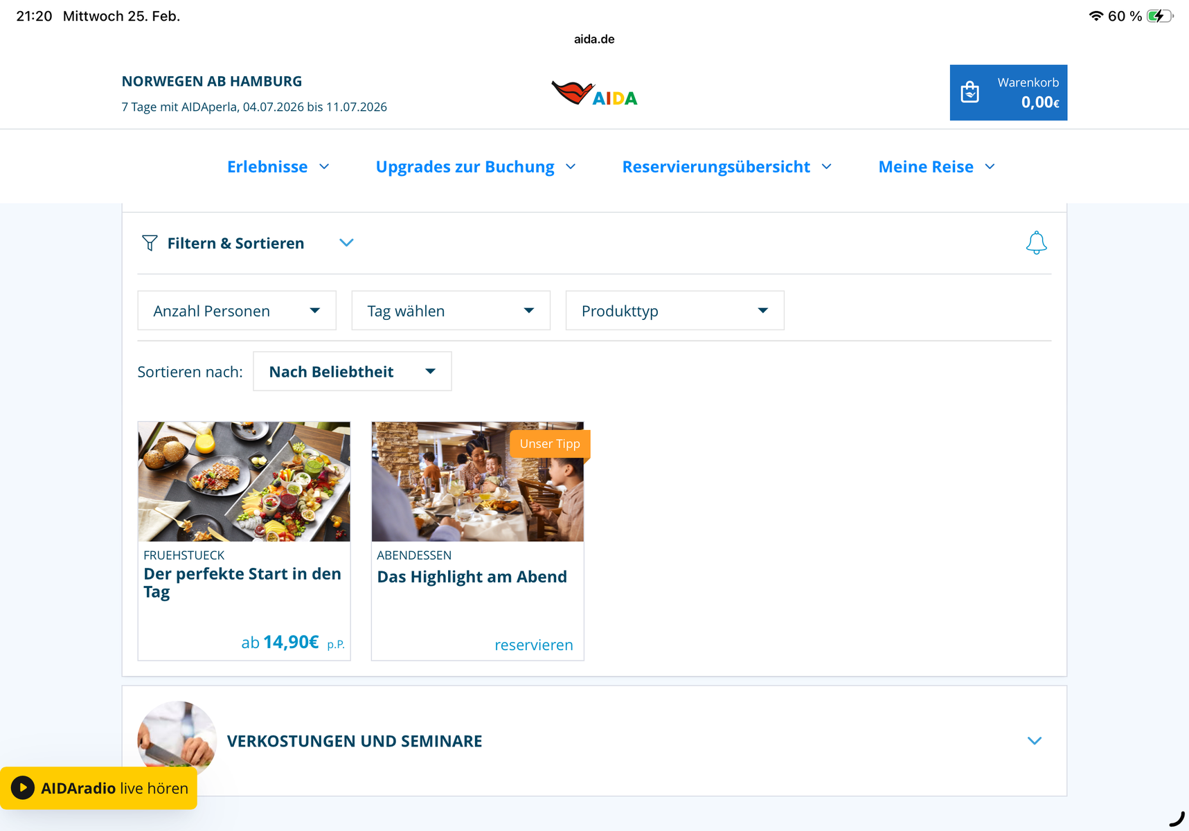 Wir haben heute eine Email bekommen und das Gourmet Frühstück zumindest auf der Perla ist nun unter Tischreservierungen und dann „Der perfekte Start in den Tag“ zu finden. Unter „Highlight am Abend“ finden sich nun die Restaurantangebote.