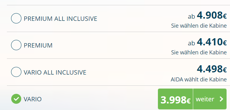 Und bei den Buchungsmöglichkeiten gibt es "Premium" und "Premium All Inclusive", wobei bei letzterem das Getränkepaket "AIDA Comfort Deluxe" inkludiert ist, das bei "Premium" nur mit Aufpreis dazu gebucht werden kann. Ist dieser Aufpreis niedriger, als wenn man das Paket "normal" dazu bucht?