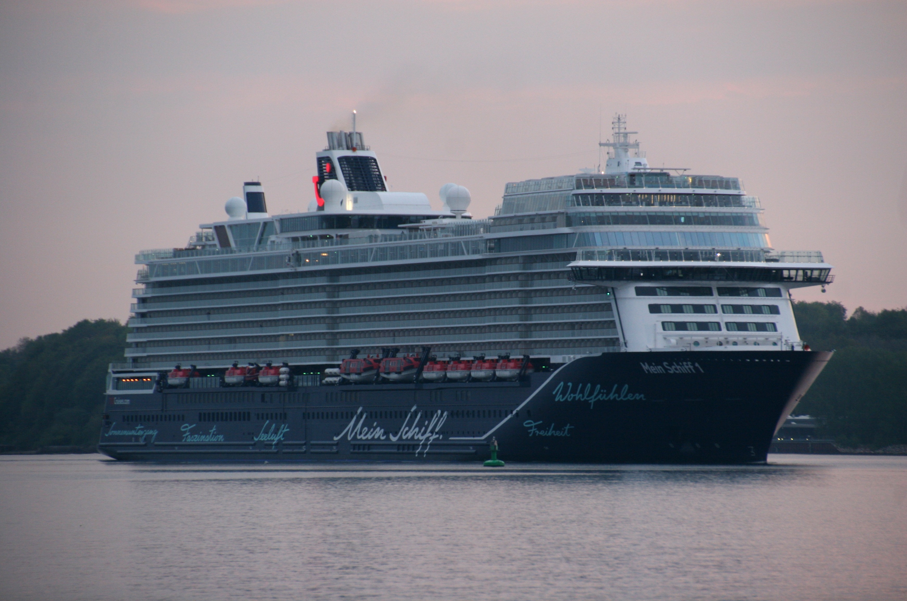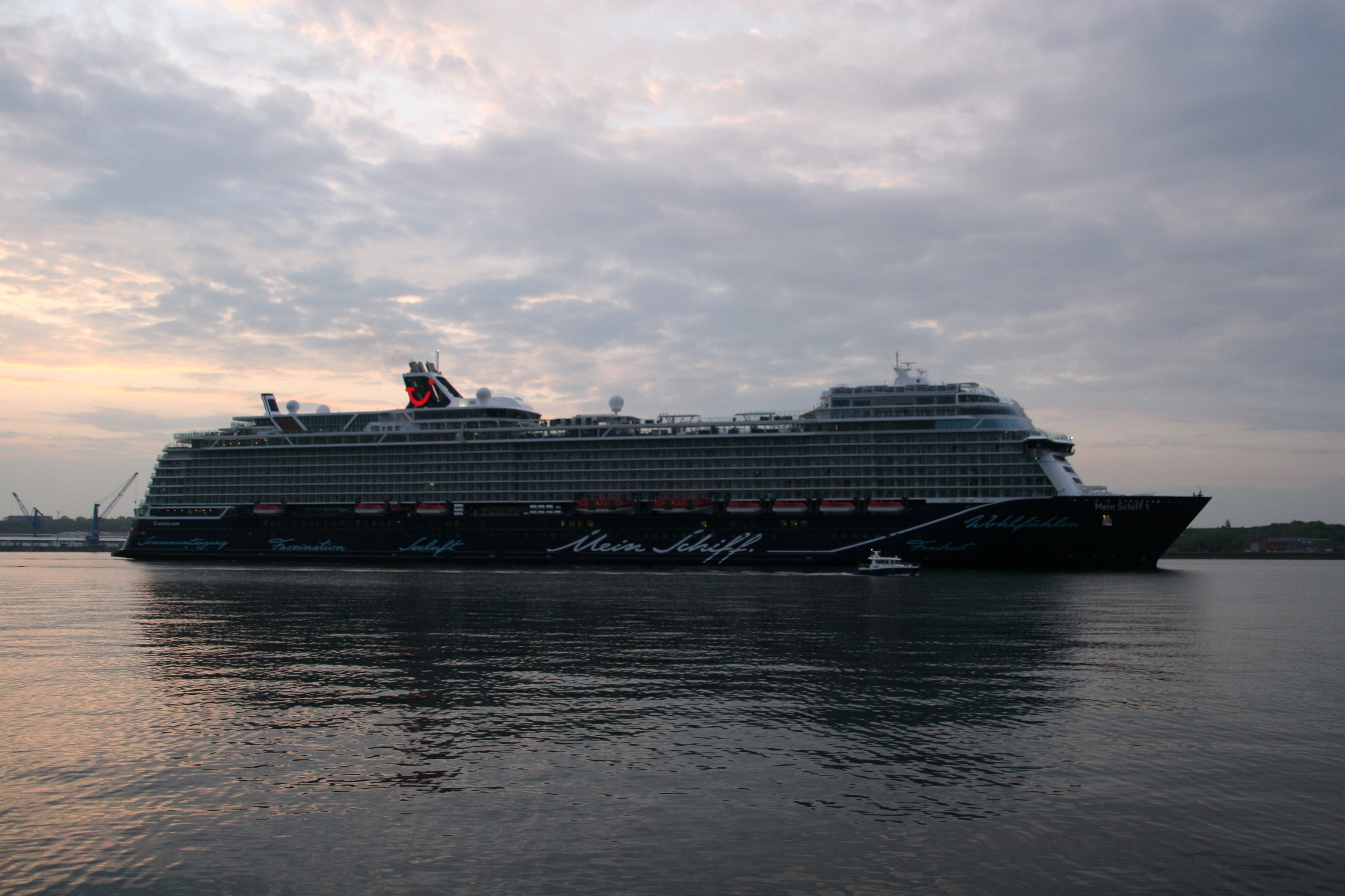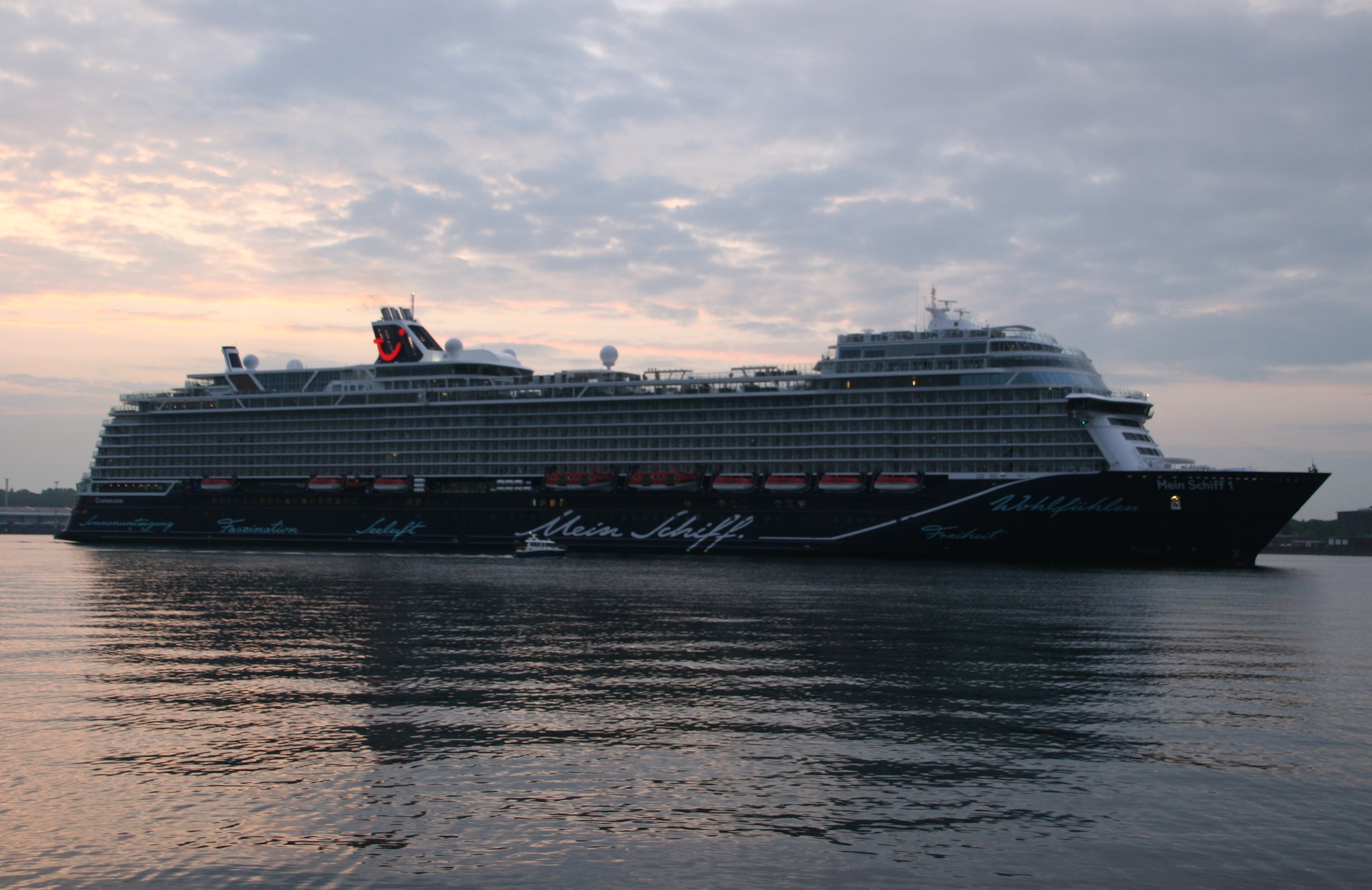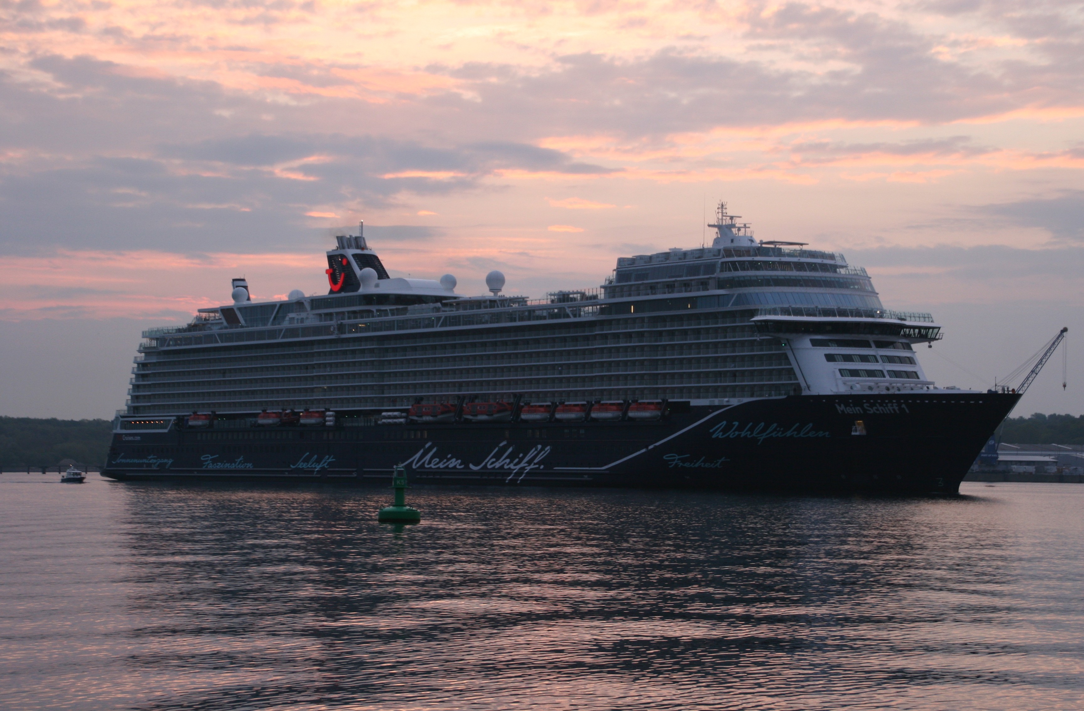 Die Mein Schiff 1 kommt am 10.05. um 05:39h zu ihrer ersten Revierfahrt in der Saison 2019 auf der "Kieler Förde" um die "Ecke"