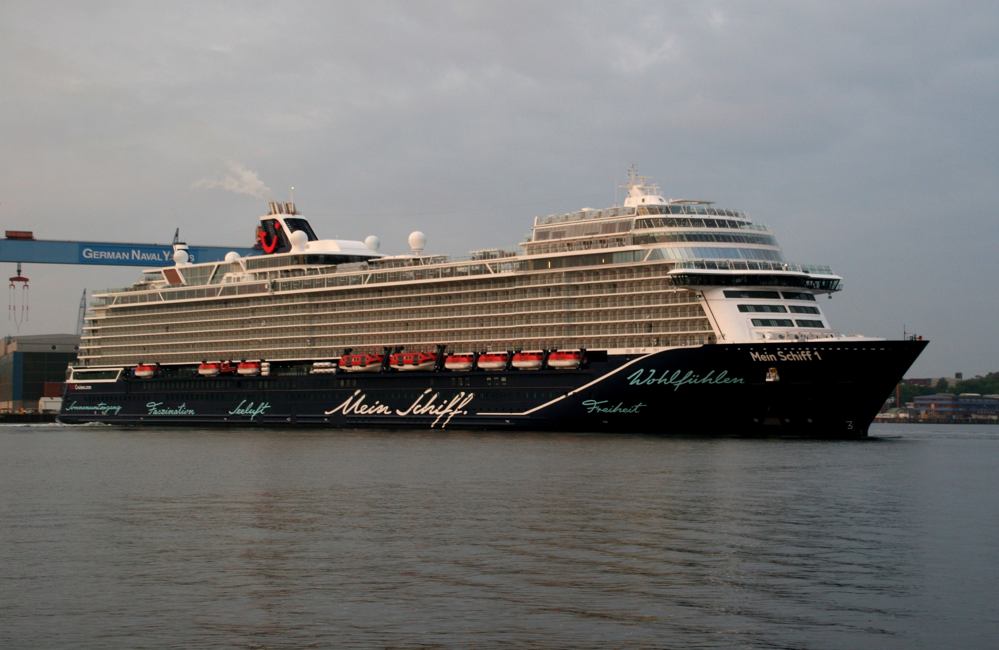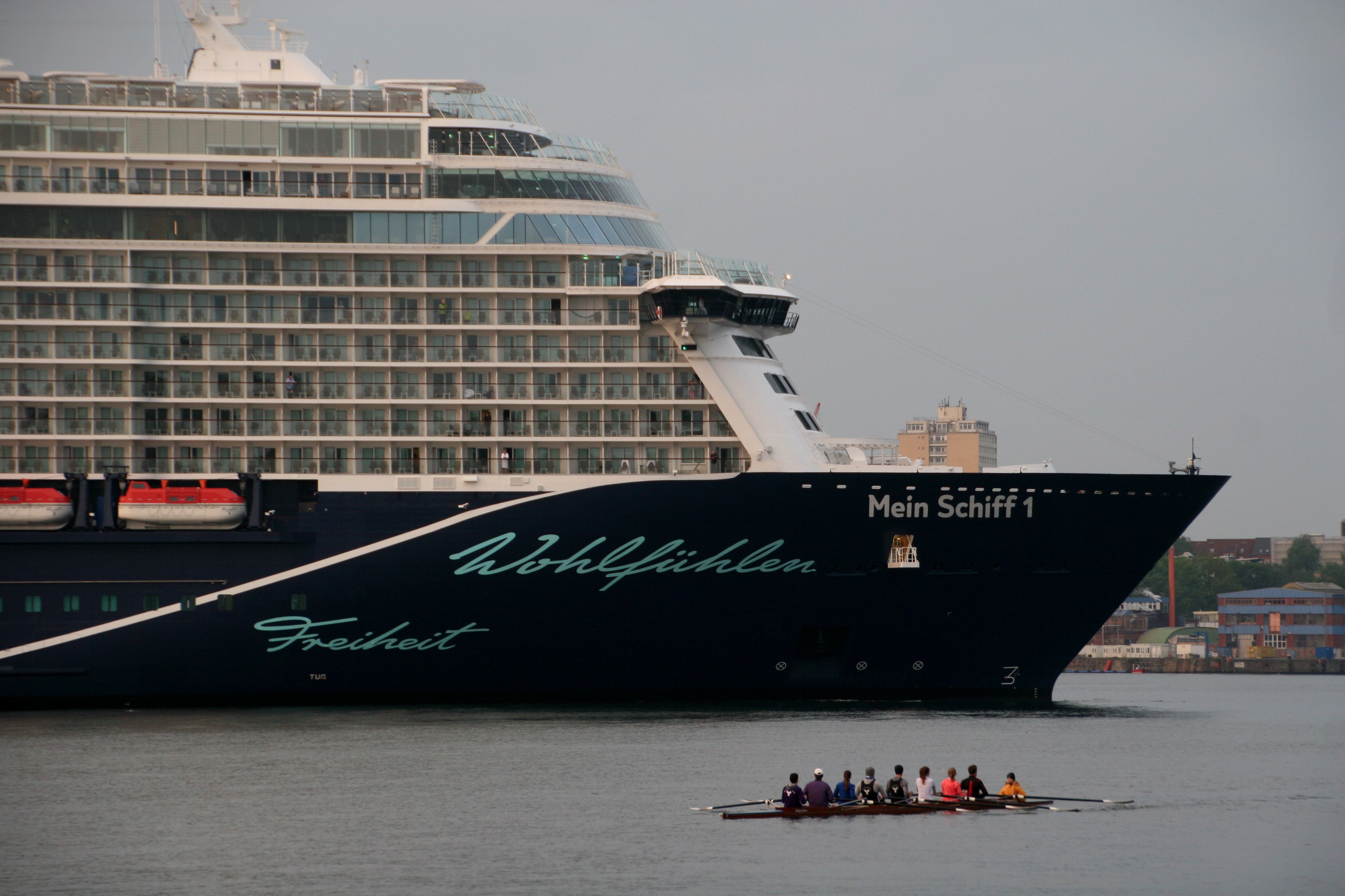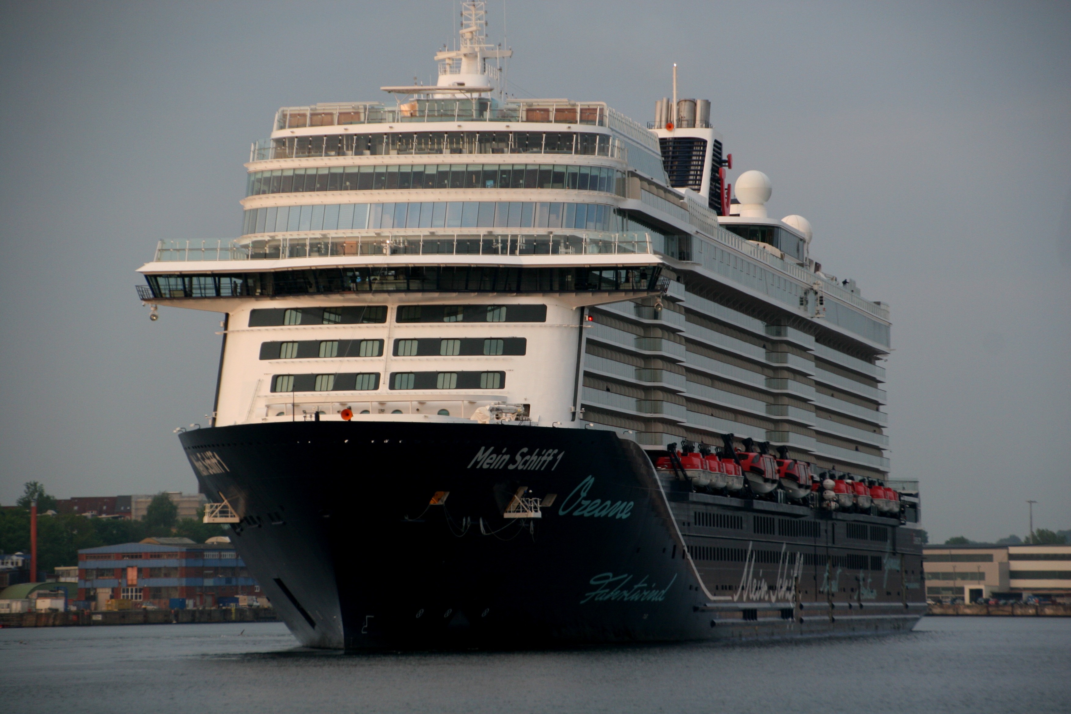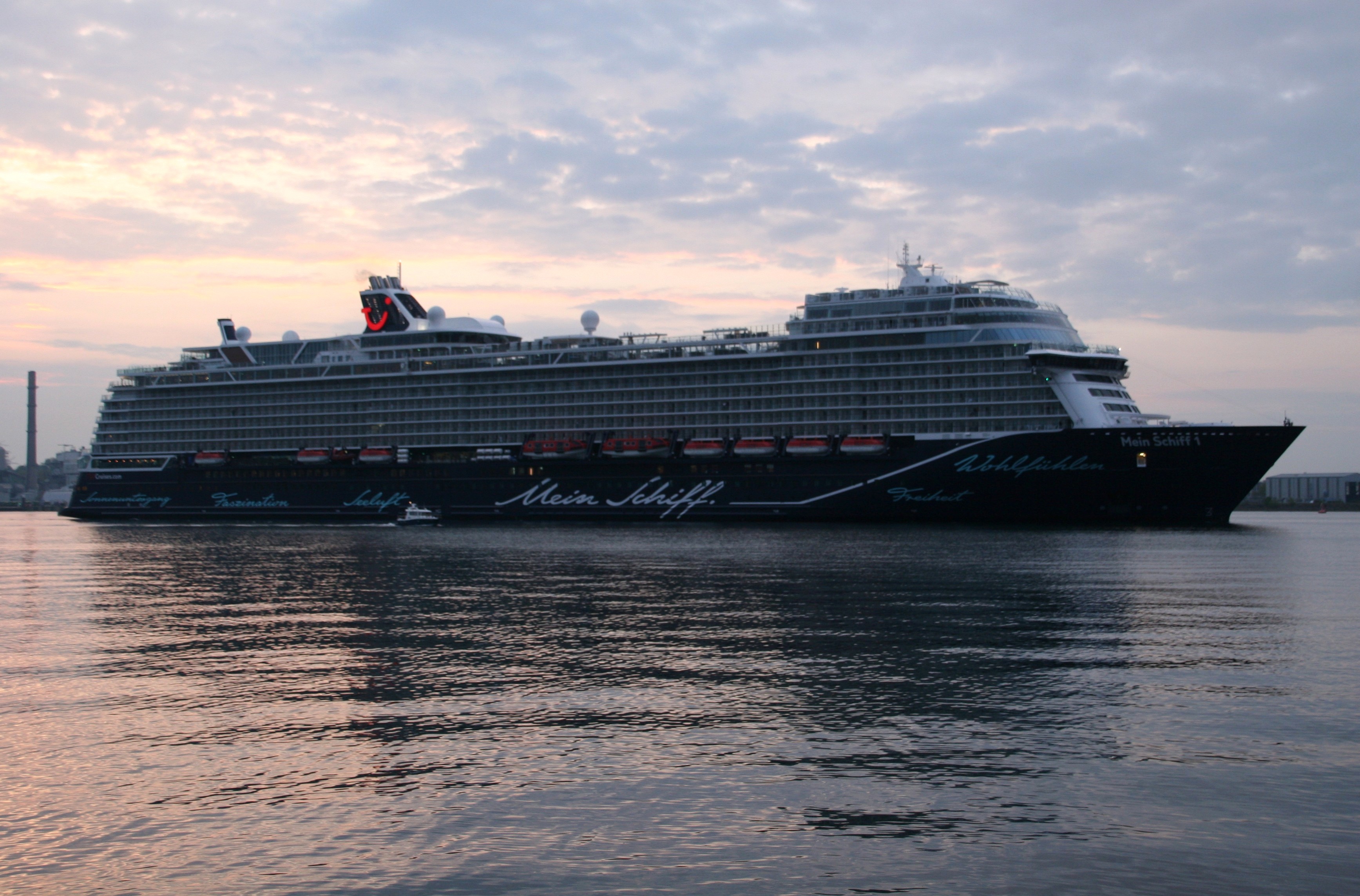 Die Mein Schiff 1 kommt am 10.05. um 05:39h zu ihrer ersten Revierfahrt in der Saison 2019 auf der "Kieler Förde" um die "Ecke"