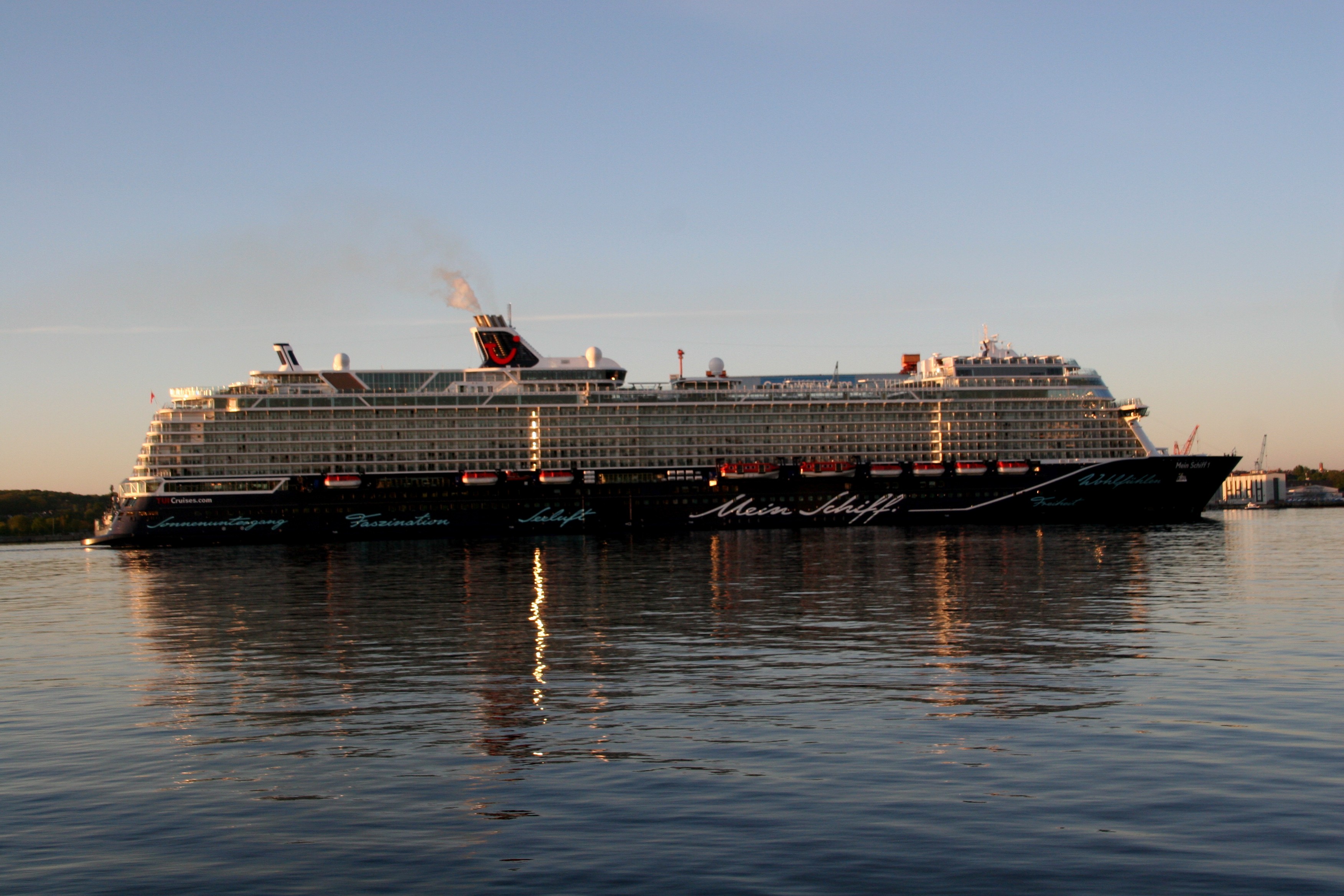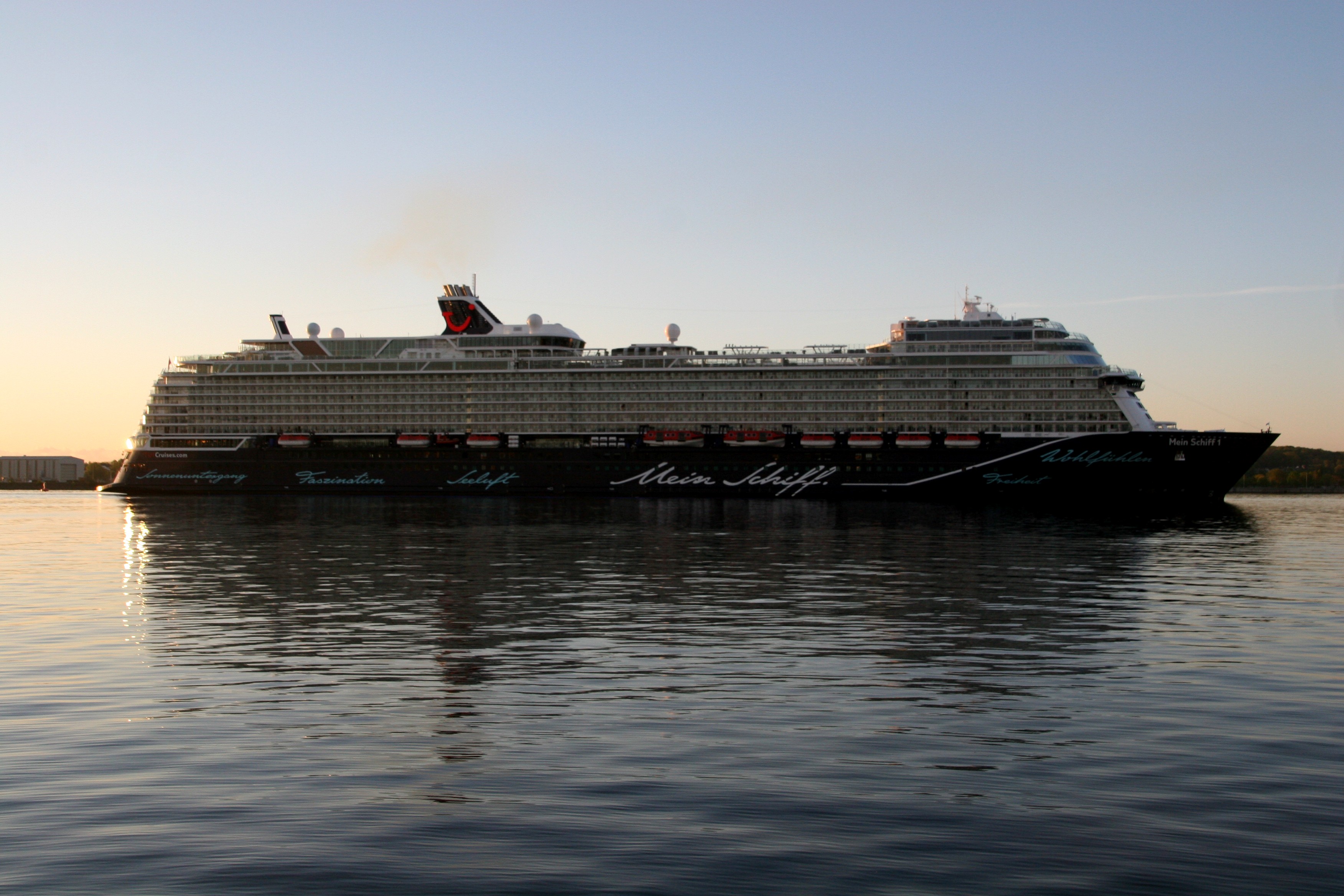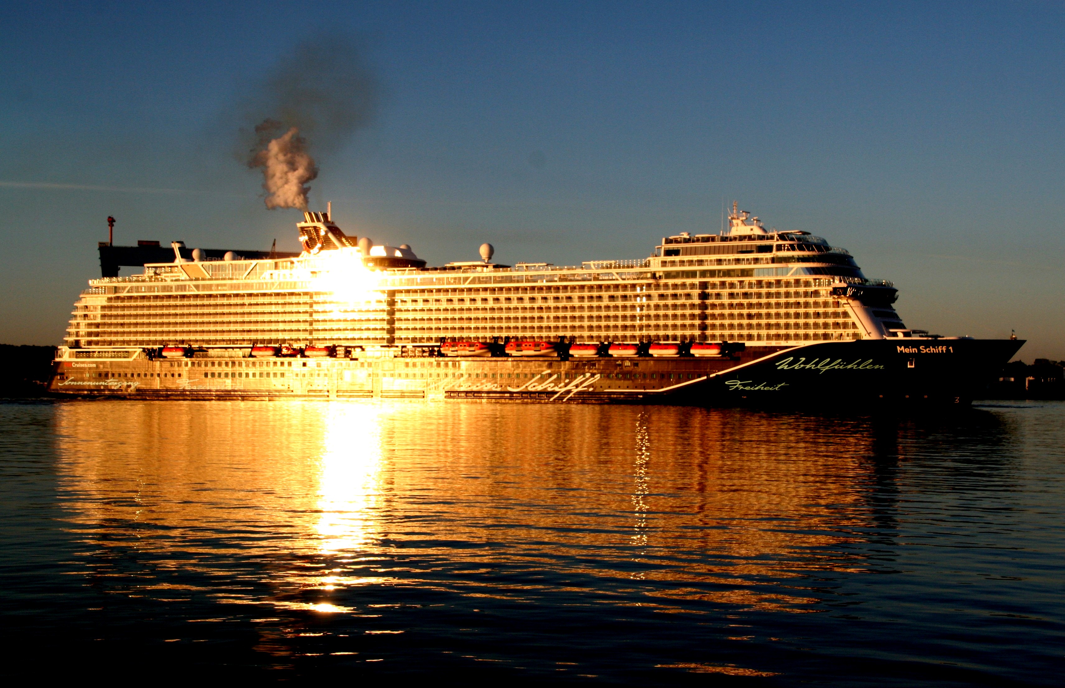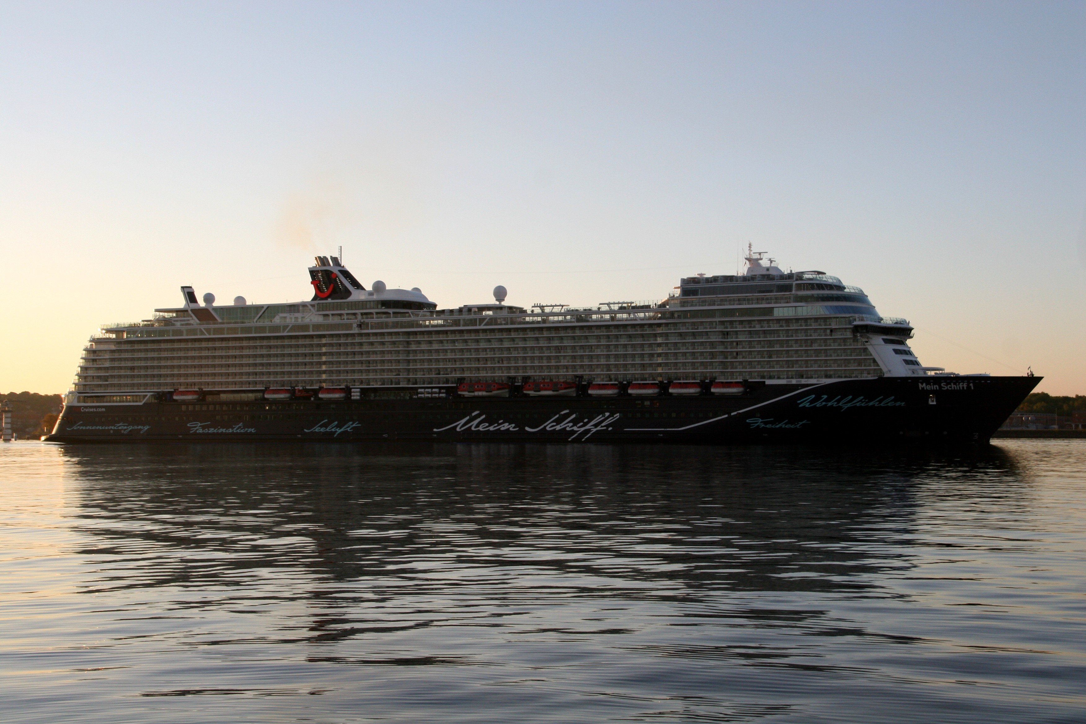 Die "Mein Schiff 1" um 06:01h im morgendlichen Lichterglanz der aufgehenden Sonne auf der "Kieler Förde"