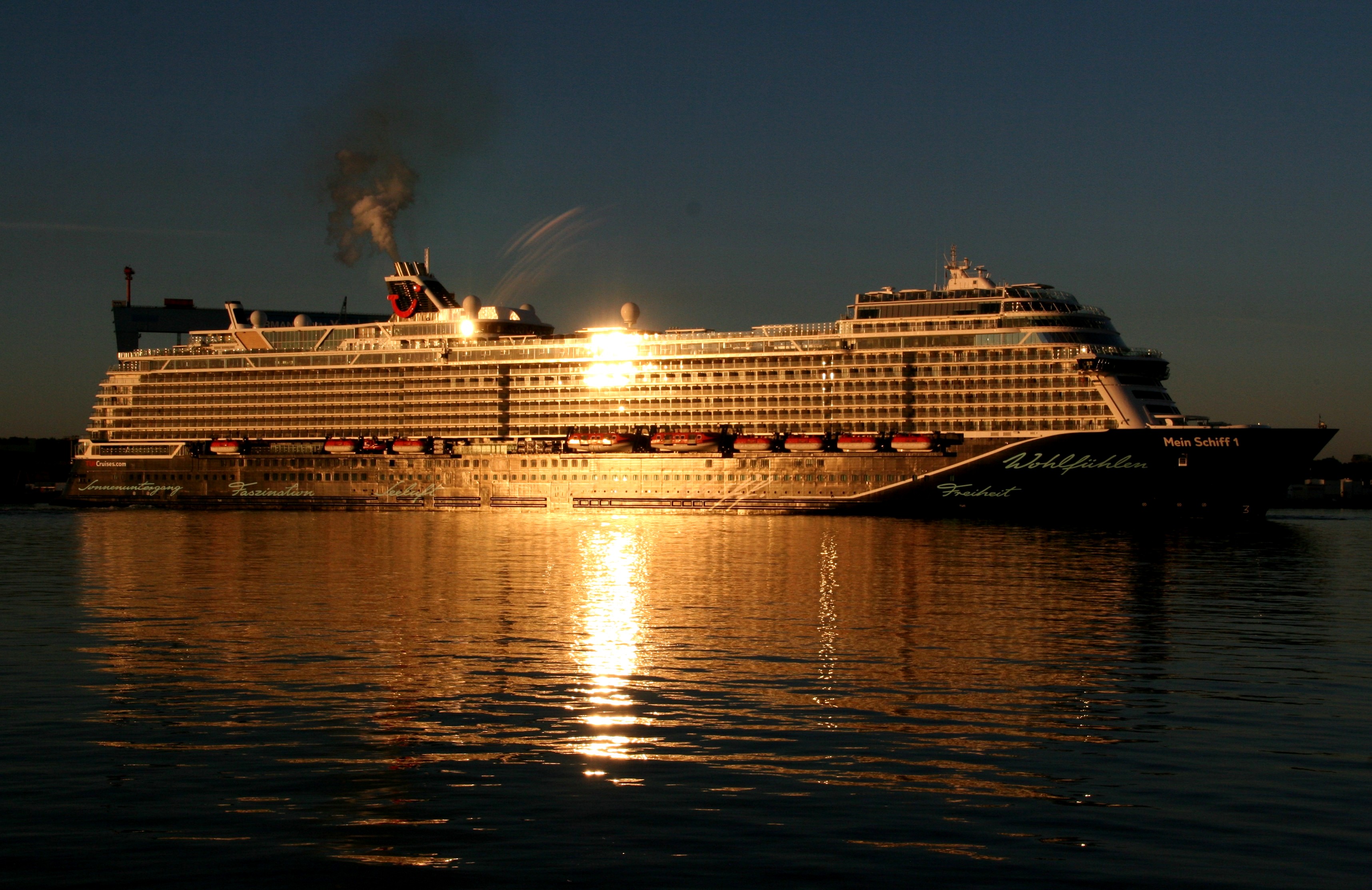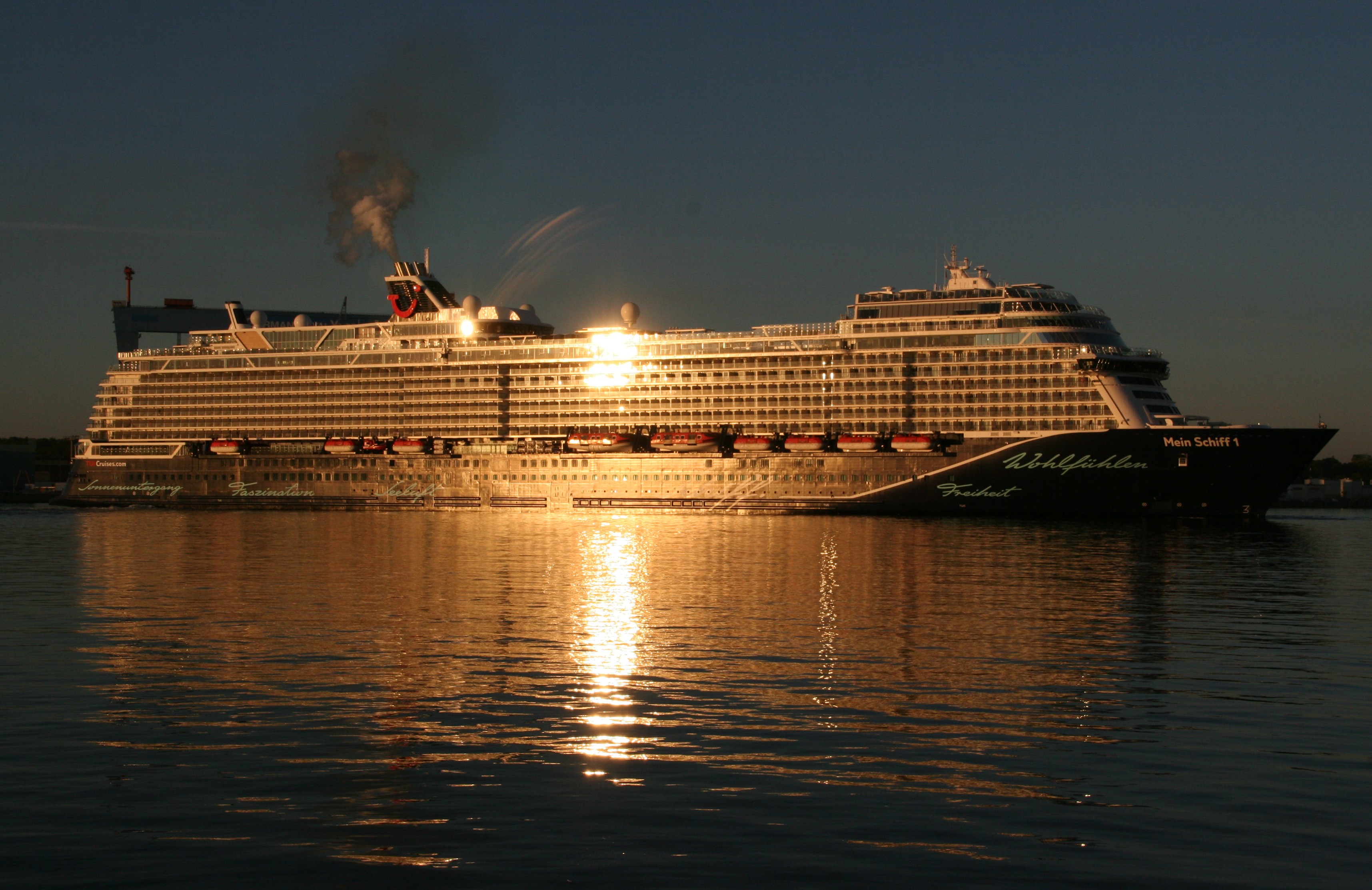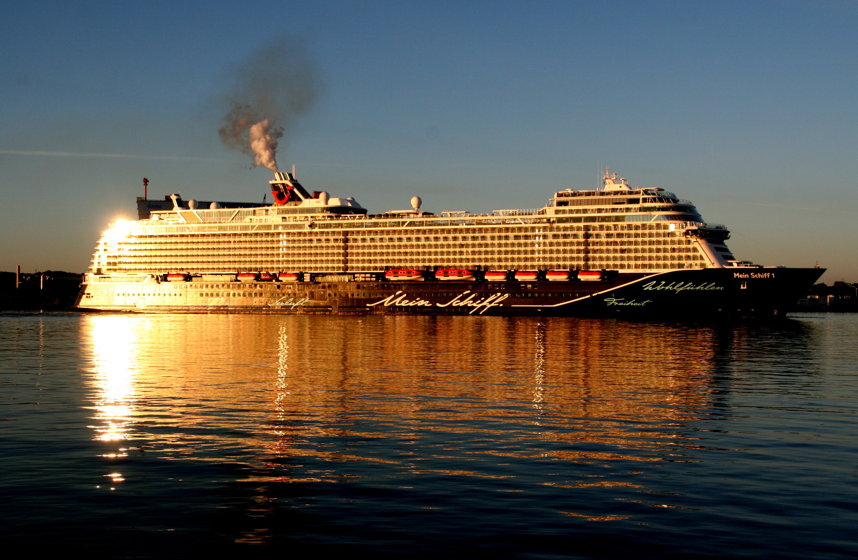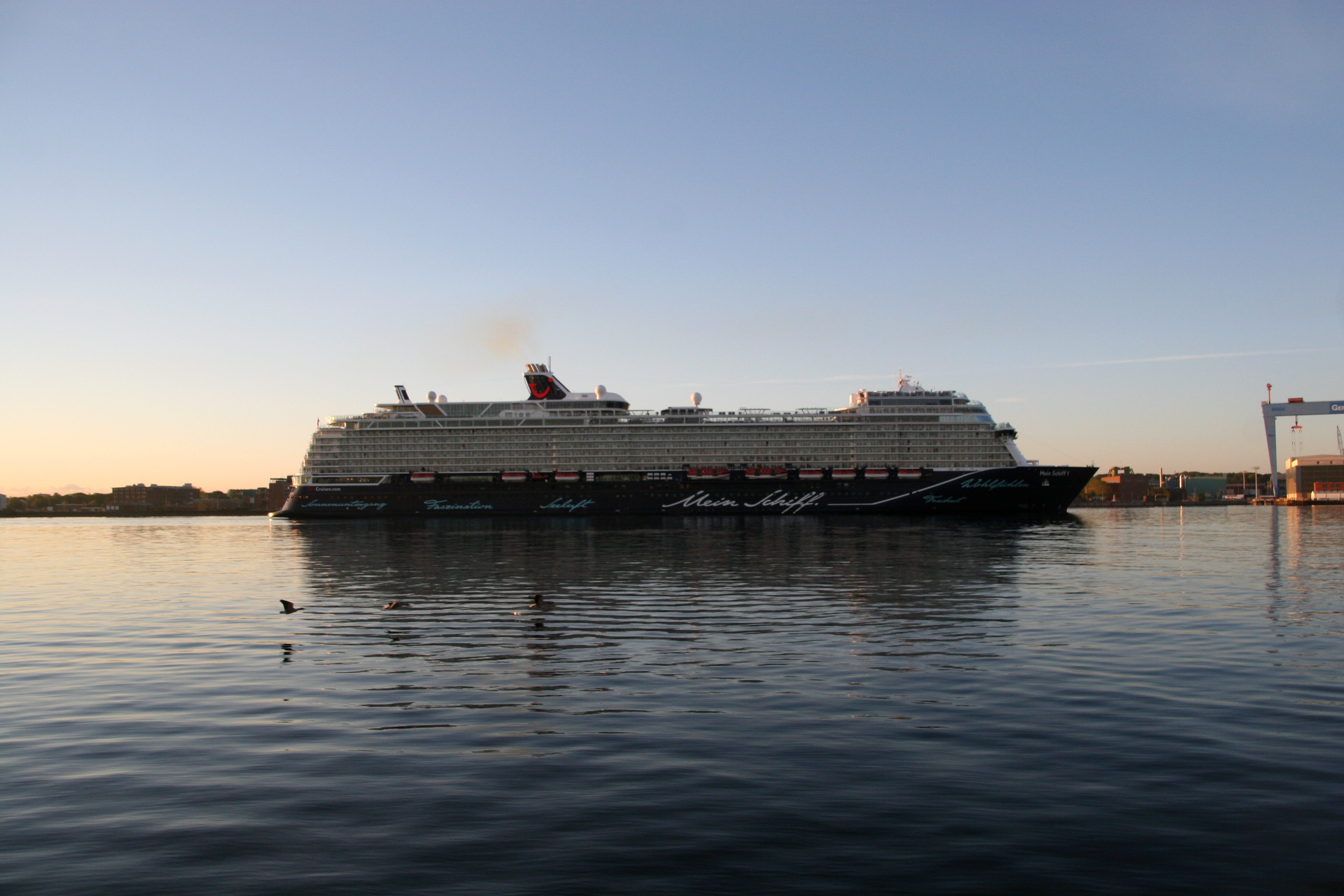 Die "Mein Schiff 1" um 06:01h im morgendlichen Lichterglanz der aufgehenden Sonne auf der "Kieler Förde"