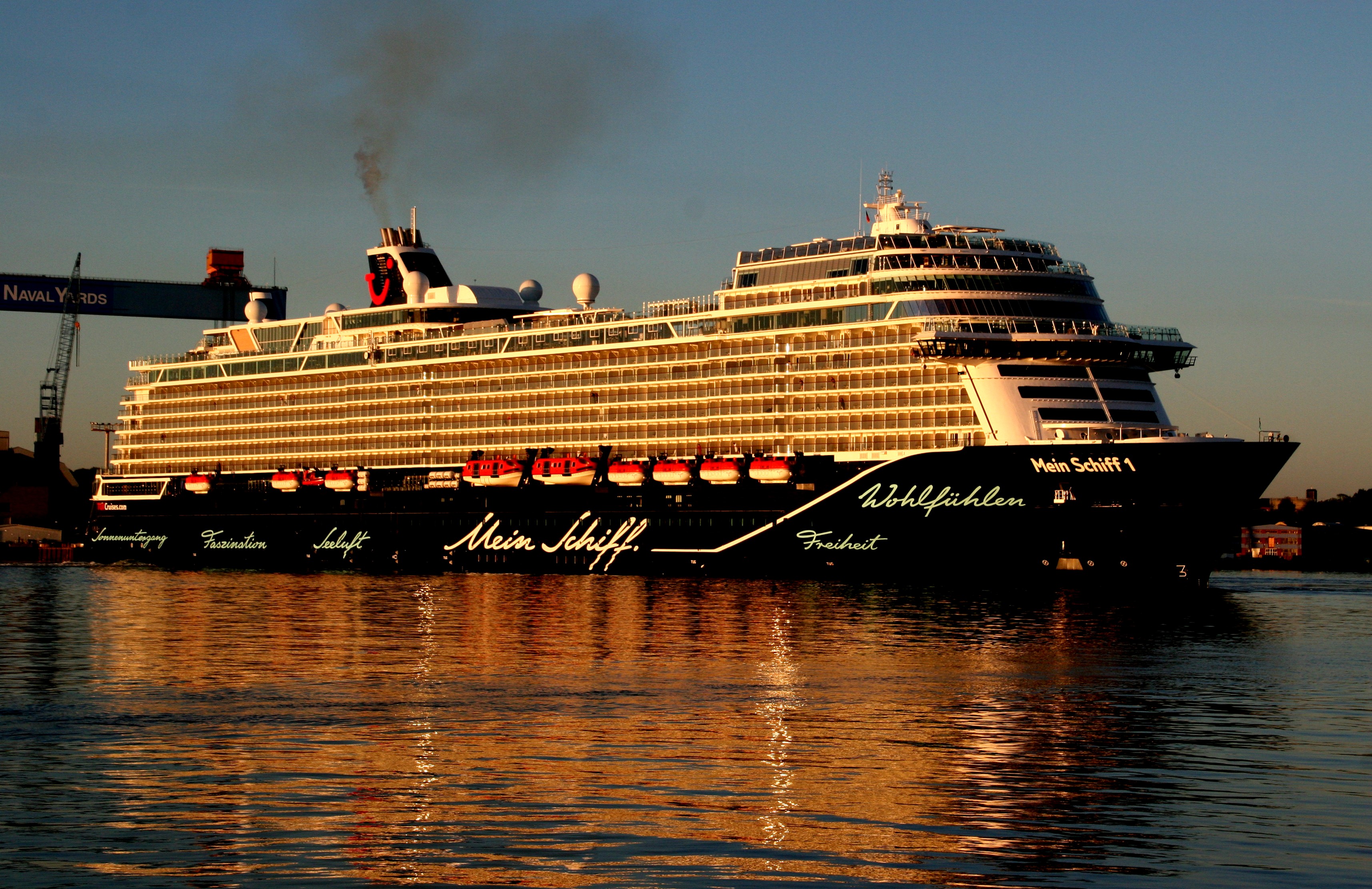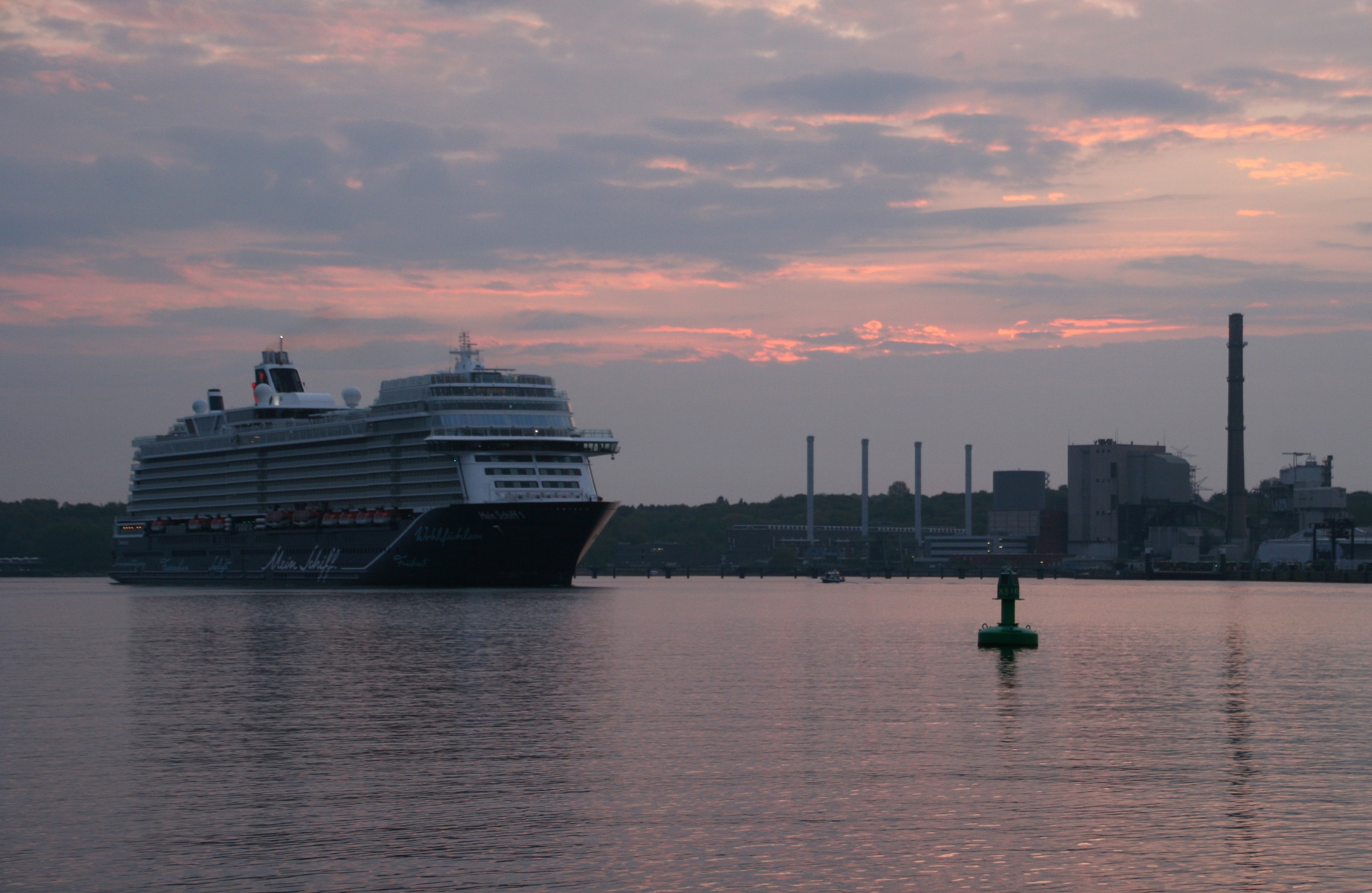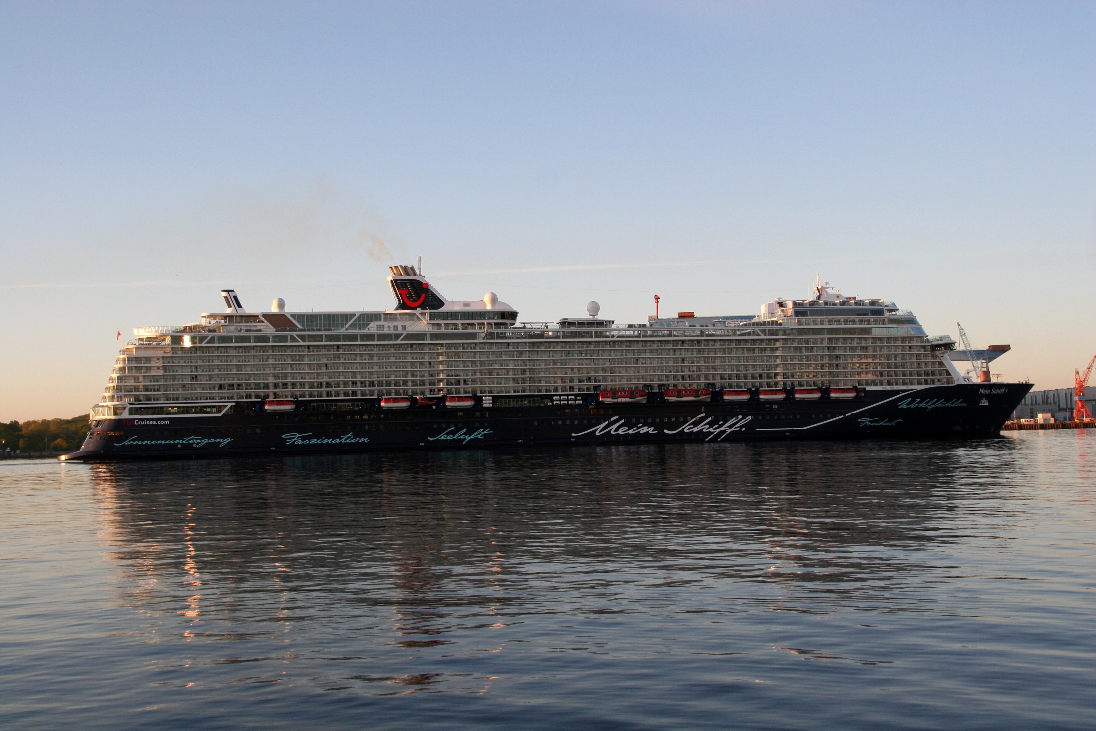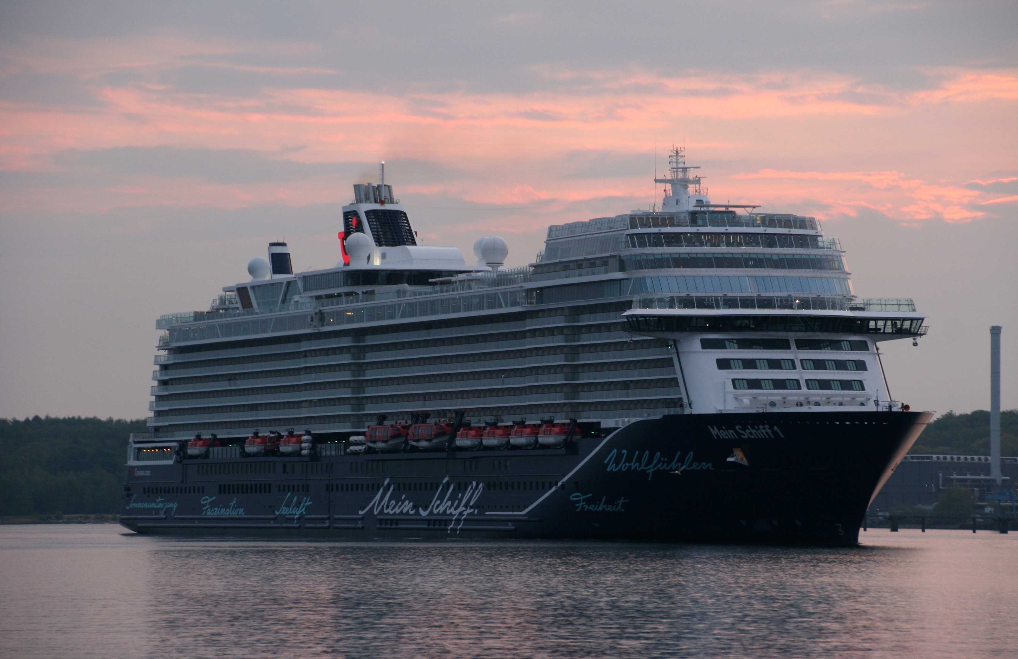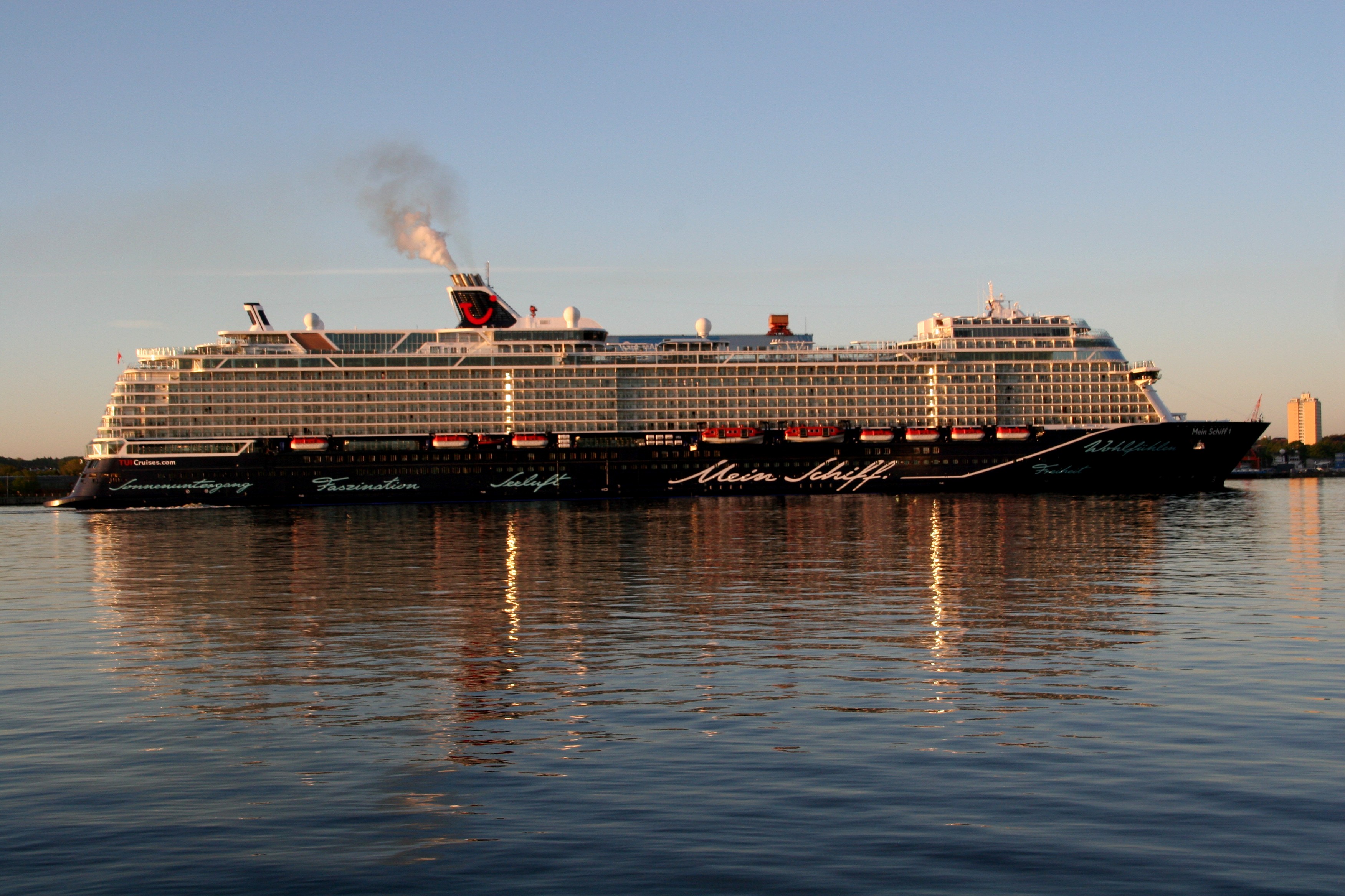 Die "Mein Schiff 1" um 06:01h im morgendlichen Lichterglanz der aufgehenden Sonne auf der "Kieler Förde"