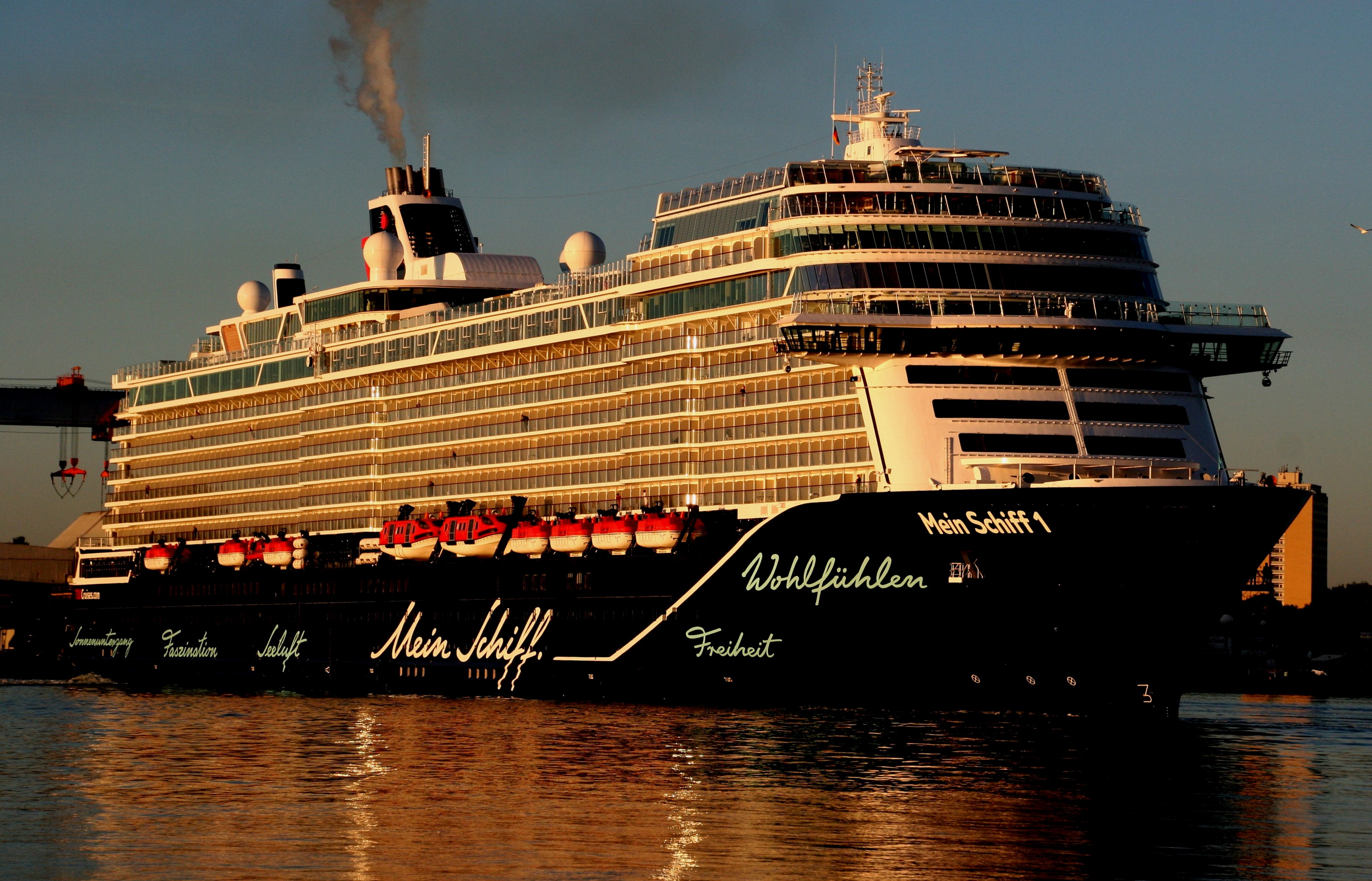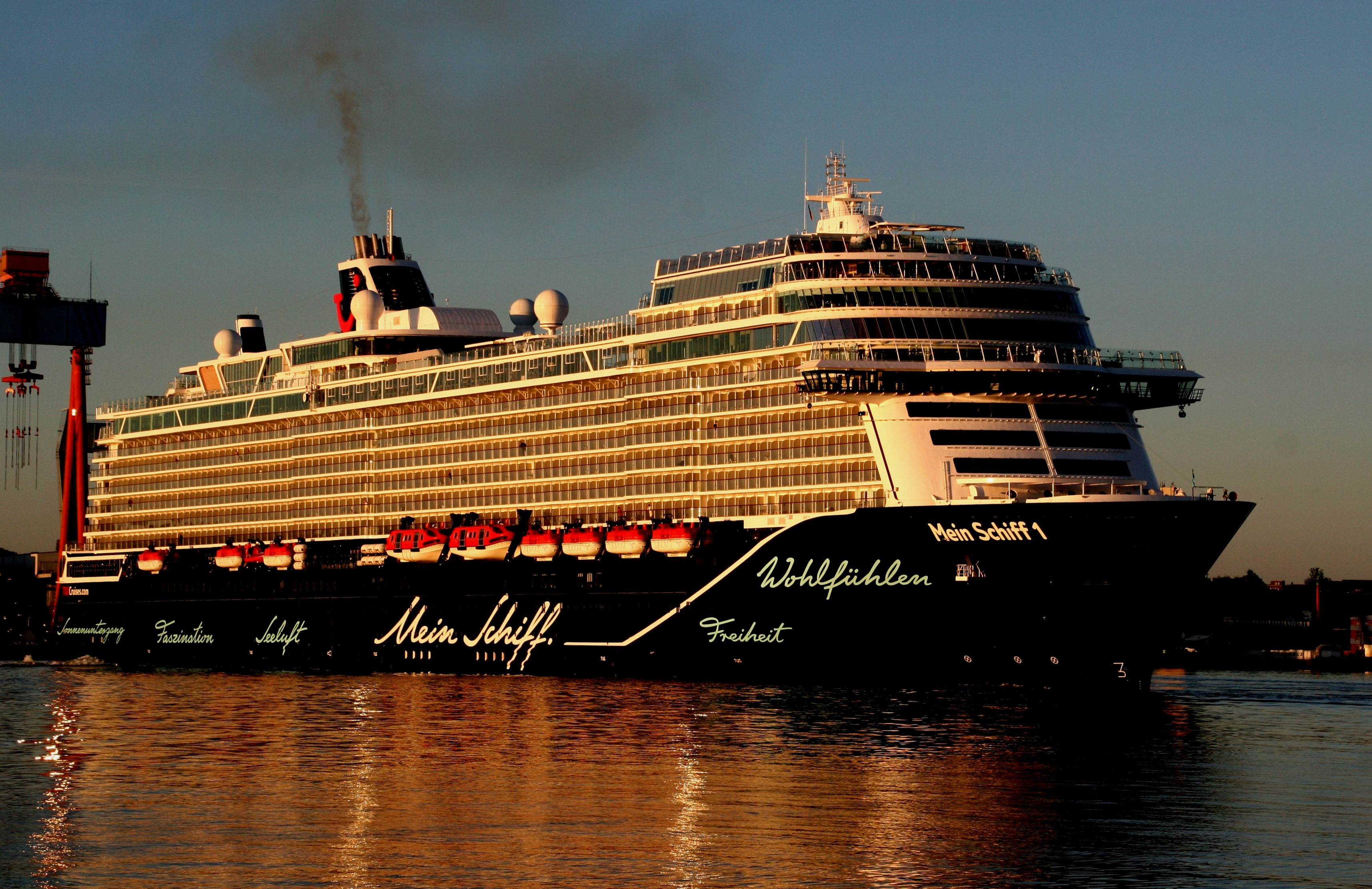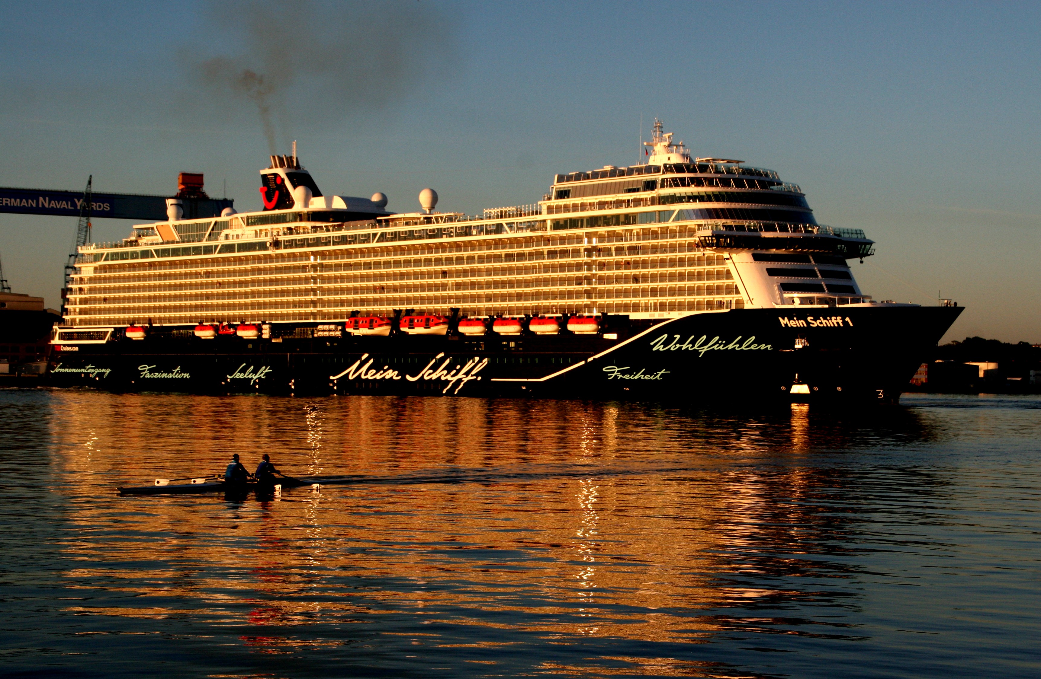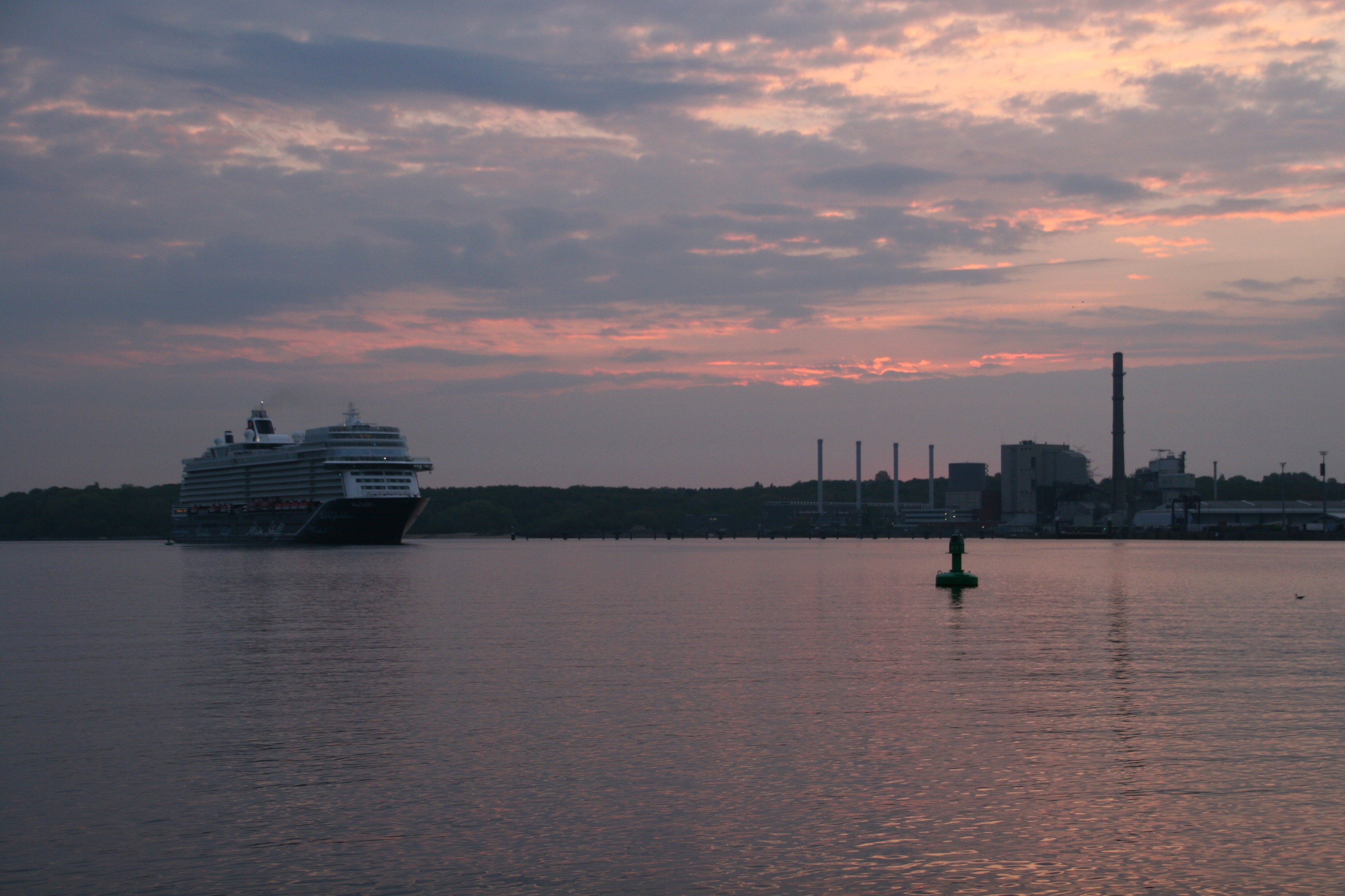 Die "Mein Schiff 1" um 06:01h im morgendlichen Lichterglanz der aufgehenden Sonne auf der "Kieler Förde"