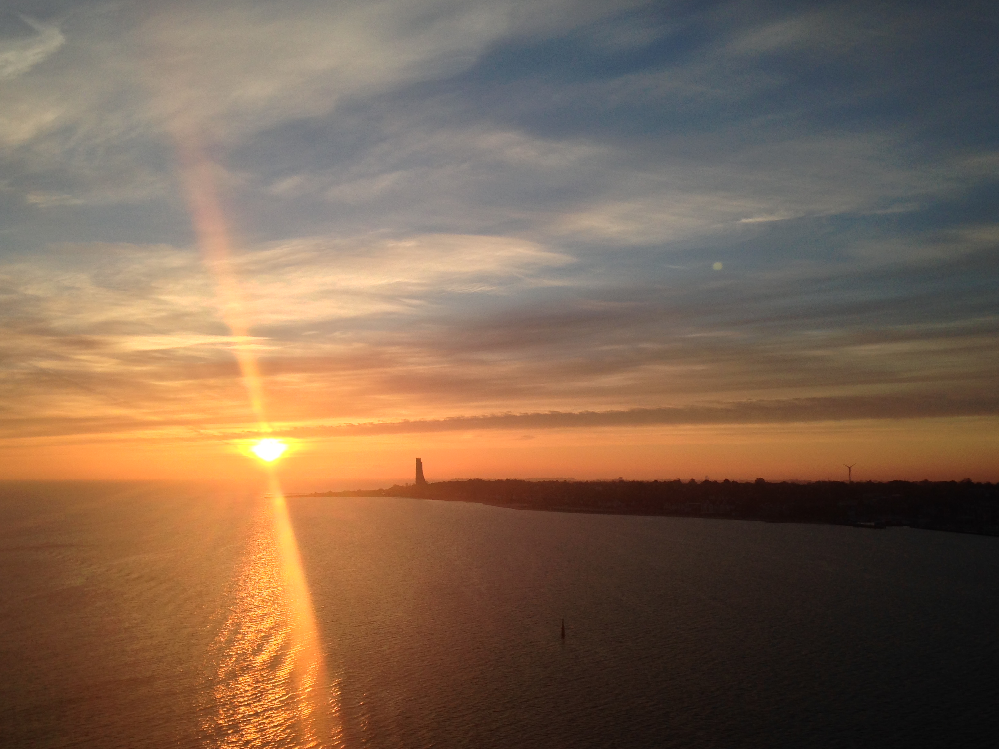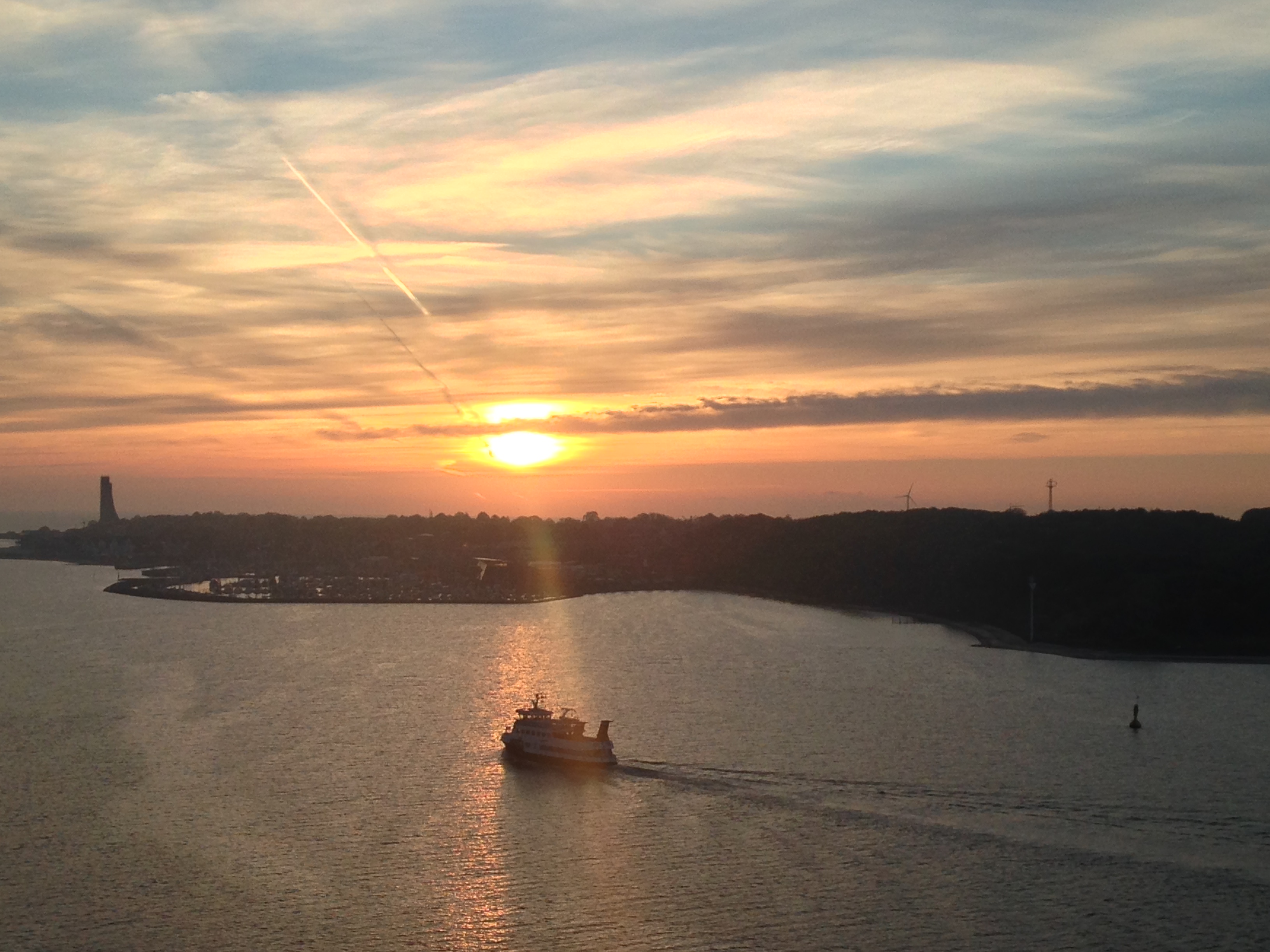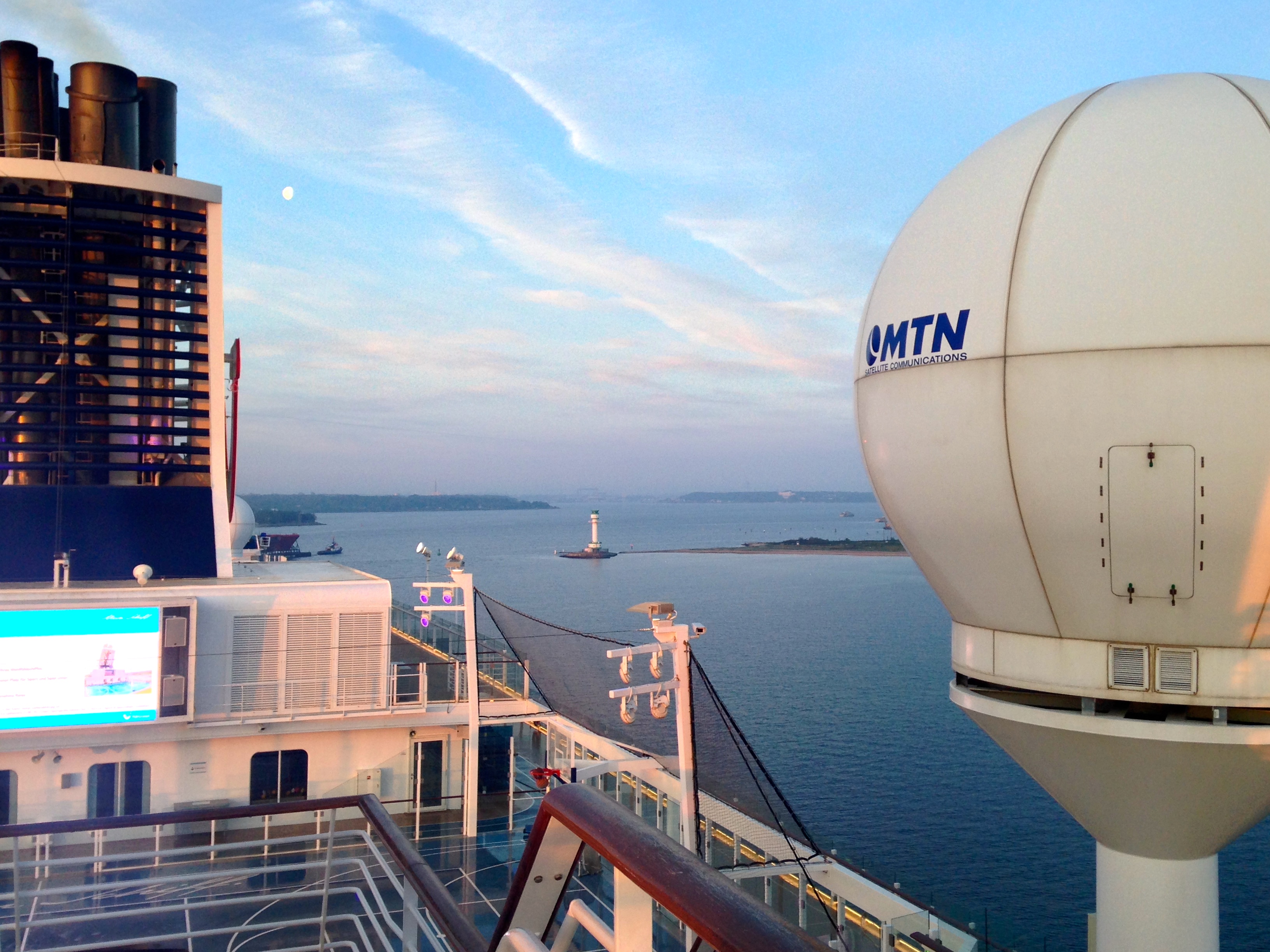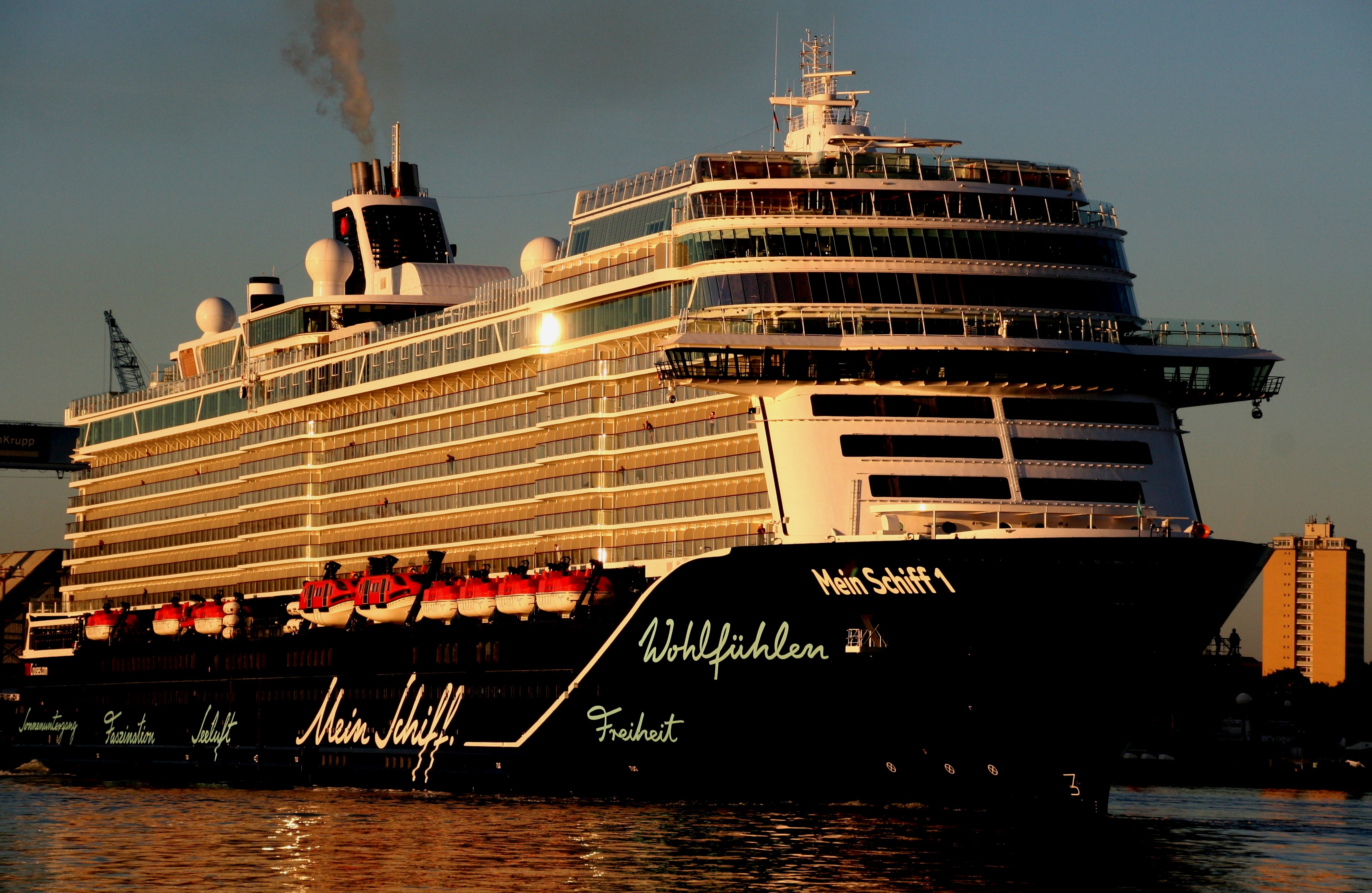 Die "Mein Schiff 1" um 06:01h im morgendlichen Lichterglanz der aufgehenden Sonne auf der "Kieler Förde"