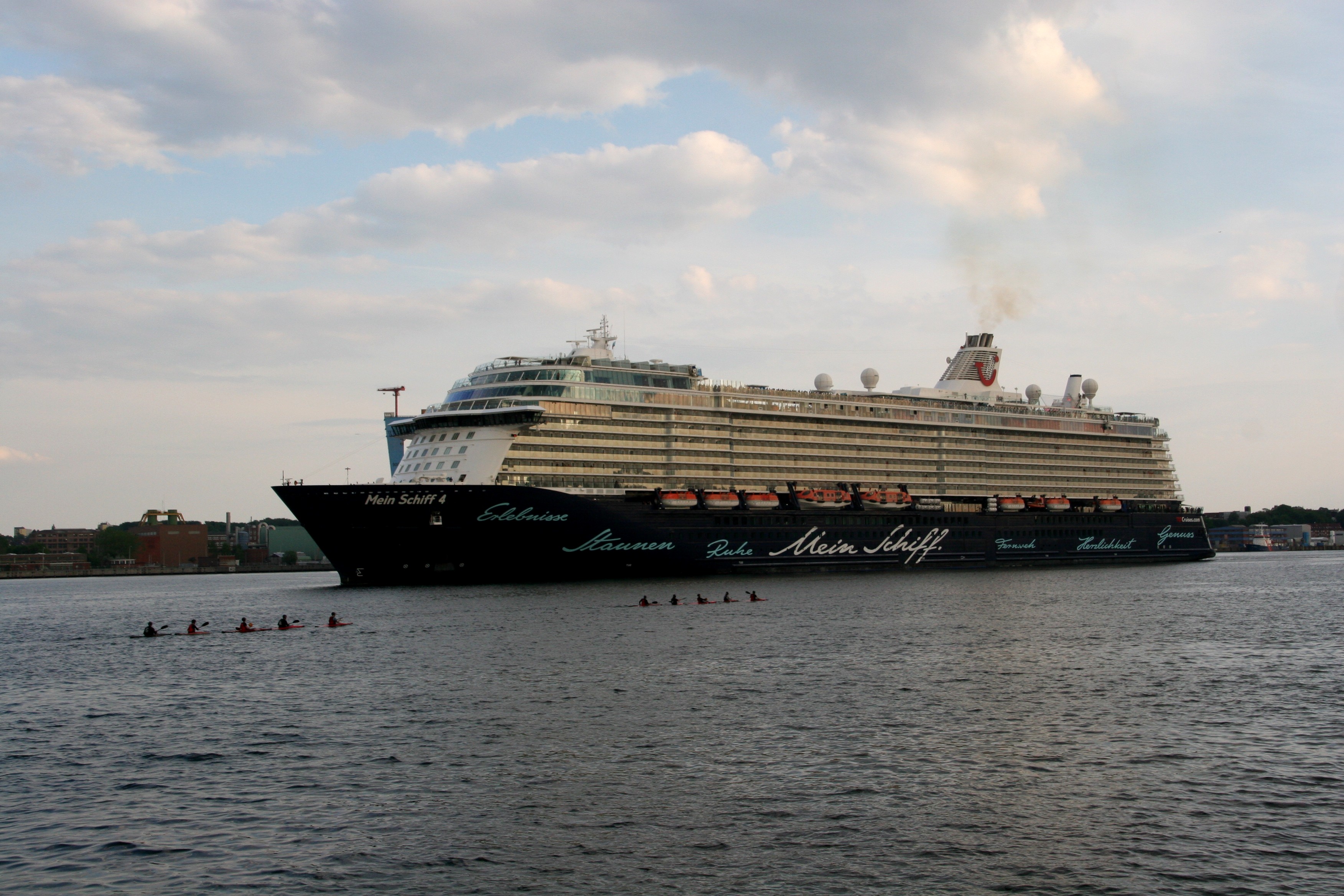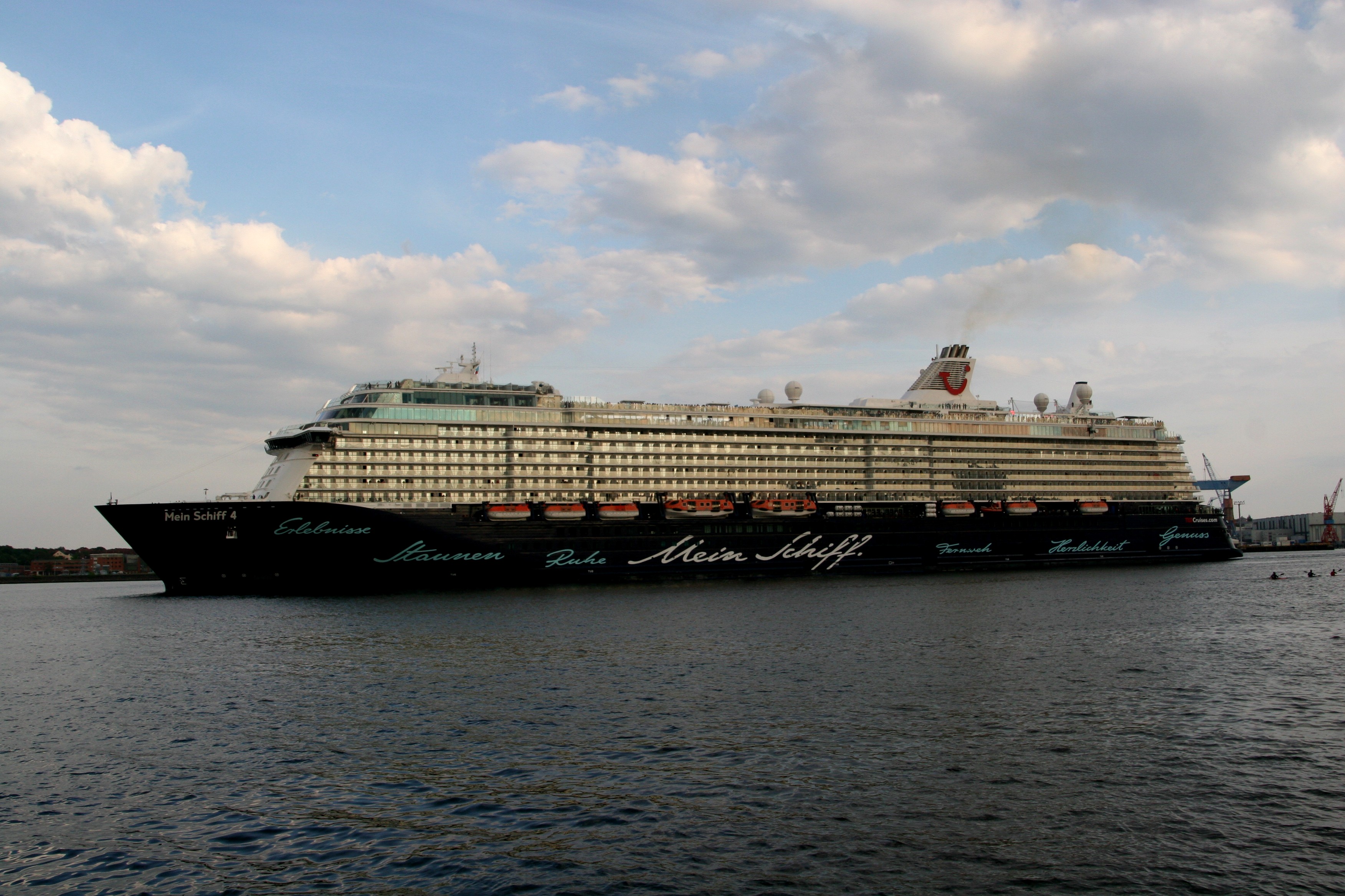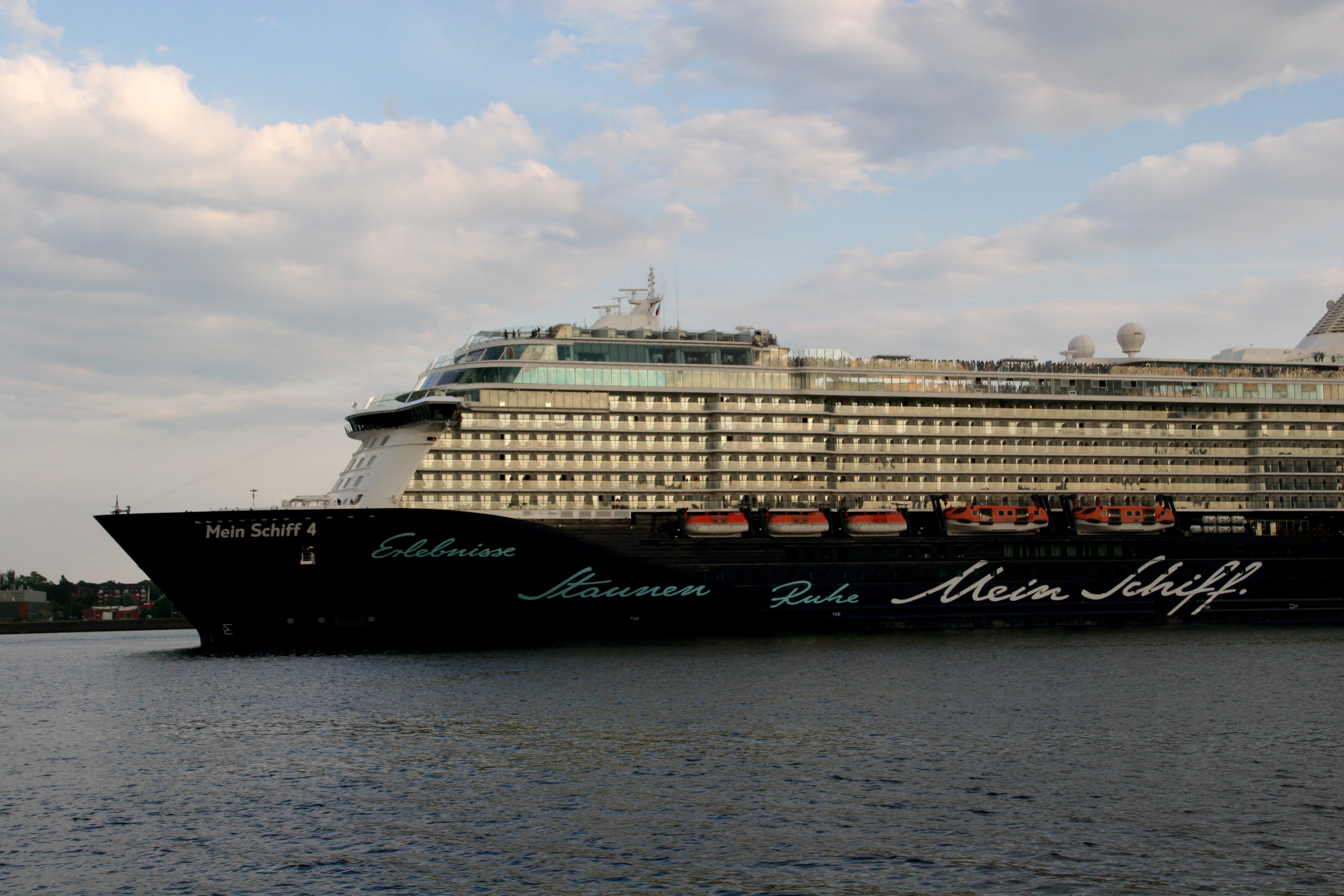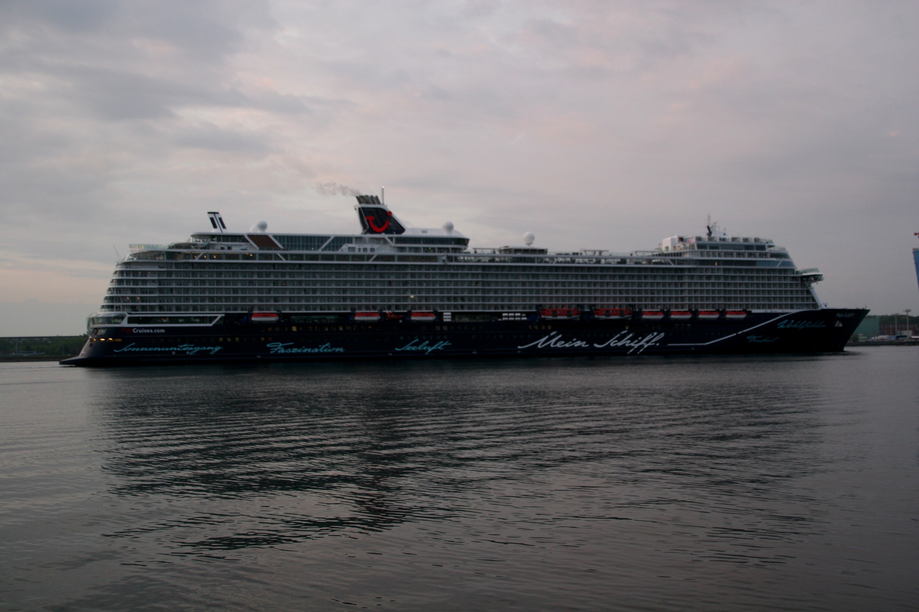 Die "Mein Schiff 4" fährt um 19:29h ihr Auslaufmanöver auf der "Kieler Förde"