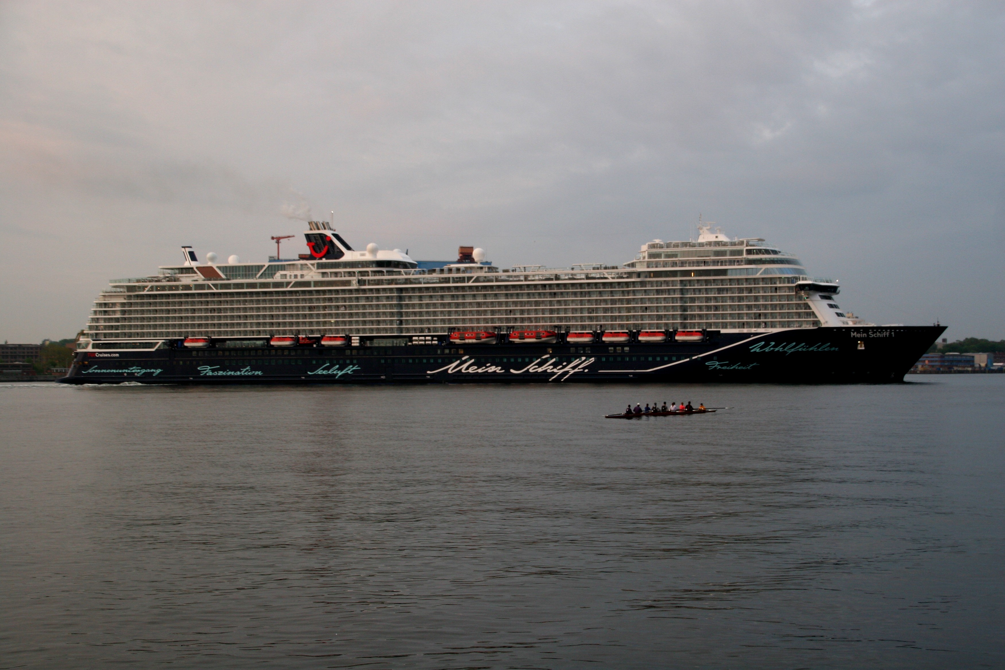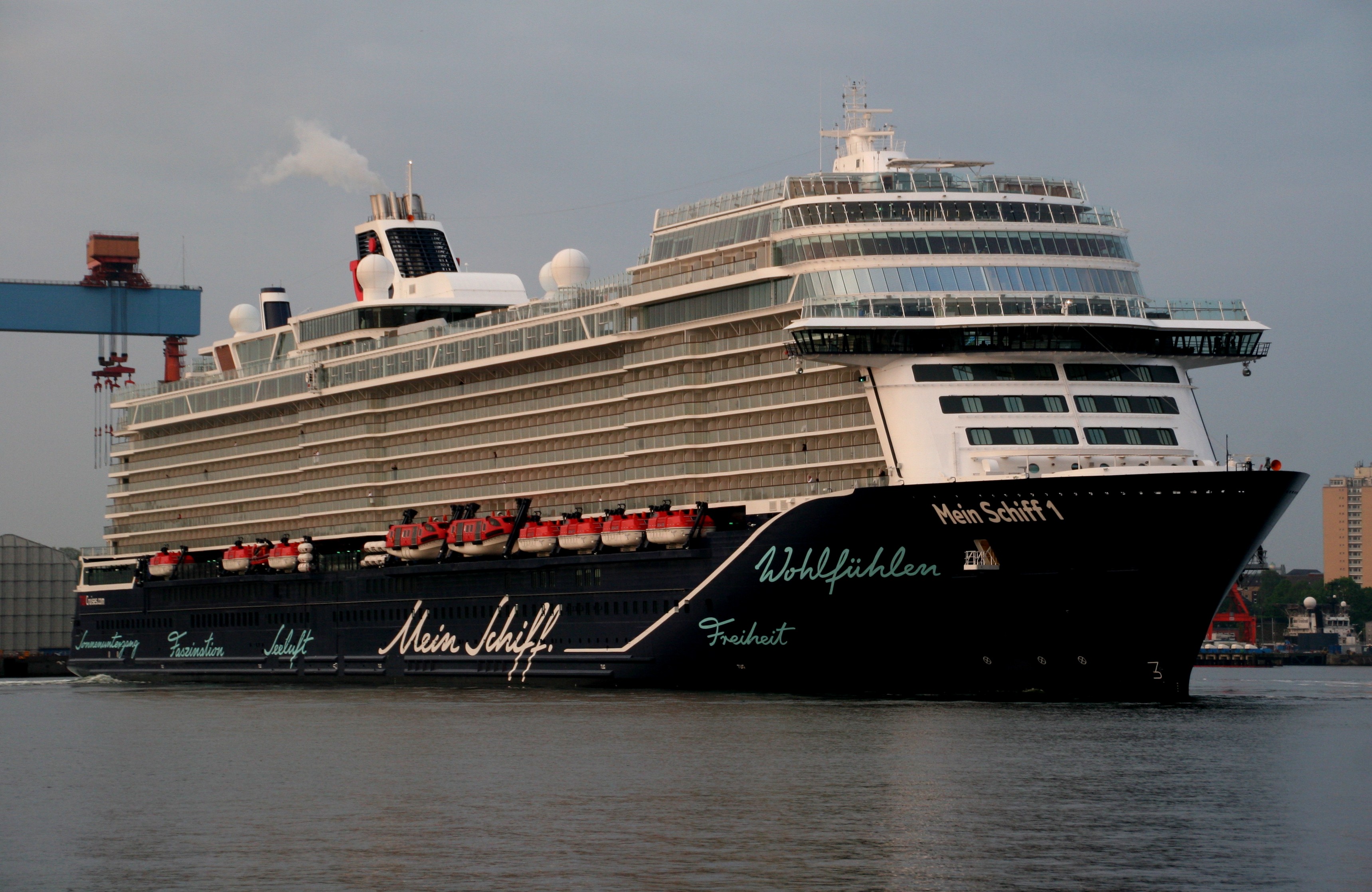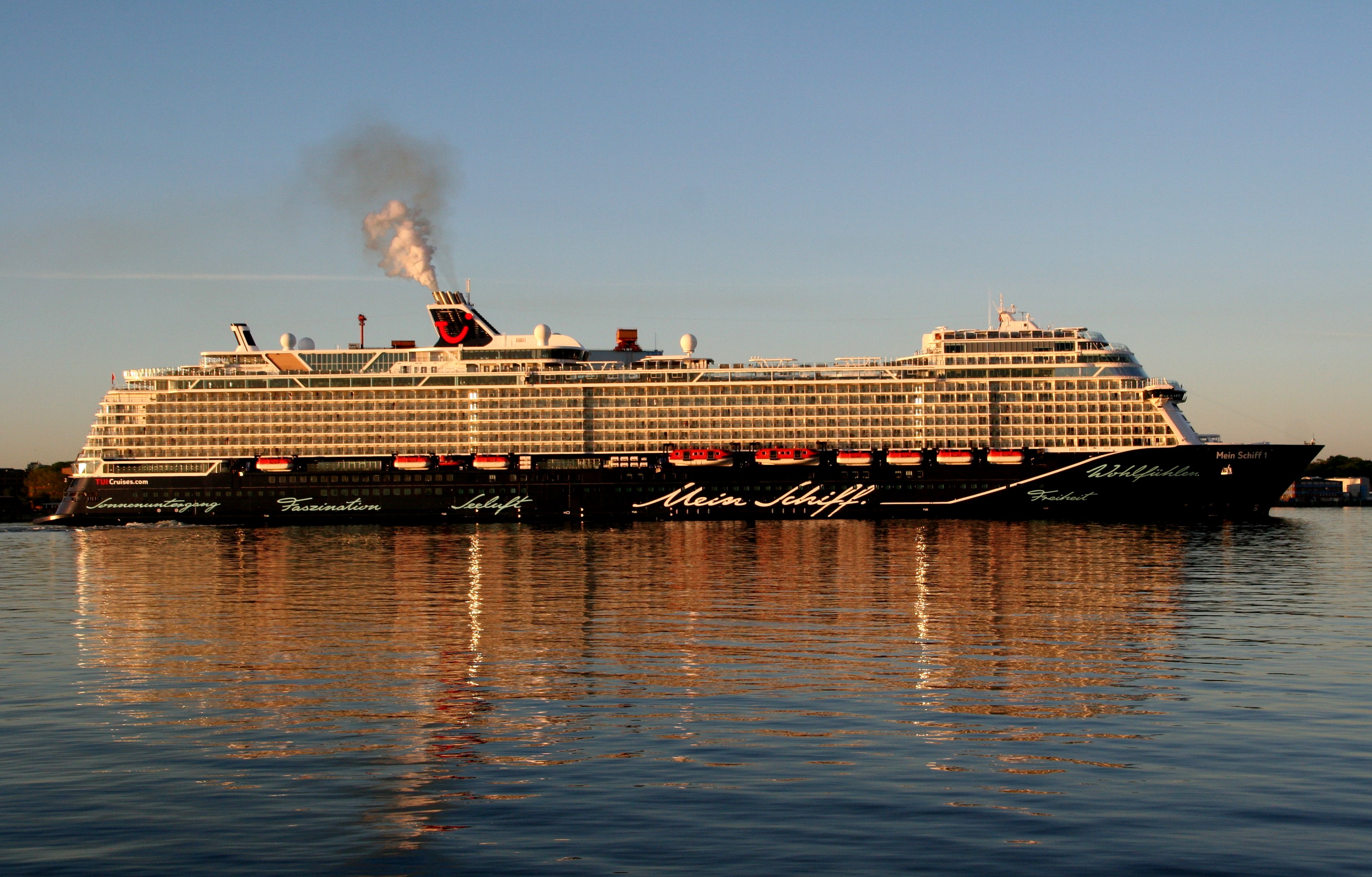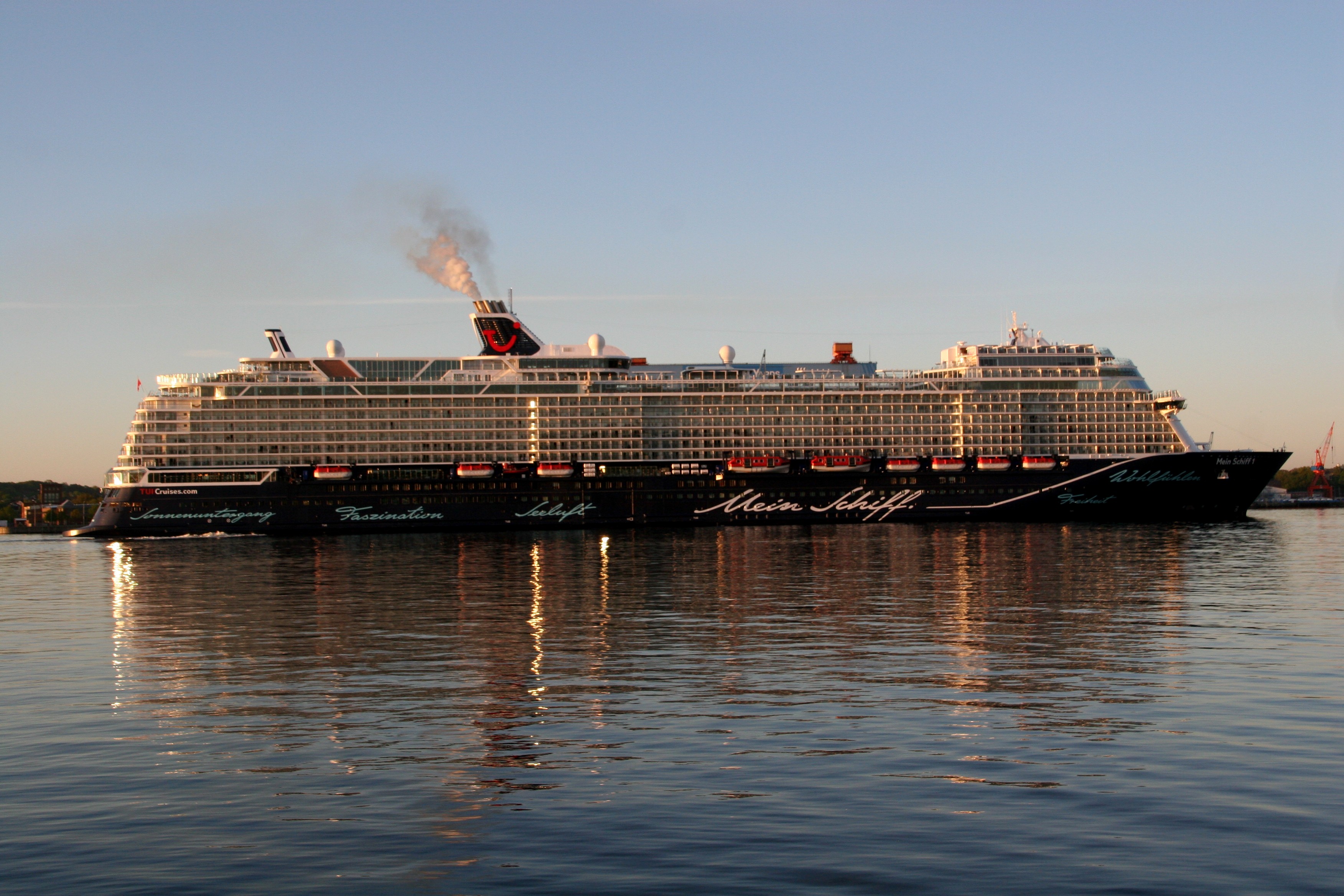 Die "Mein Schiff 1" morgens in stimmungsvoller Atmosphäre mit einem kräftigen "Heizergruß" auf der "Kieler Förde"