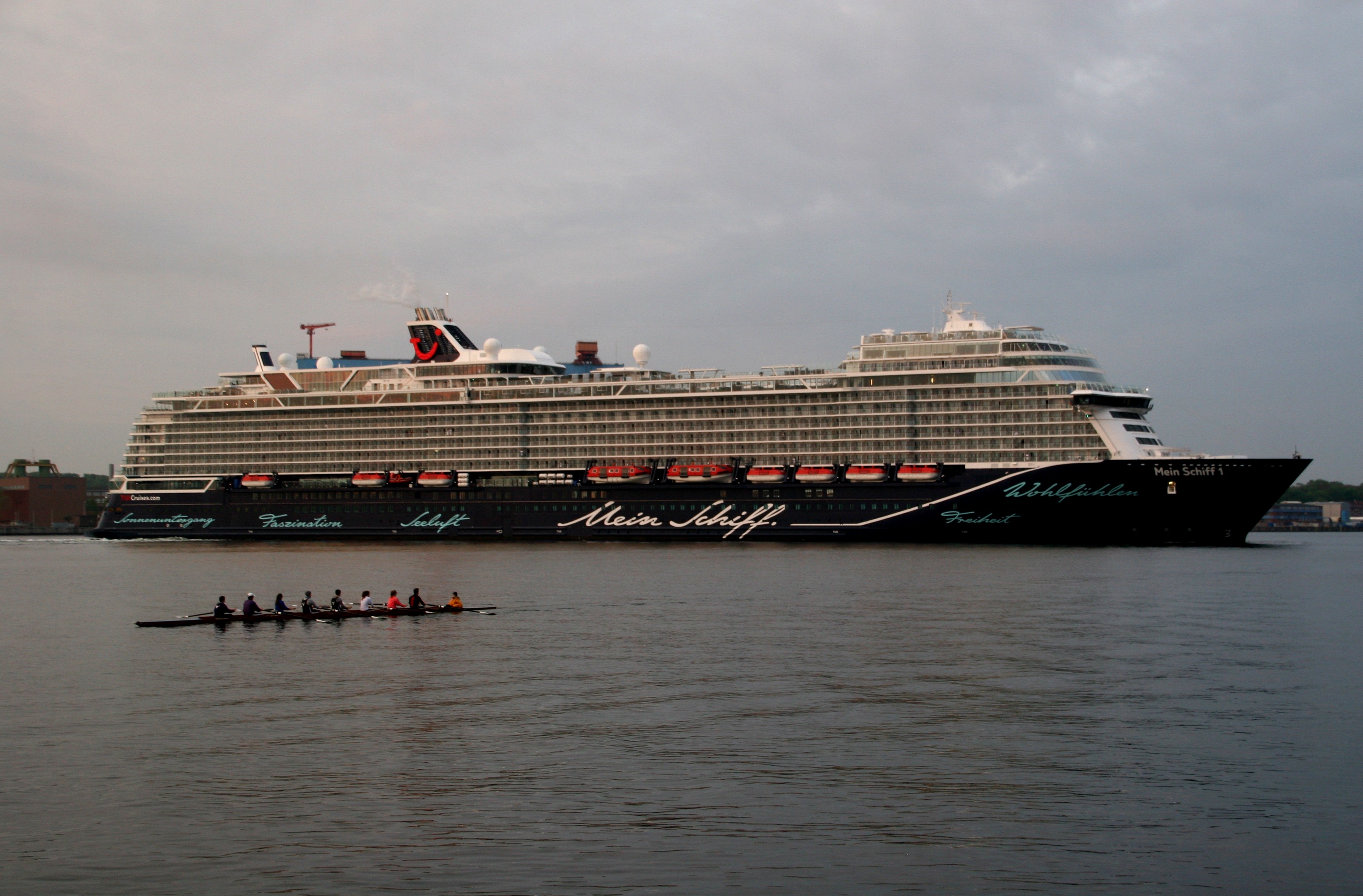 Die "Mein Schiff" 1 dreht morgens vor der Flaniermeile "Kiellinie" auf dem "Teller"