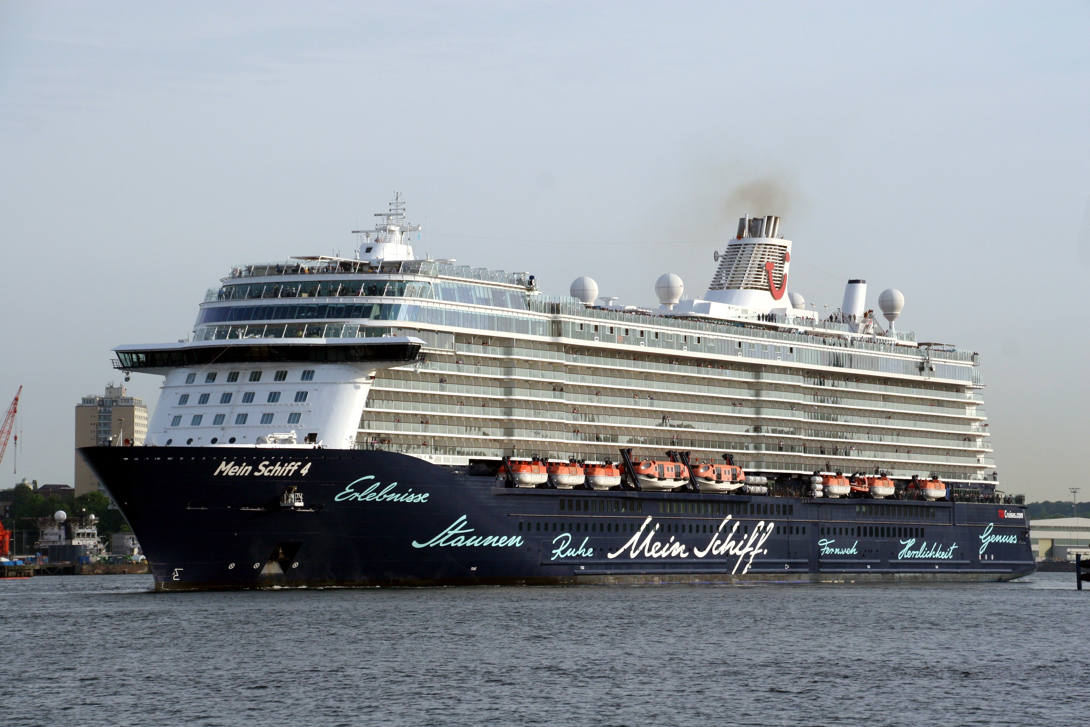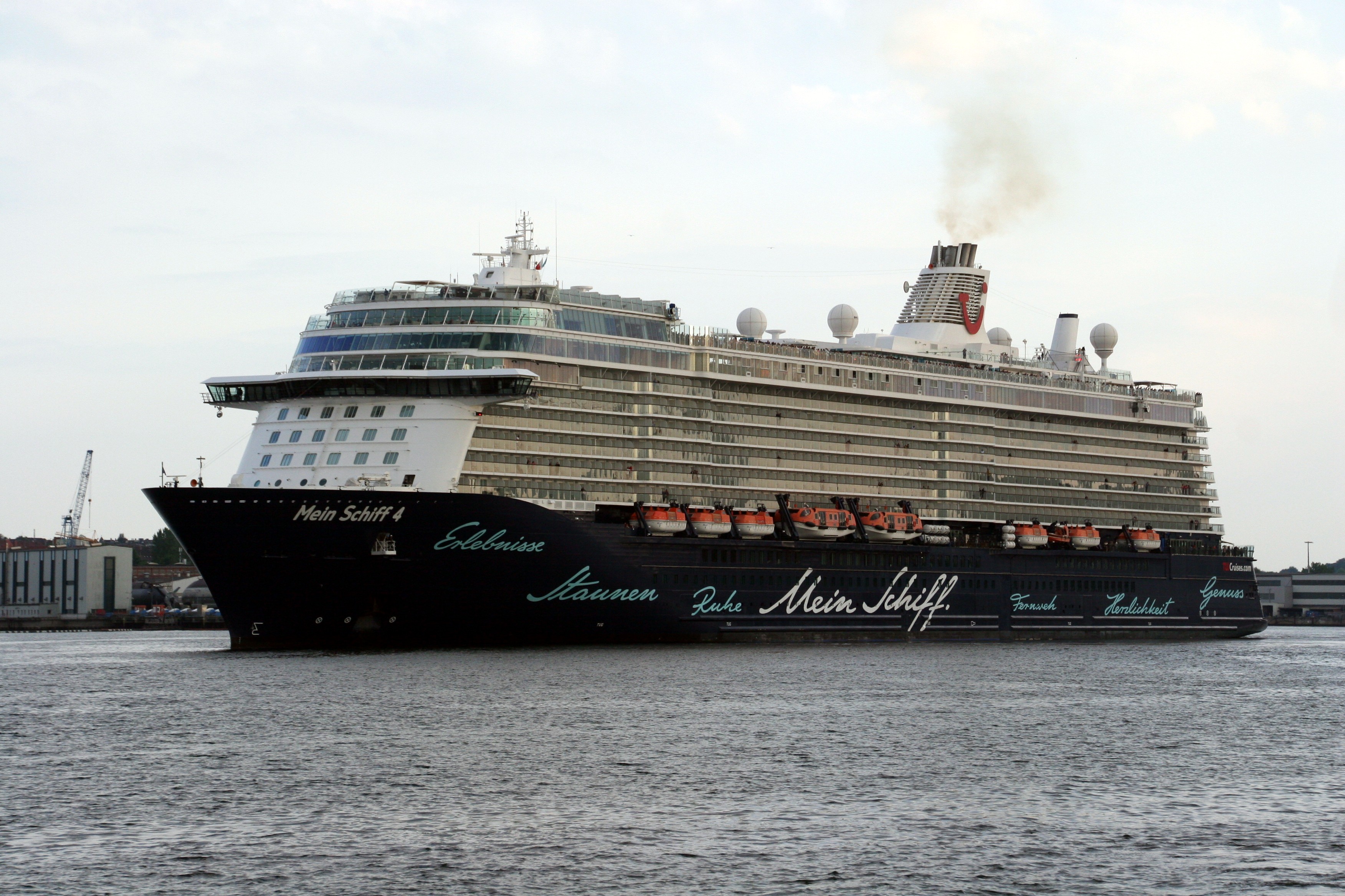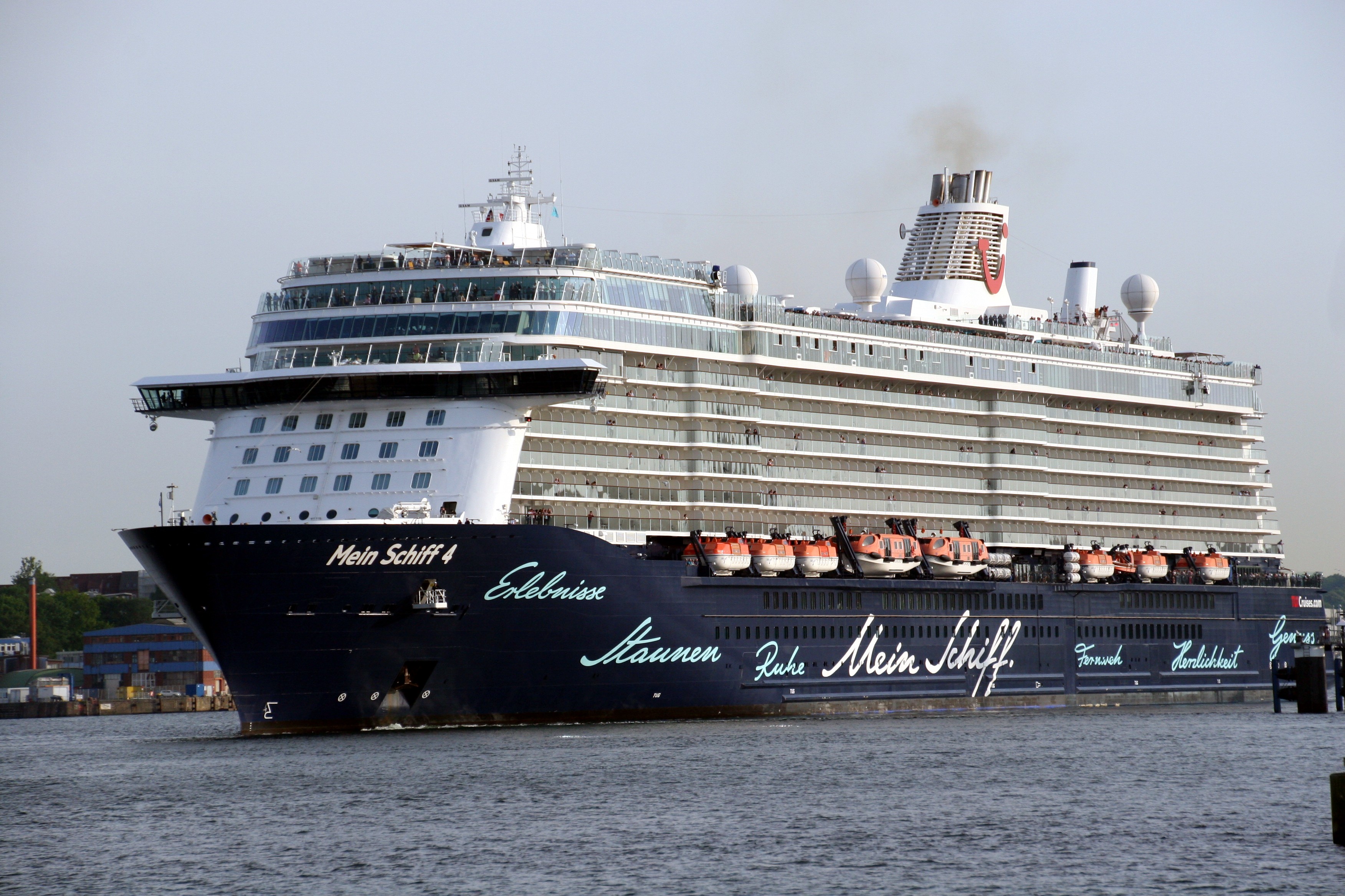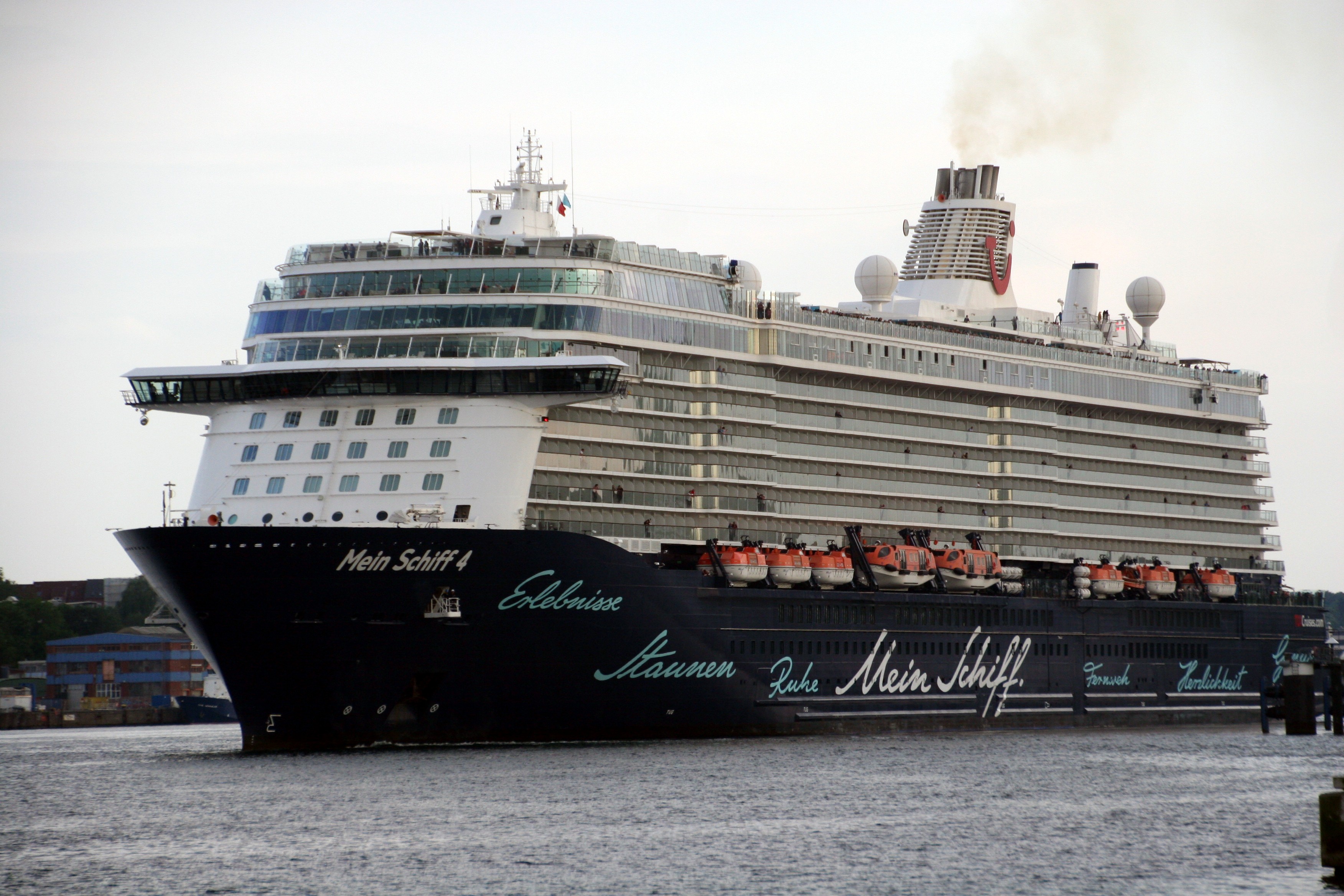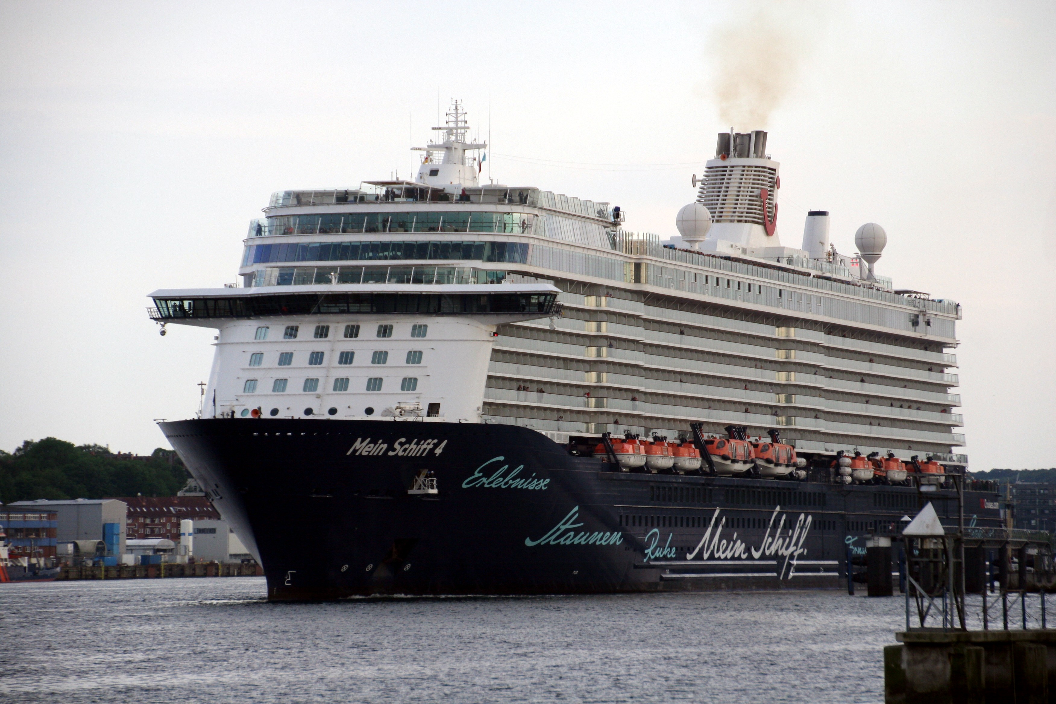 Die "Mein Schiff 4" wartet am Ostseekai mit einem kräftigen "Heizergruß" auf ihr Auslaufmanöver