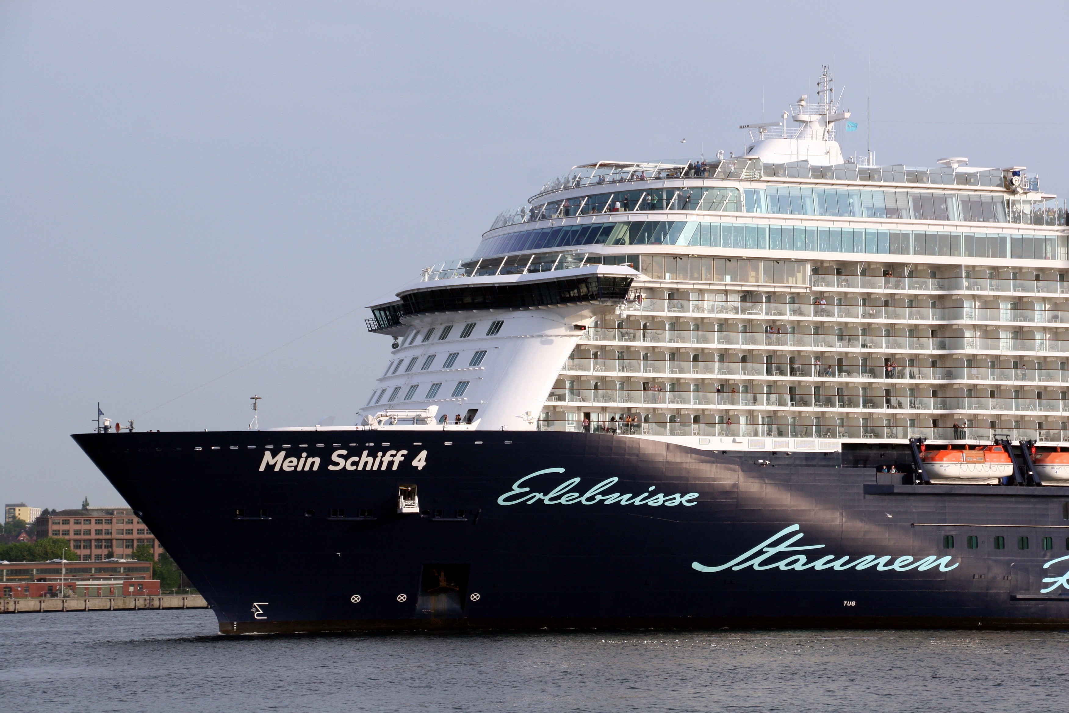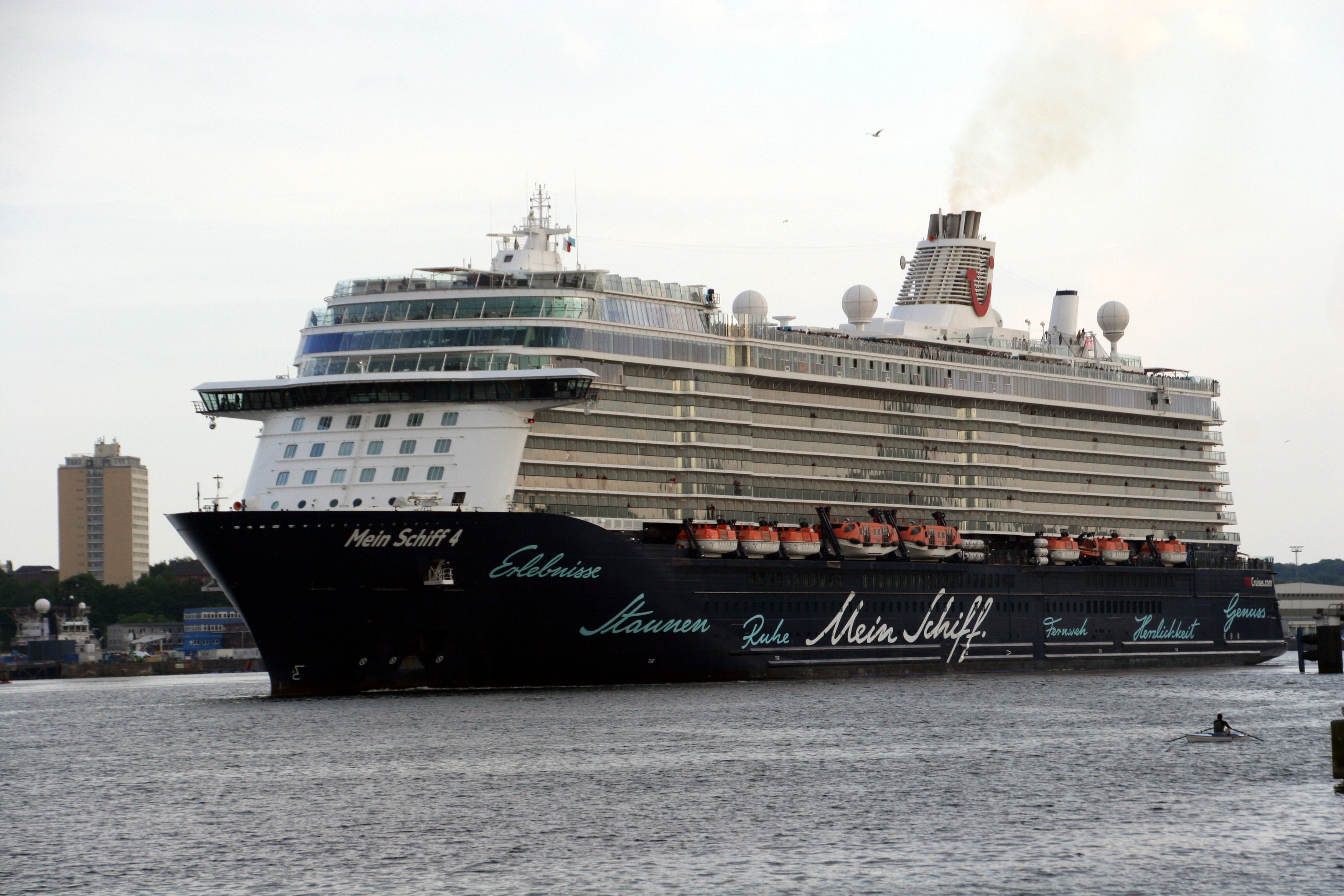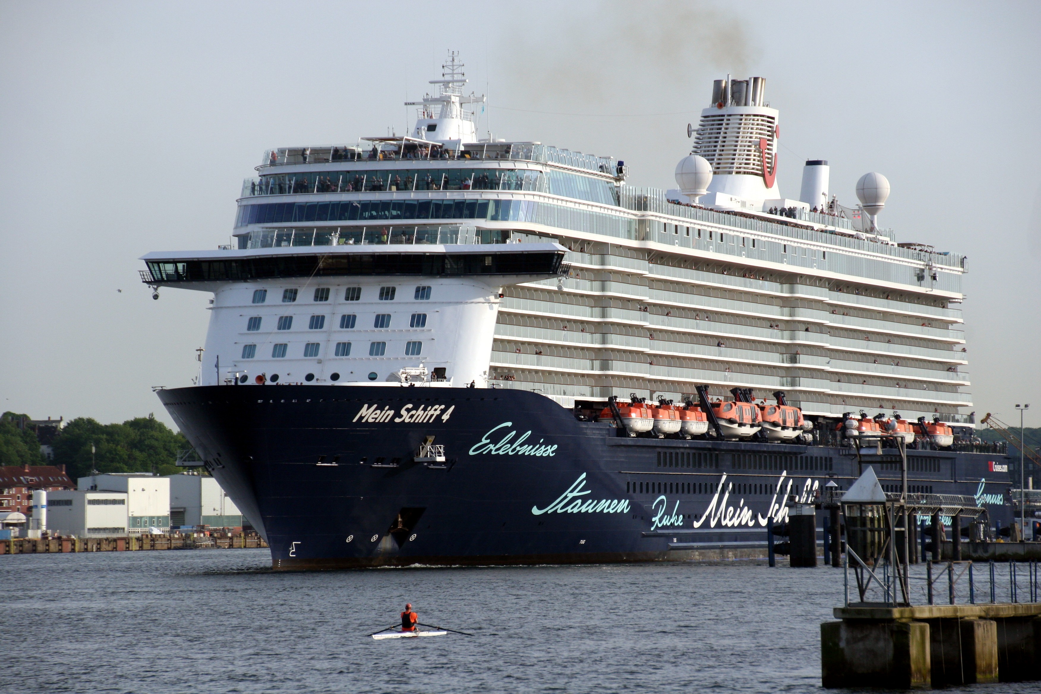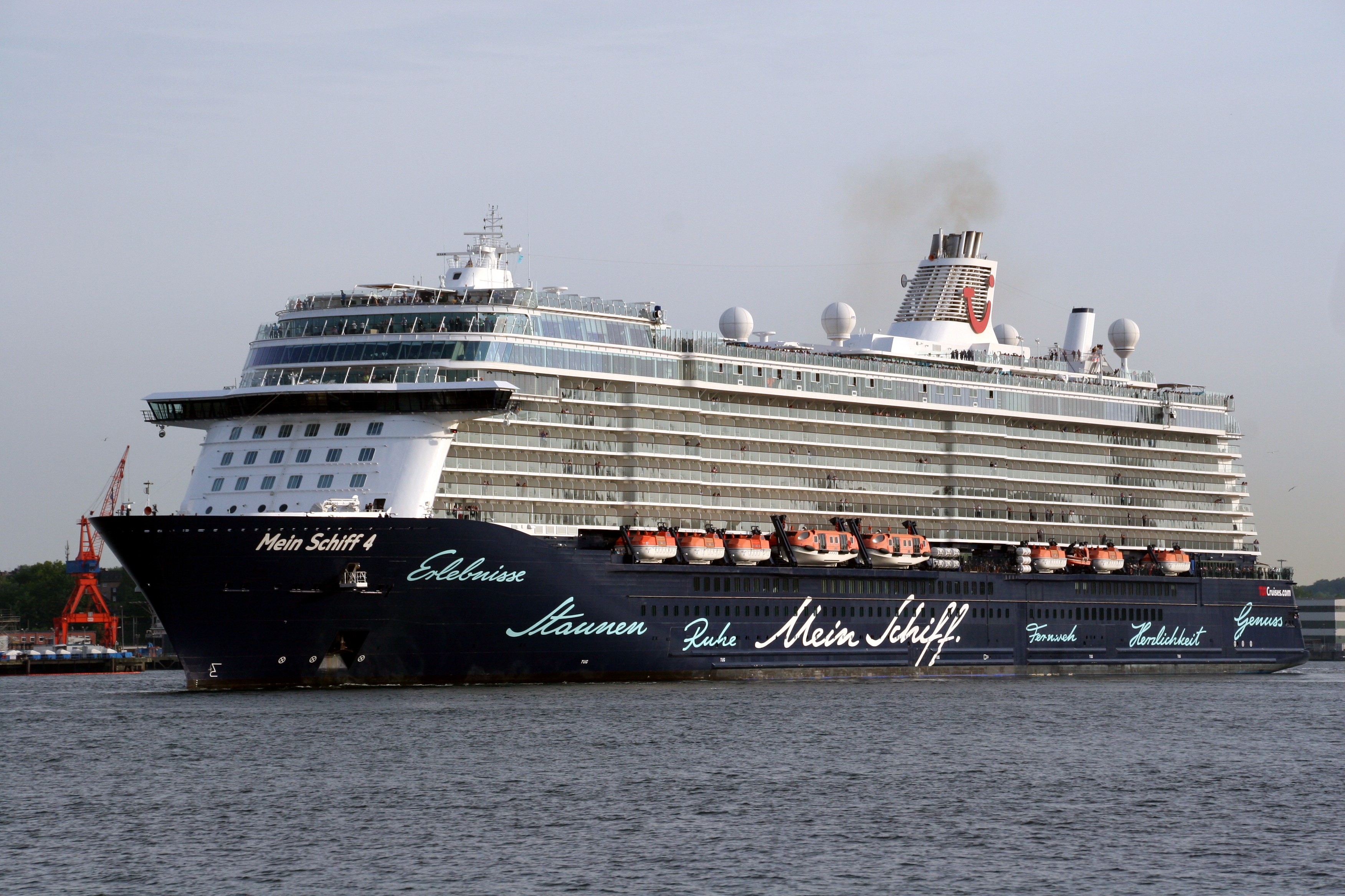 Die "Mein Schiff 4" wartet am Ostseekai mit einem kräftigen "Heizergruß" auf ihr Auslaufmanöver