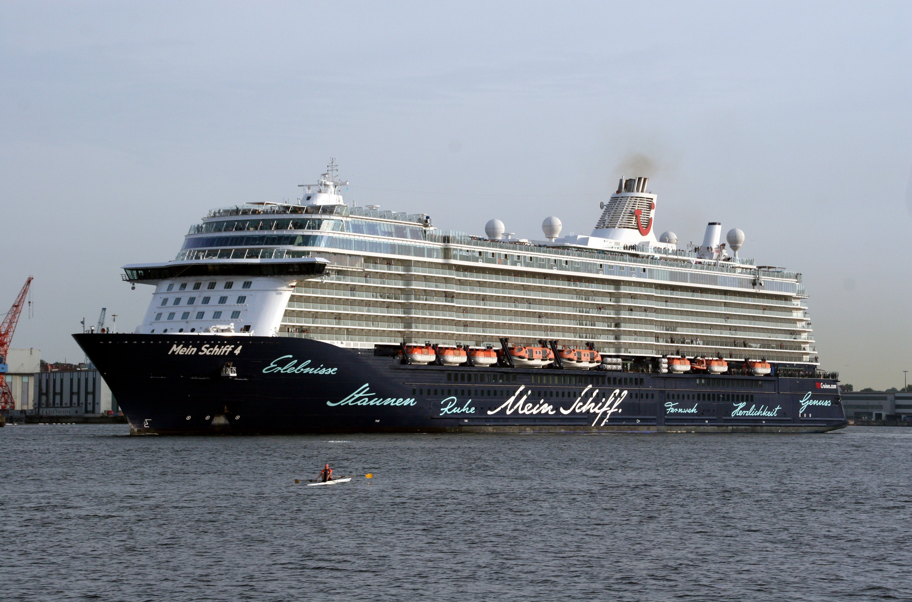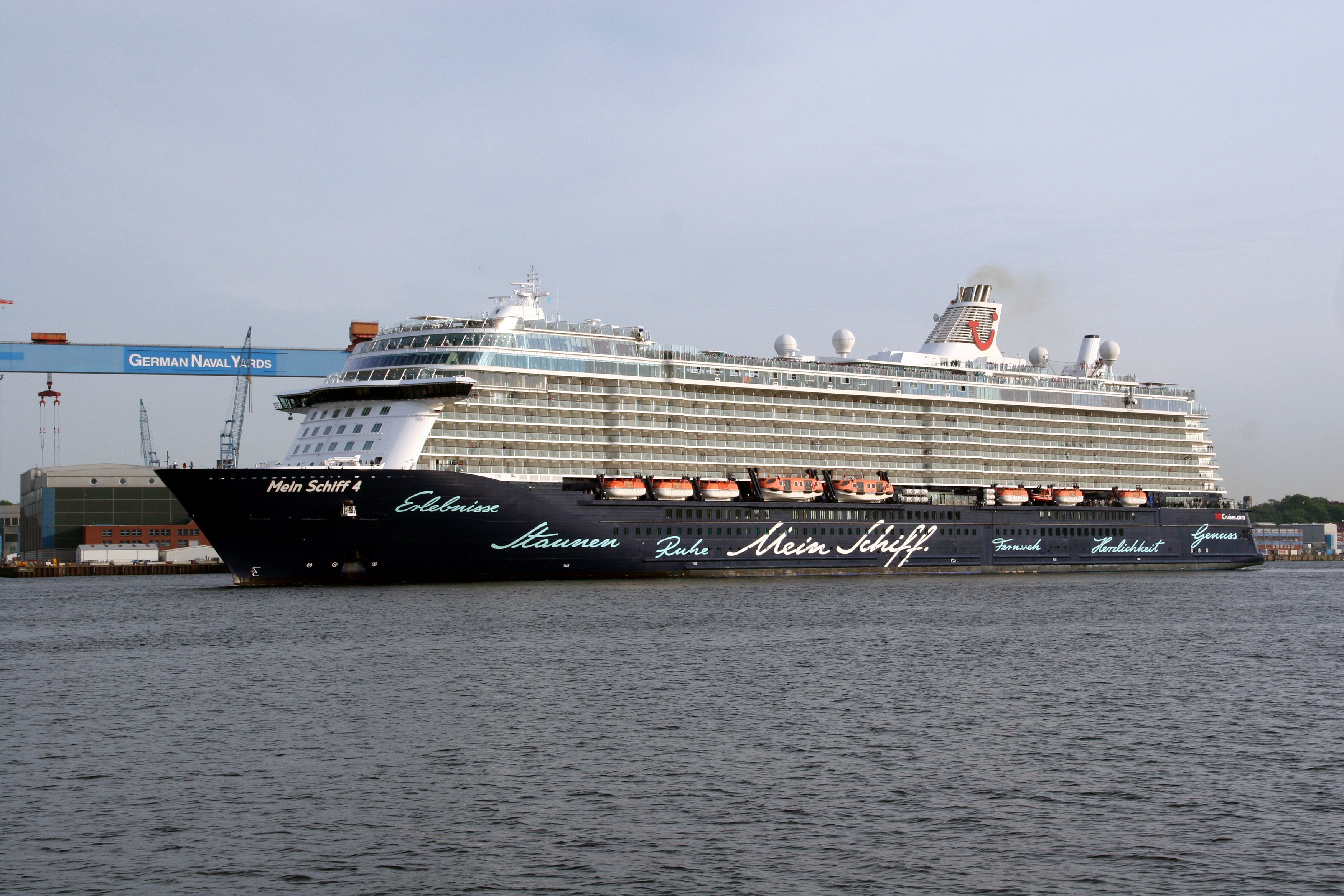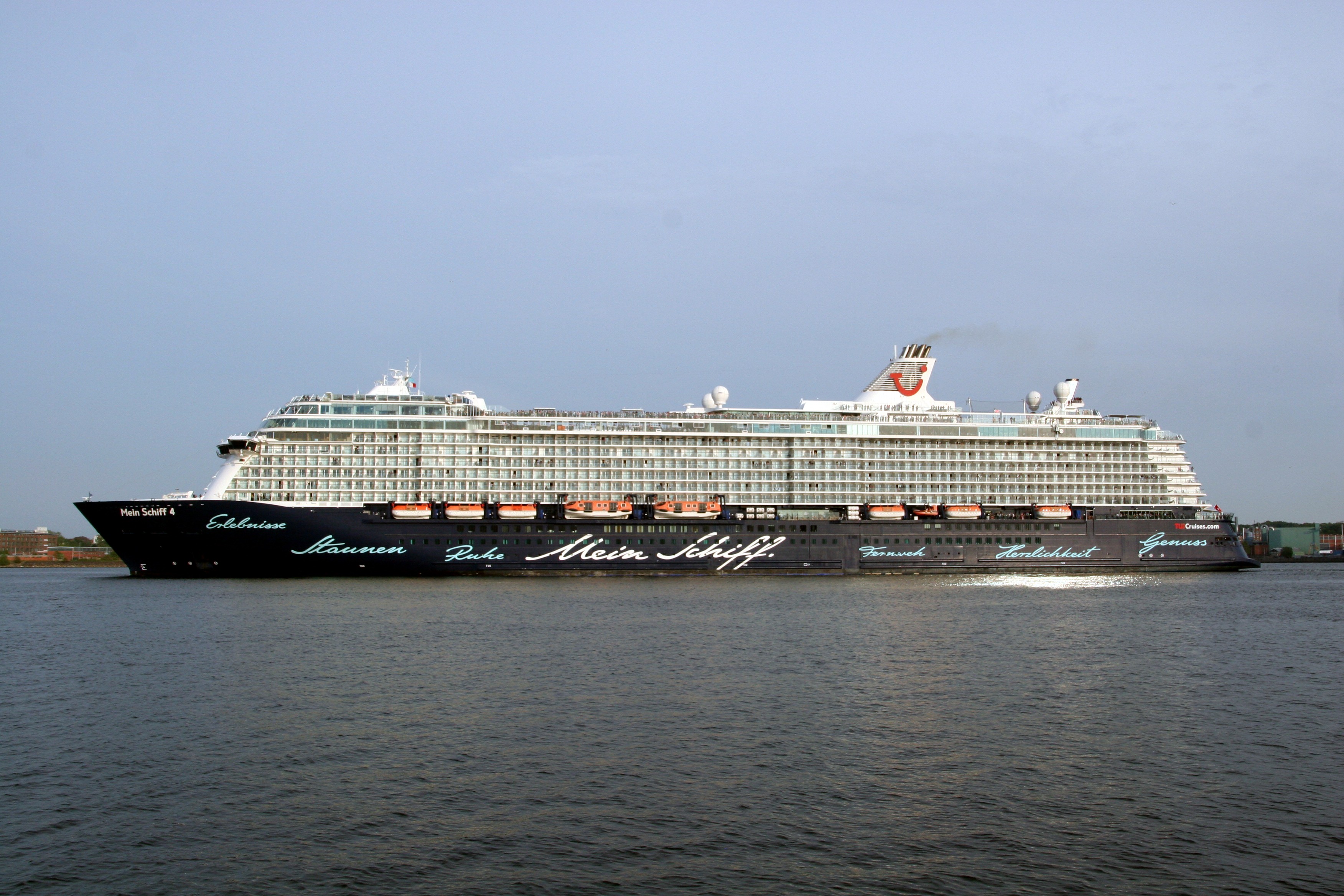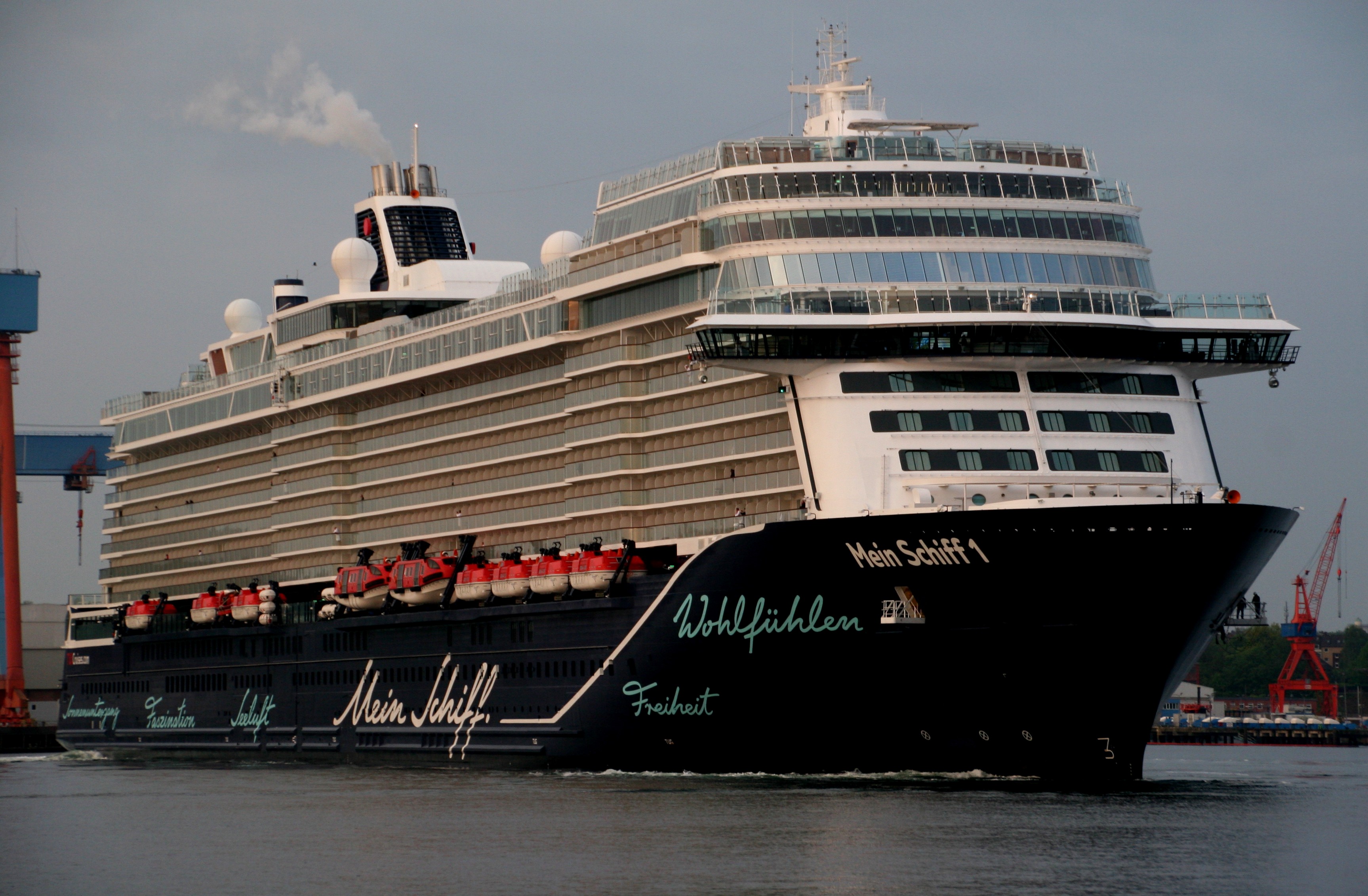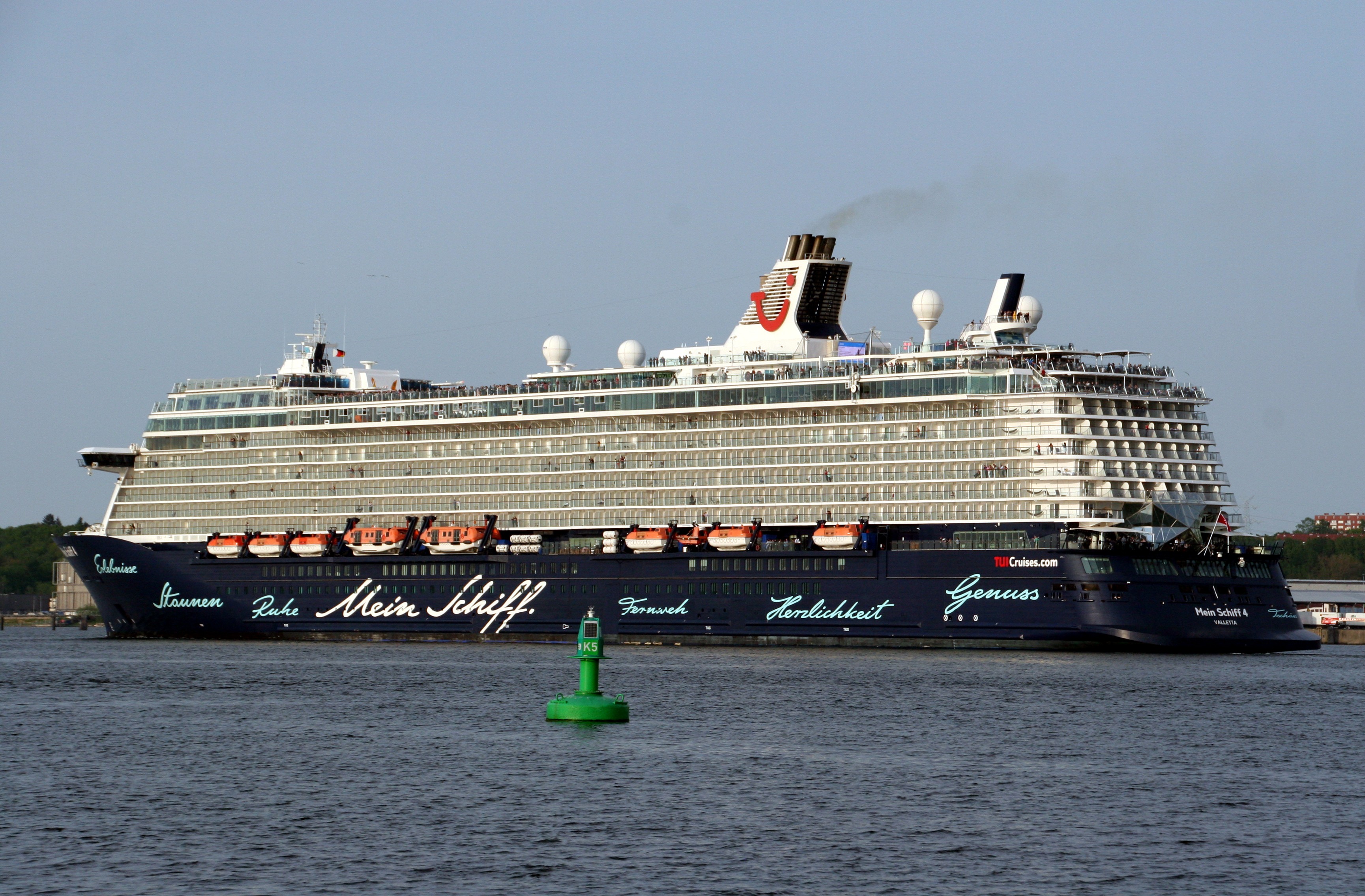 Die "Mein Schiff 4" wartet am Ostseekai mit einem kräftigen "Heizergruß" auf ihr Auslaufmanöver