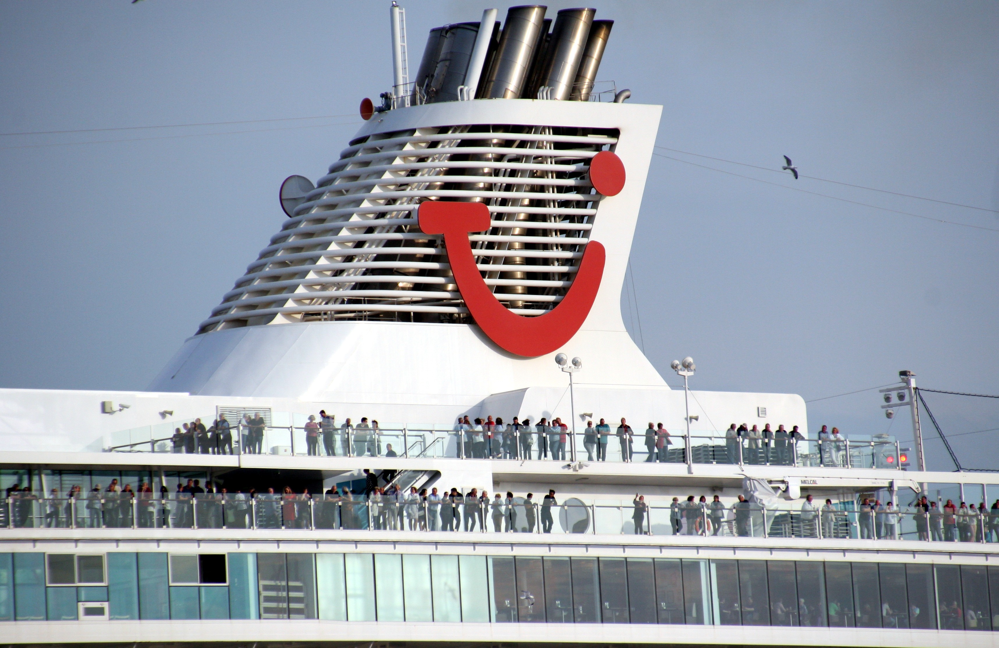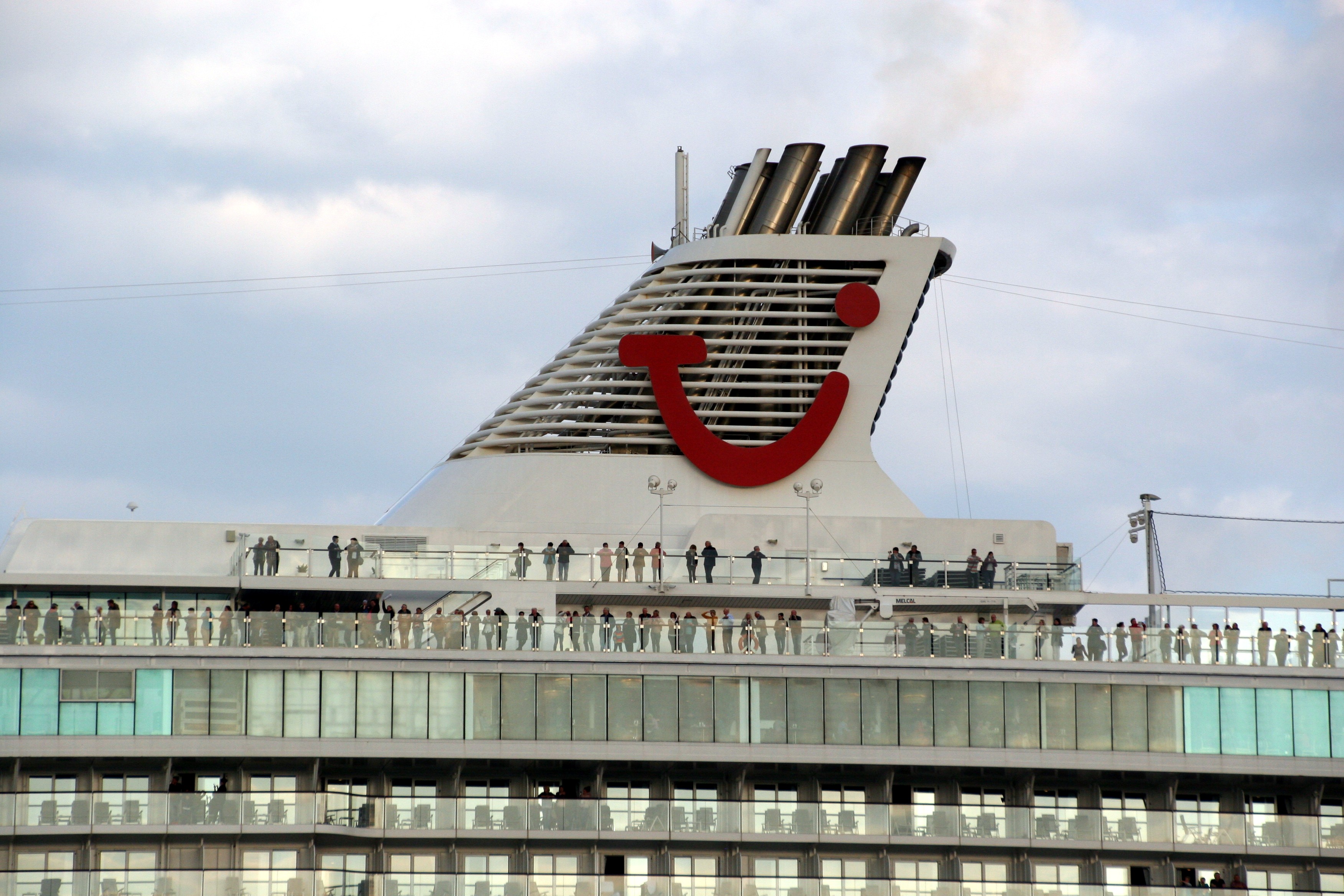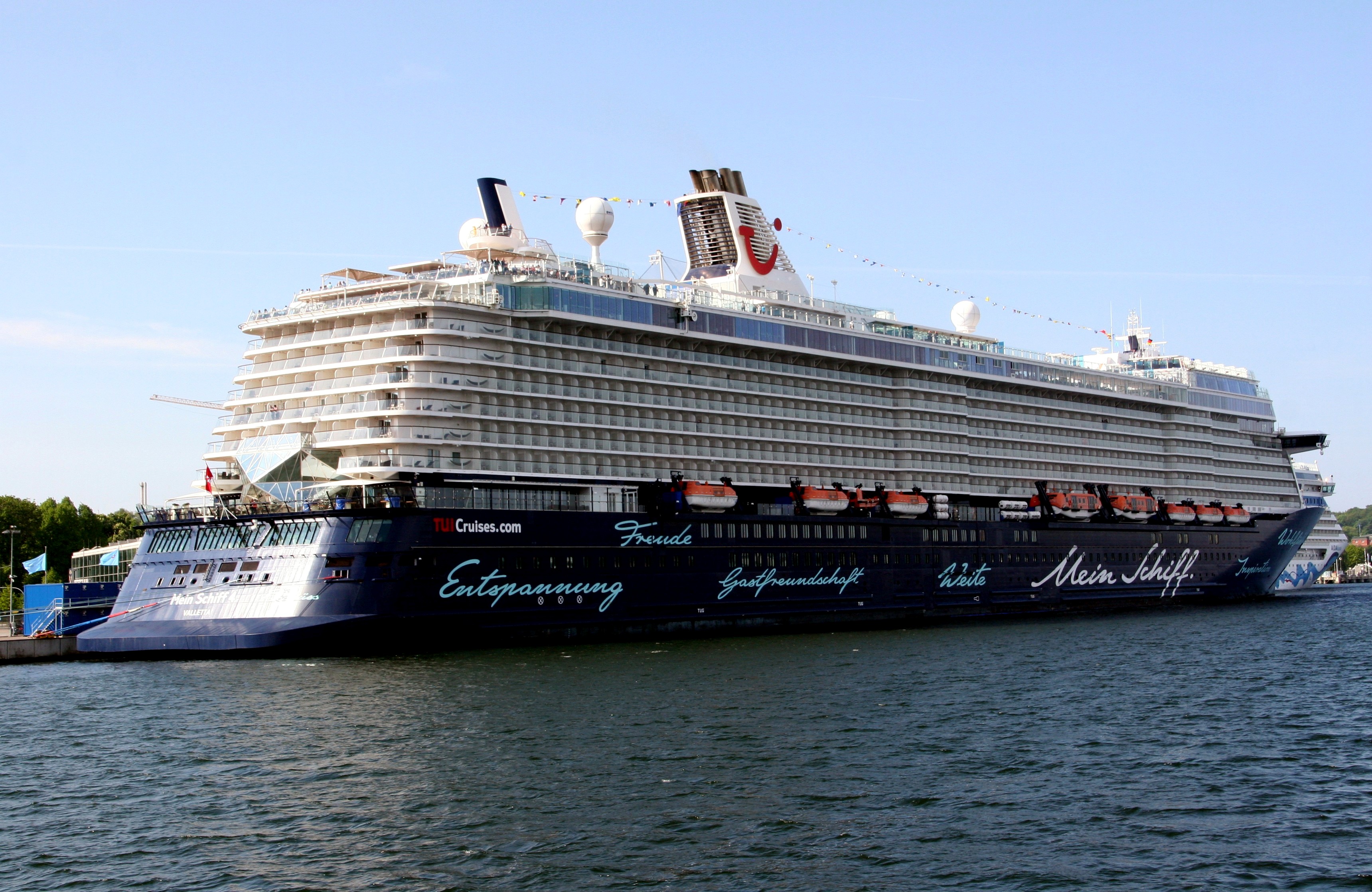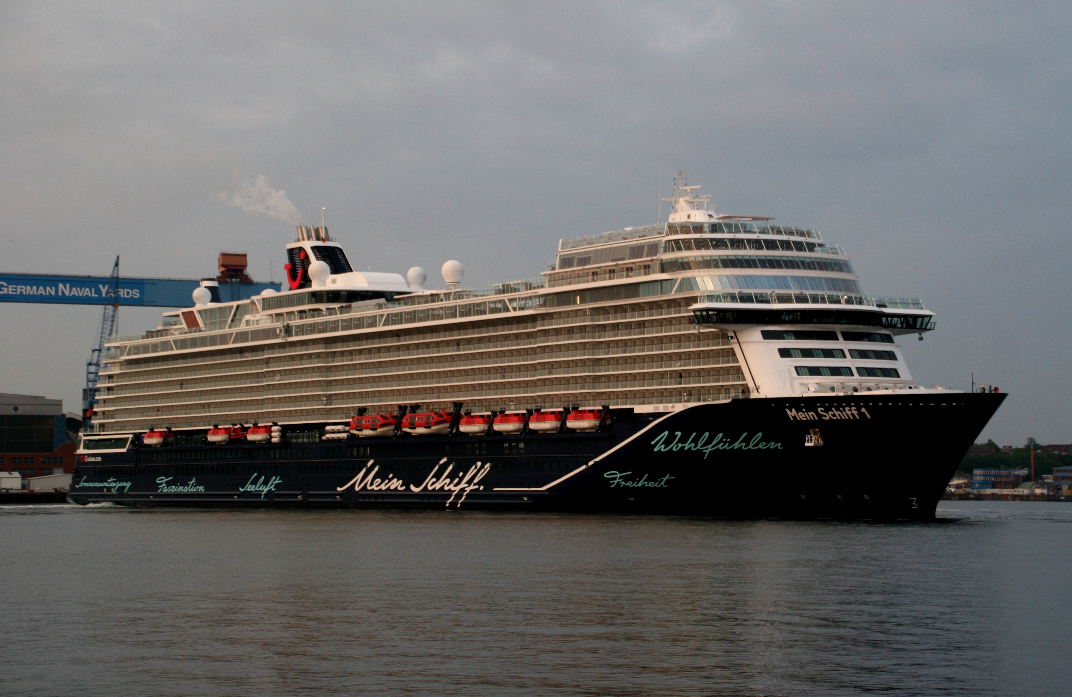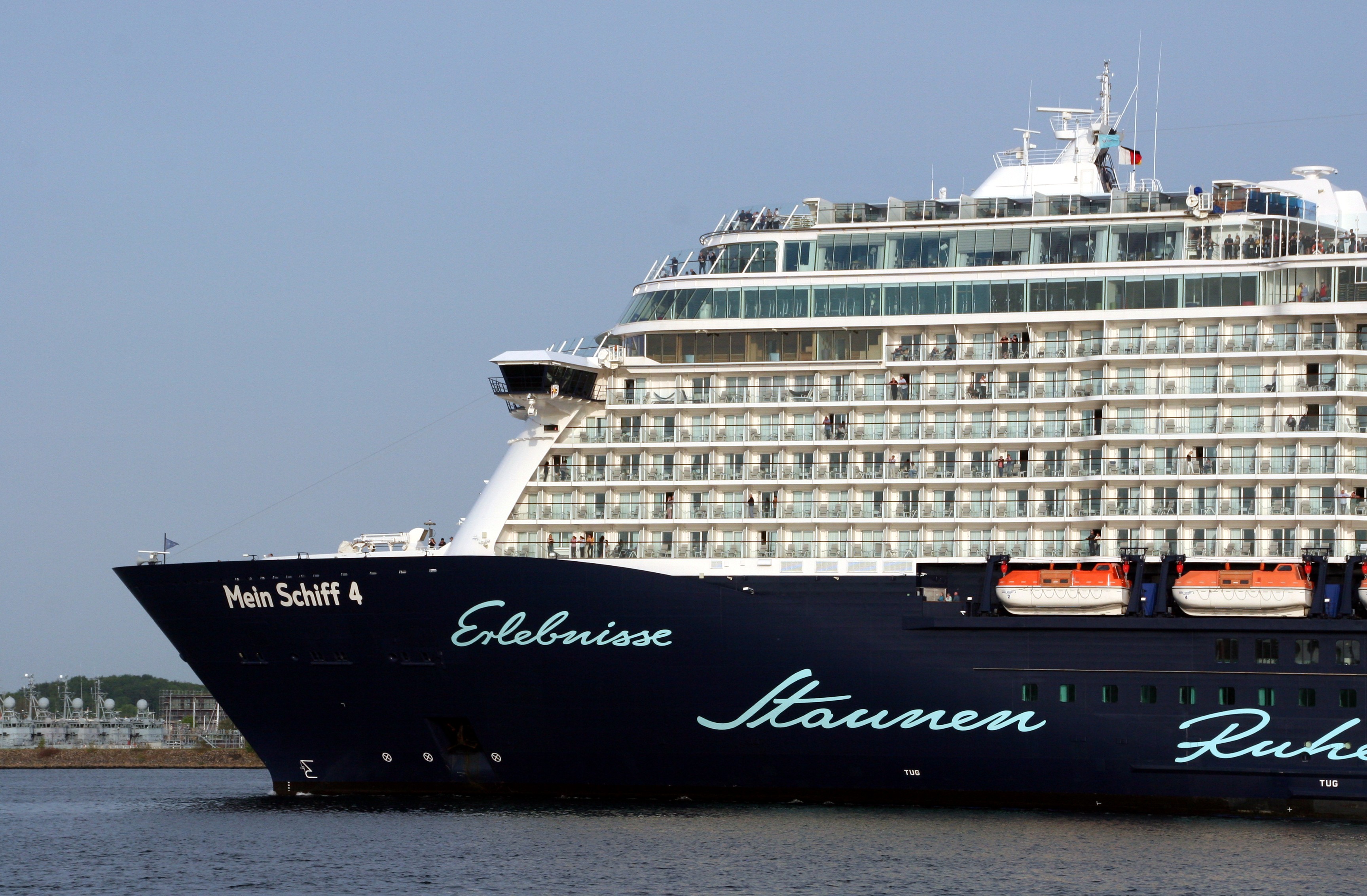 Die "Mein Schiff 4" wartet am Ostseekai mit einem kräftigen "Heizergruß" auf ihr Auslaufmanöver