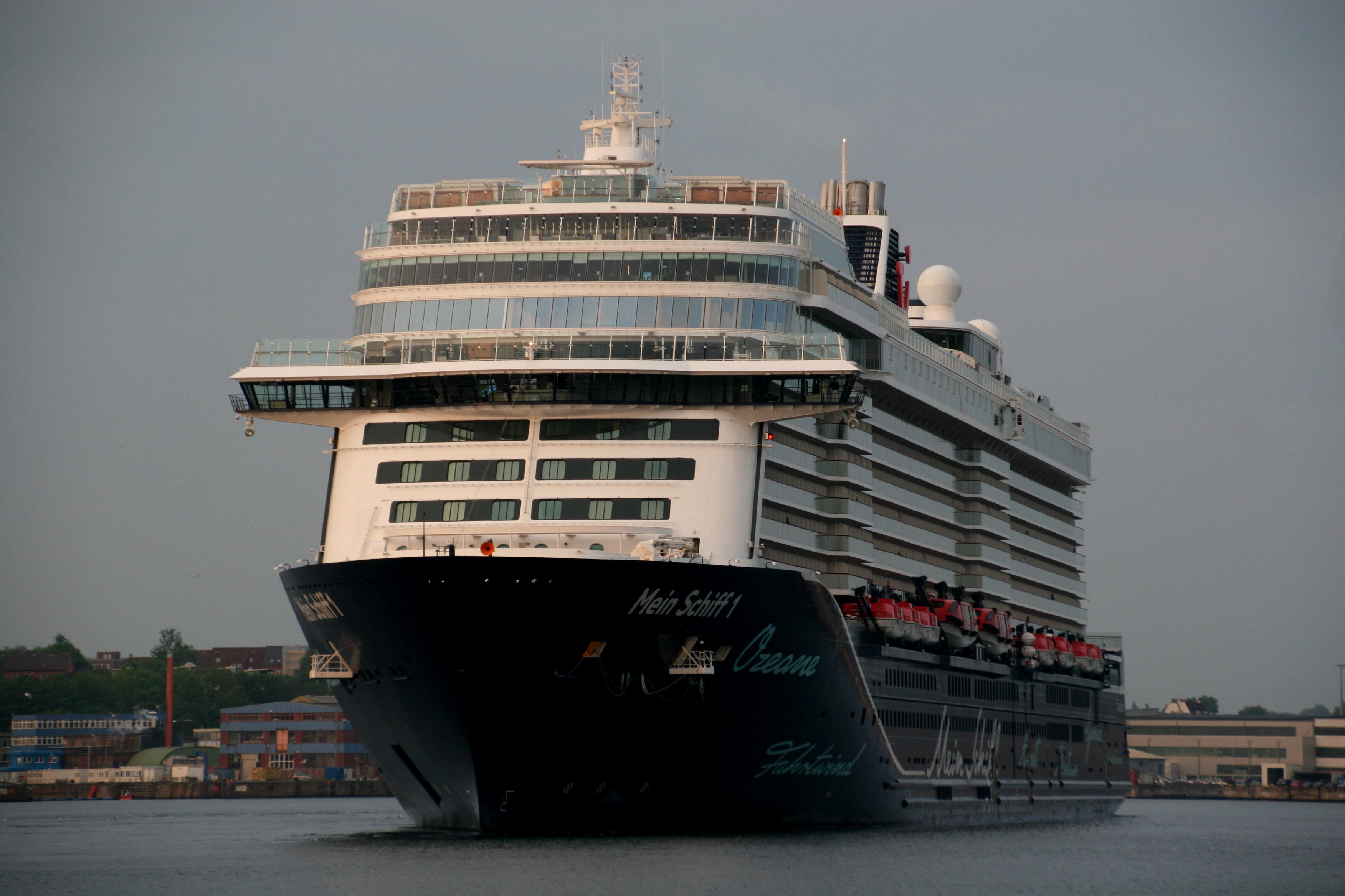 Die "Mein Schiff 1" dreht morgens vor der Flaniermeile "Kiellinie" auf dem "Teller"