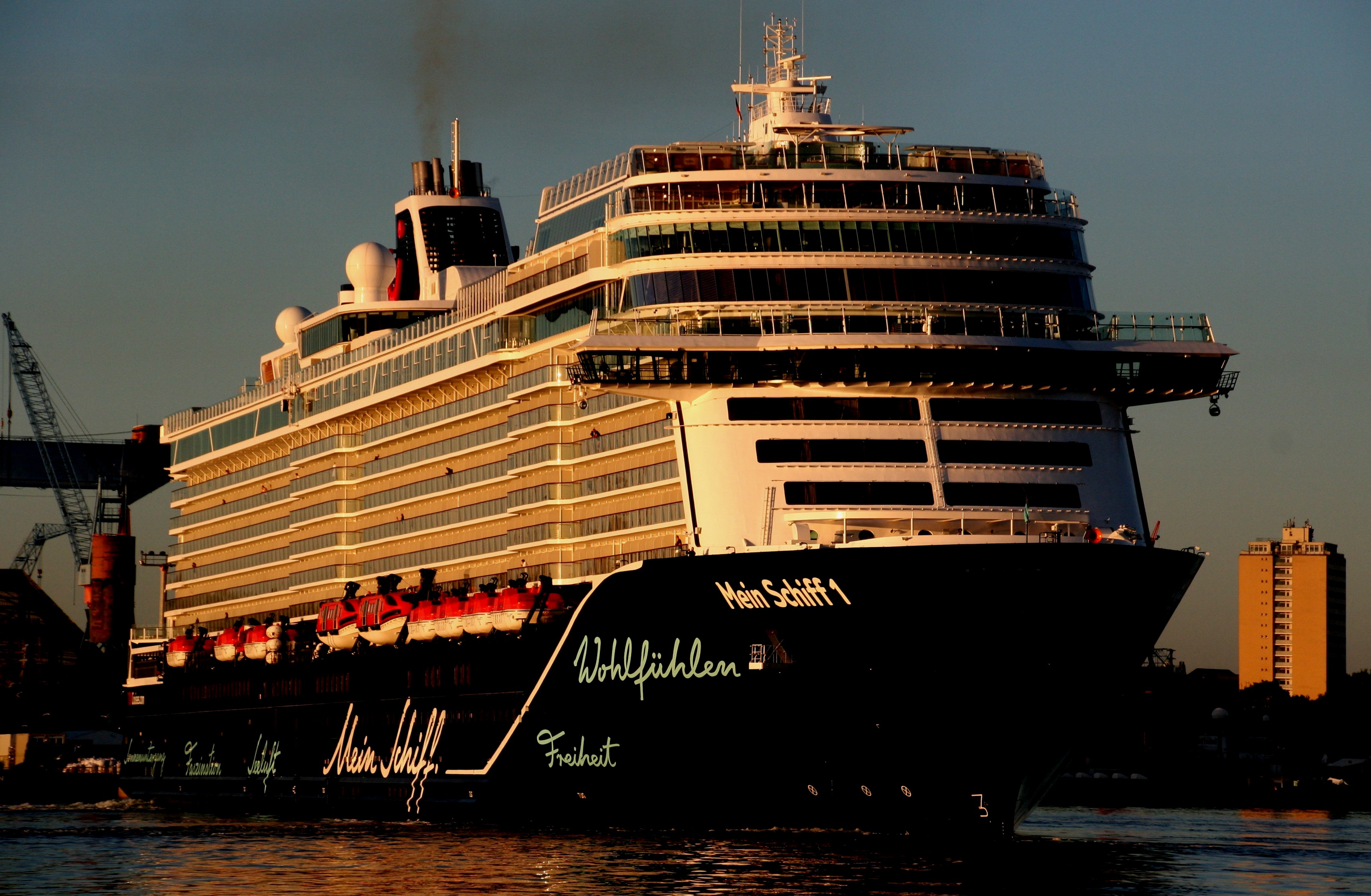 Die "Mein Schiff 1" fährt am 14.05.2019 um 06.01h im morgendlichen Lichterglanz der aufgehenden Sonne ihr Anlegemanöver zum Ostseekai (LP 27)