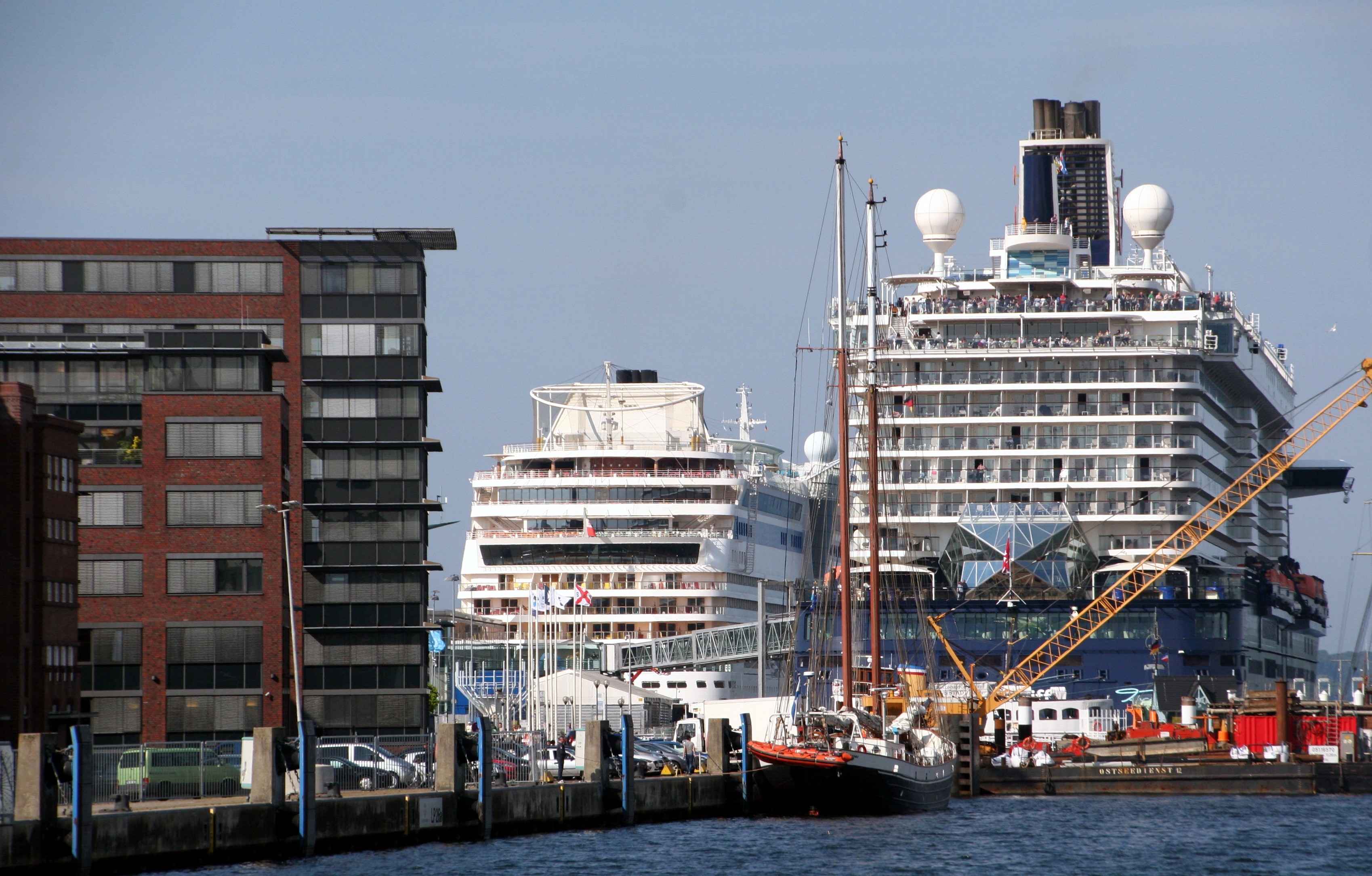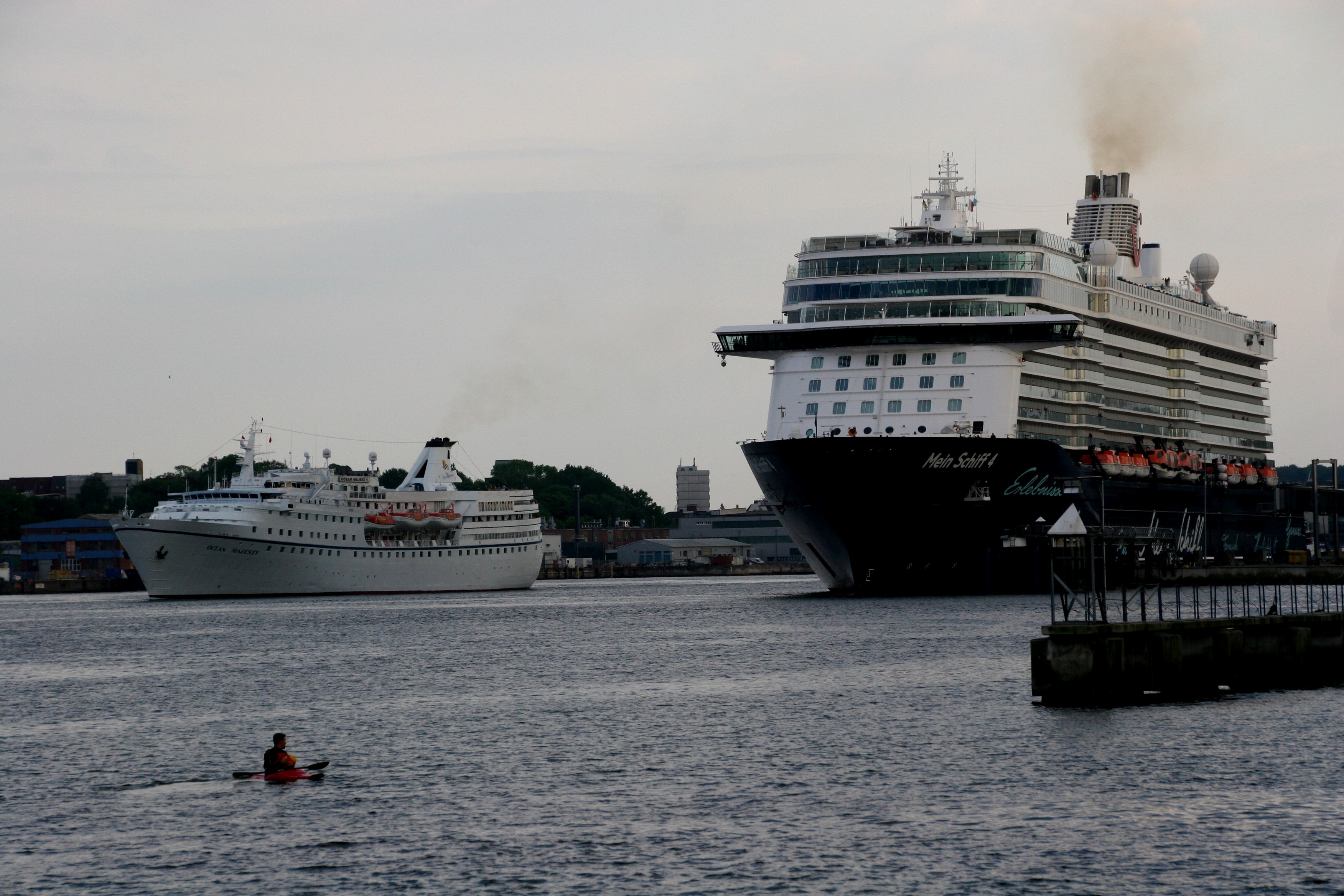 Ein kleiner "Fördedampfer" neben zwei großen "Kreuzfahrtdampfern"