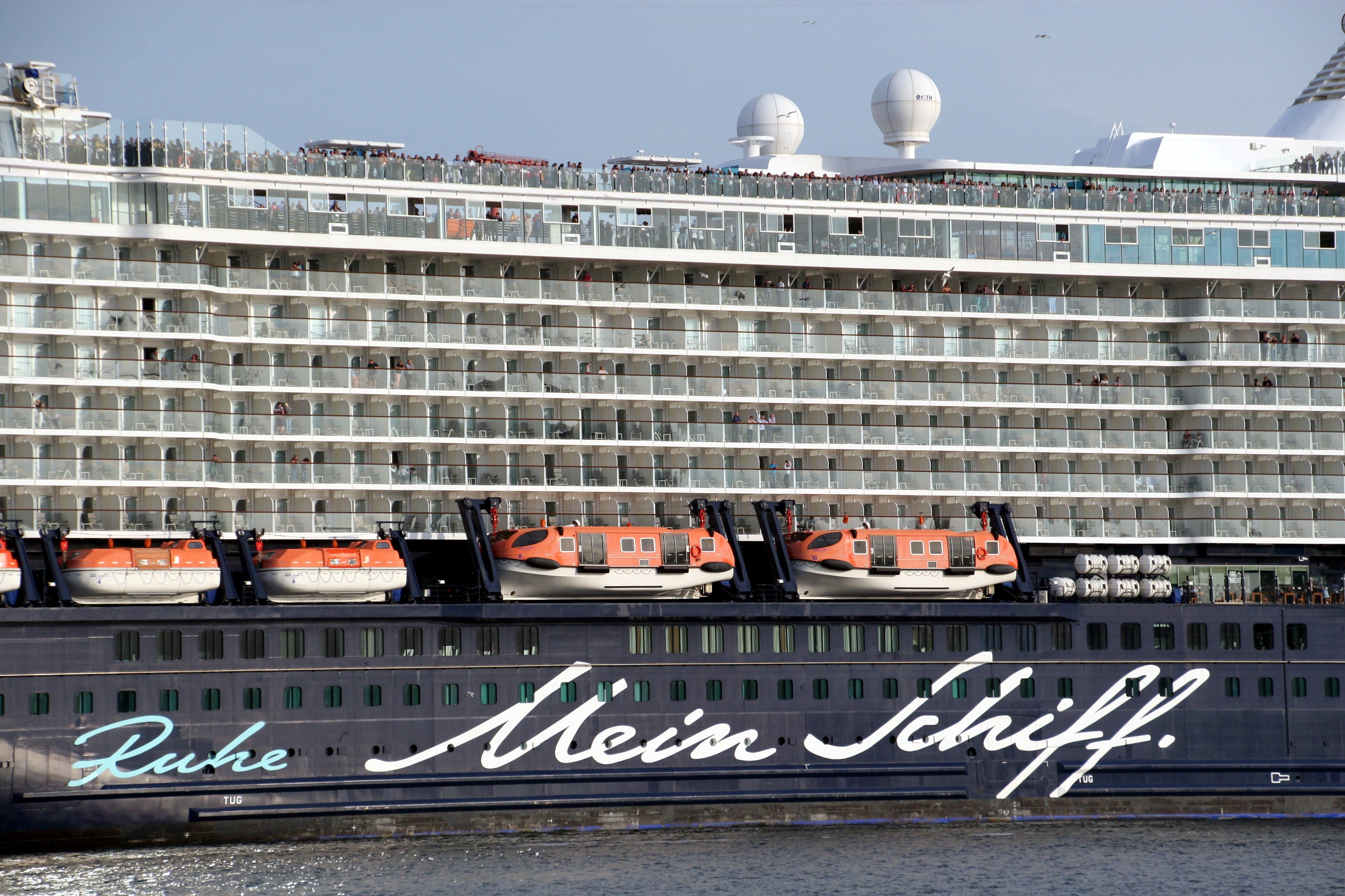 Zahlreiche "Sehleute" genießen an Oberdeck bei Bilderbuchwetter das Auslaufmanöver mit der "Mein Schiff 4" auf der "Kieler Förde"