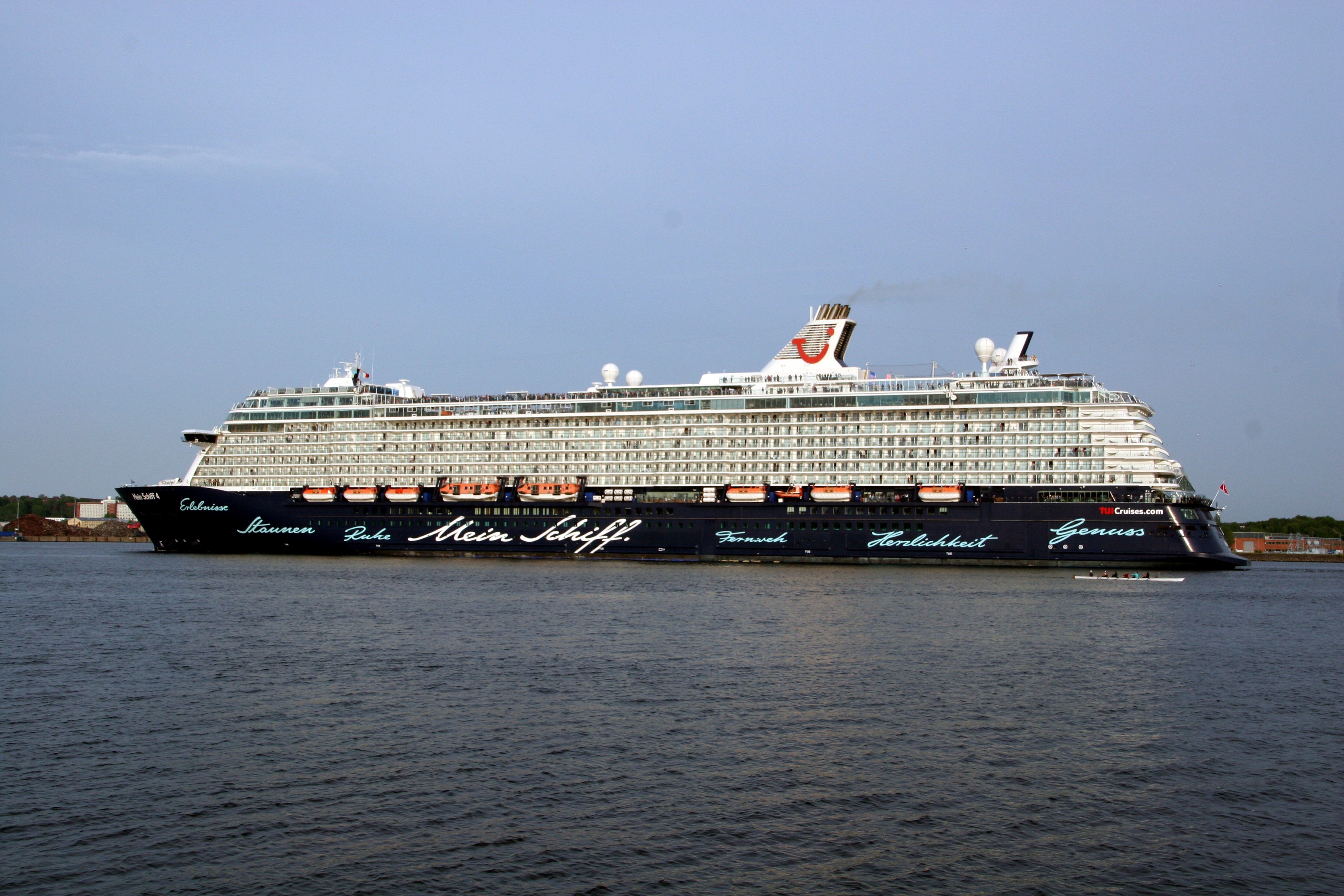 Die "Mein Schiff 4" fährt unter einem azurblauen Himmel ihre Revierfahrt auf der "Kieler Förde"