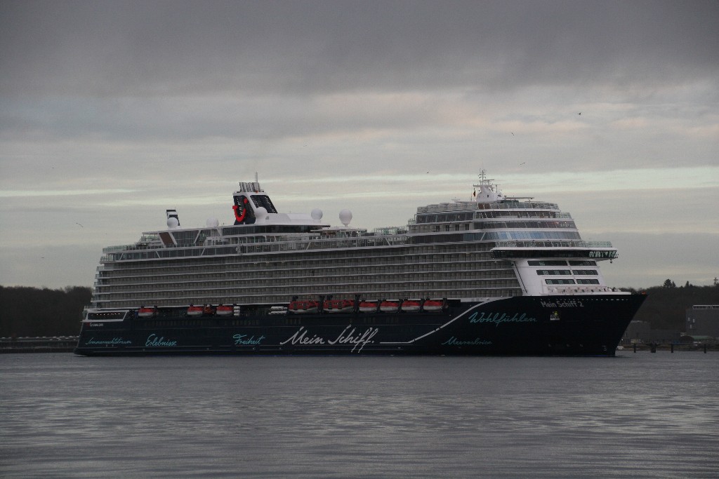 die neue Mein Schiff 2 hat am 05.01.2019 ab 09:49h aus ihrer Bauwerft kommend ihr erstes Einlaufmanöver auf der "Kieler Förde"gefahren,sie wurde aber nicht mit Wasserfontänen begleitet