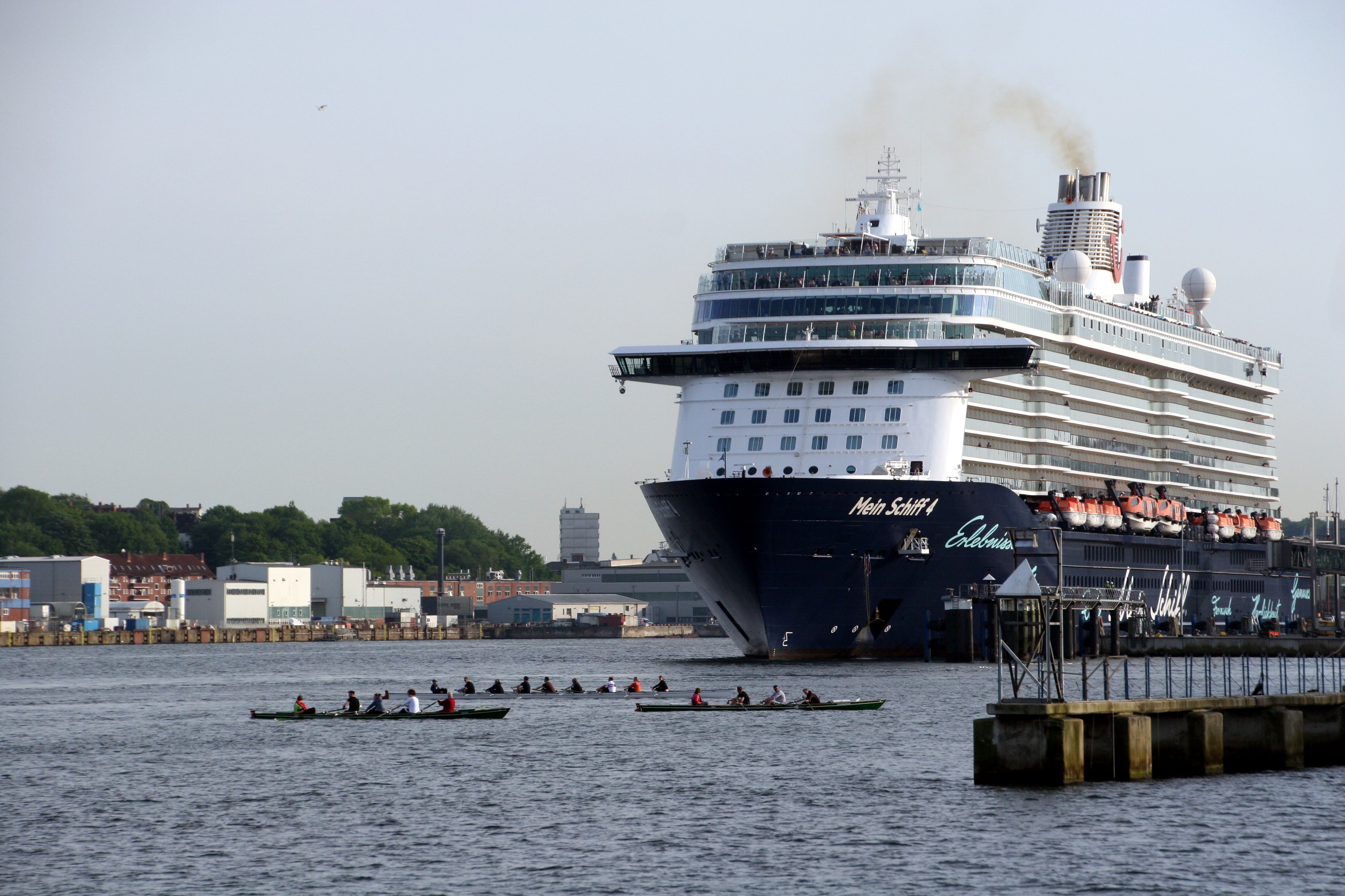 Die "Mein Schiff 4" wartet am Ostseekai mit einem kräftigen "Heizergruß" auf ihr Auslaufmanöver
