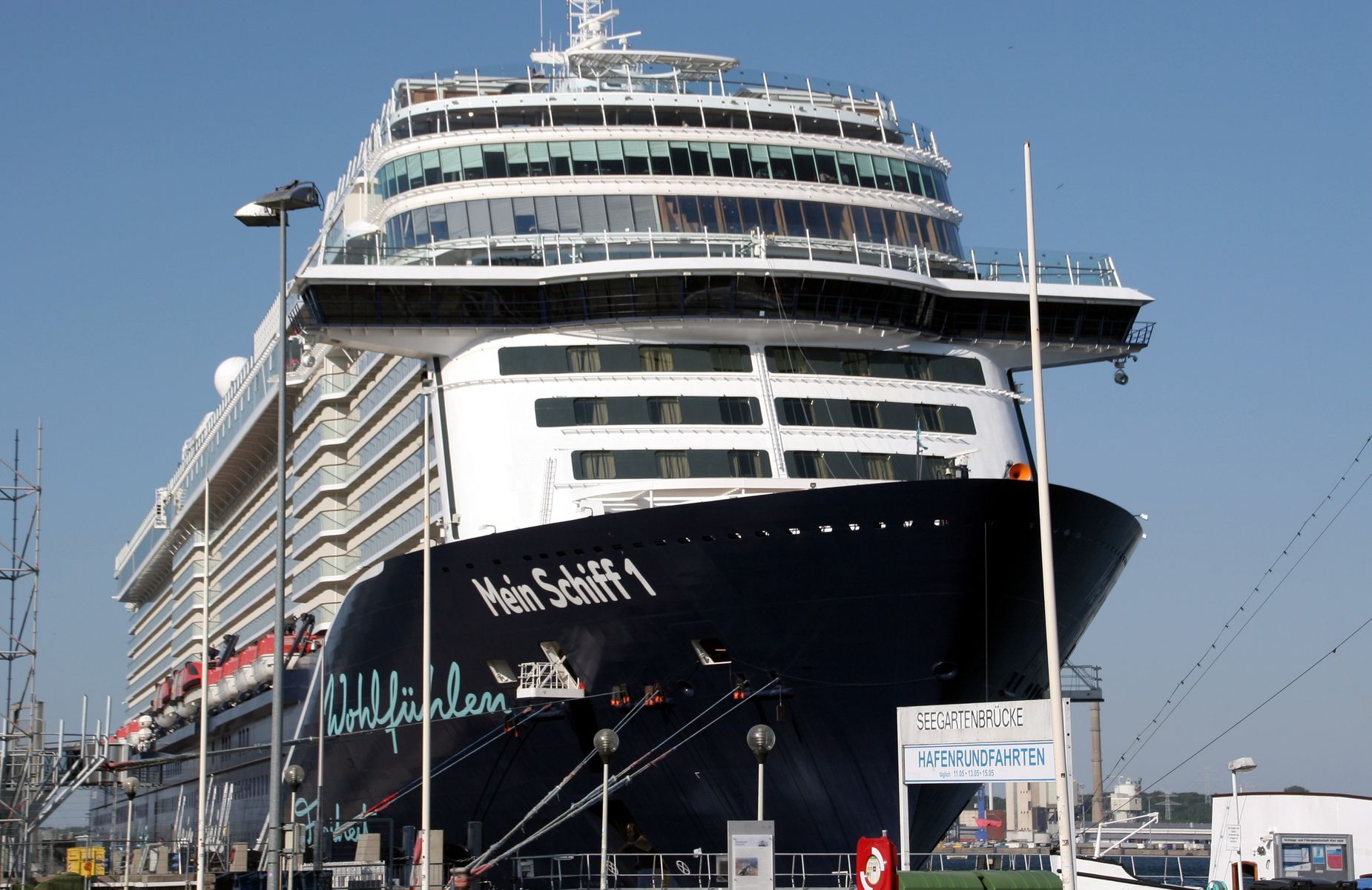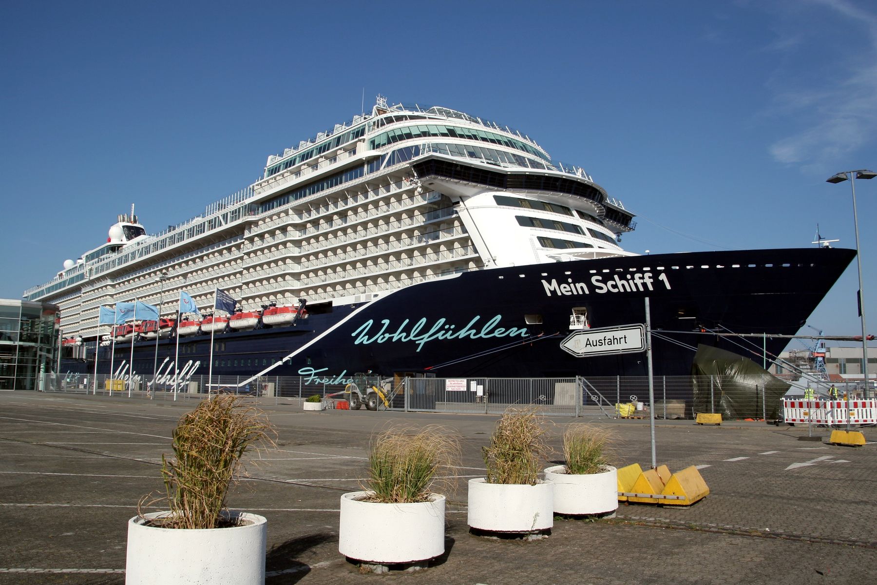 Die "Mein Schiff 1" unter einem azurblauen Himmel am Ostseekai (Liegeplatz 27)