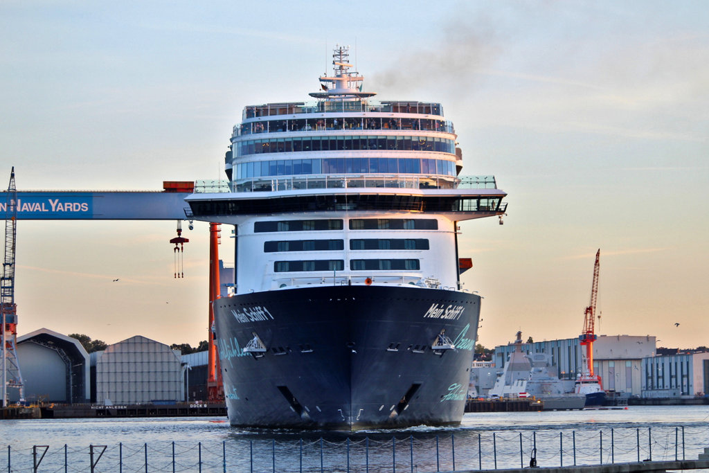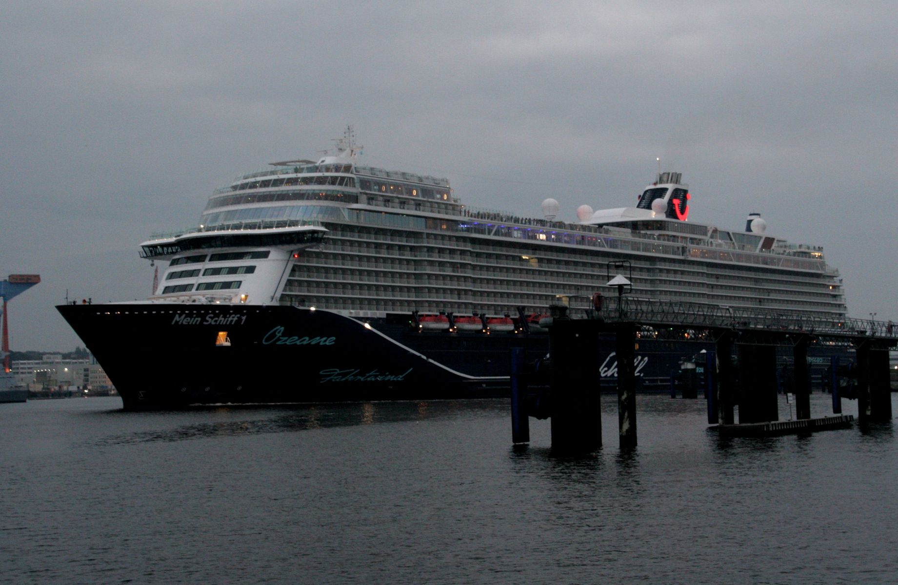 Die "Mein Schiff 1" dreht vor der Flaniermeile "Kiellinie" auf dem "Teller"