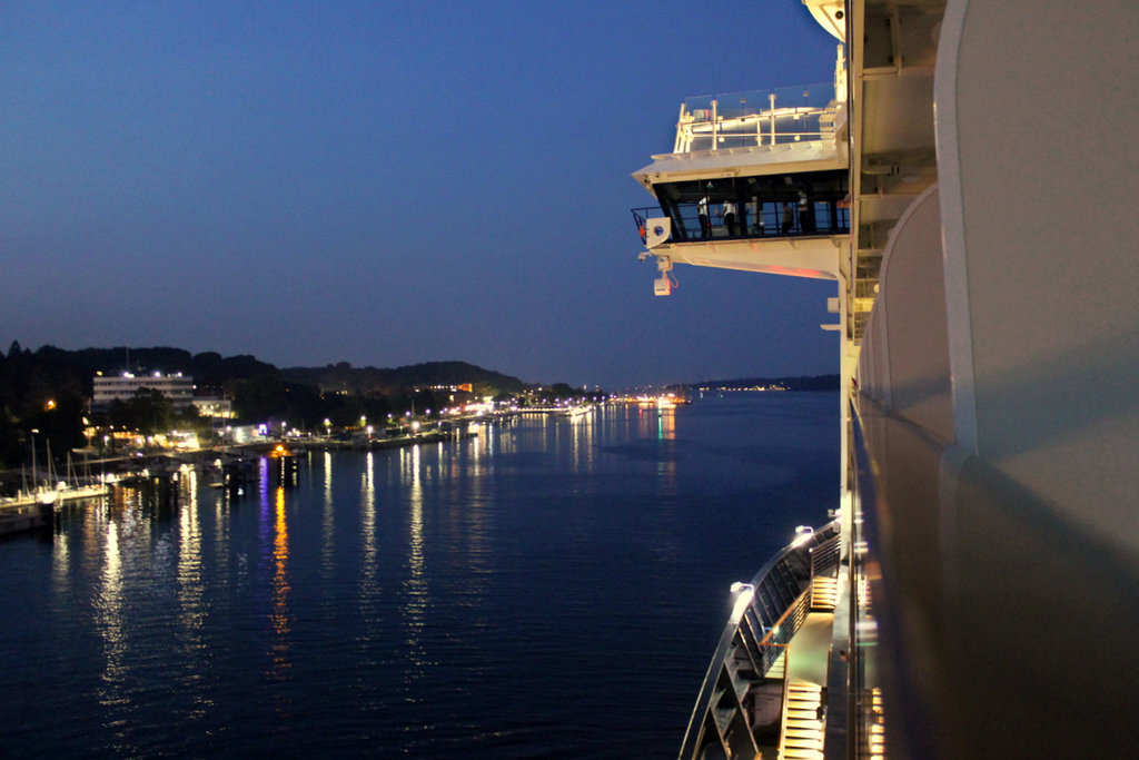 Die "Mein Schiff 1" fährt sehr pünktlich um 19:00h ihr Auslaufmanöver auf der "Kieler Förde"