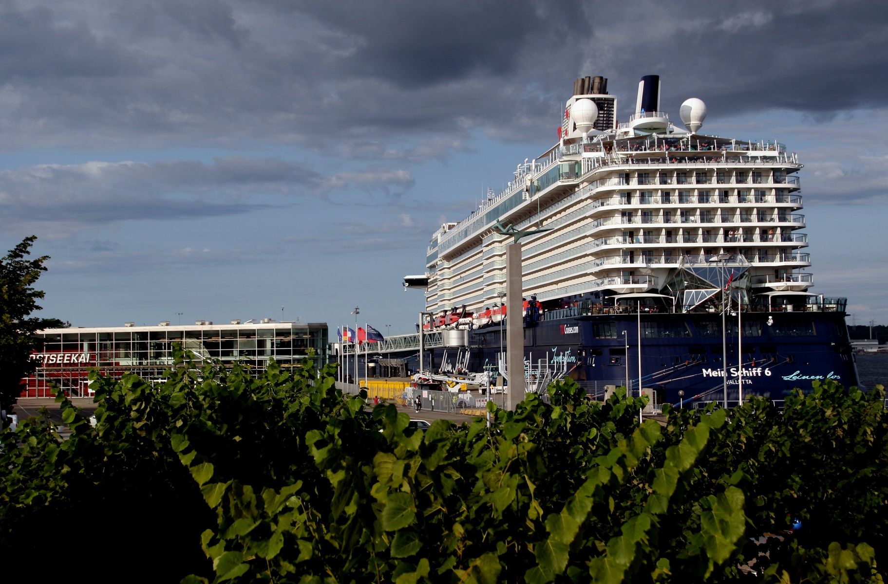 Die "Mein Schiff 1" unter einem azurblauen Himmel an ihrem "Liegeplatz 27" am Ostseekai in Kiel
