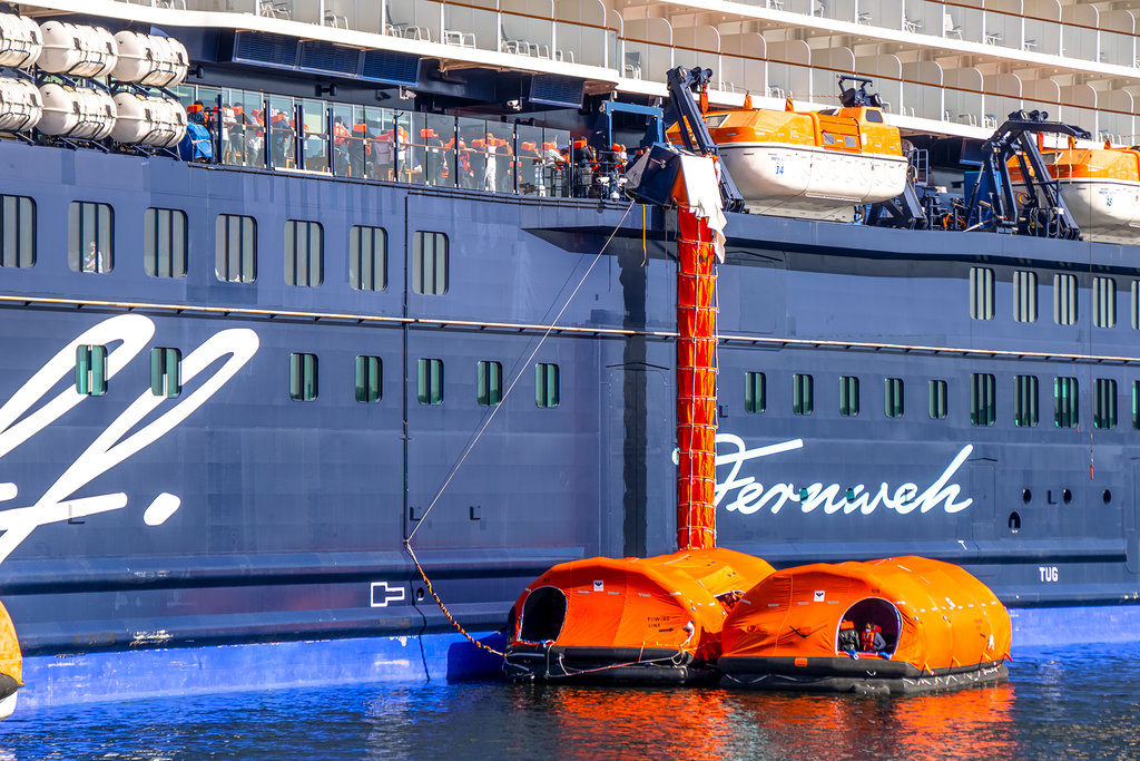die Übung mit den Rettungsbooten gefällt der Crew bestimmt sehr gut