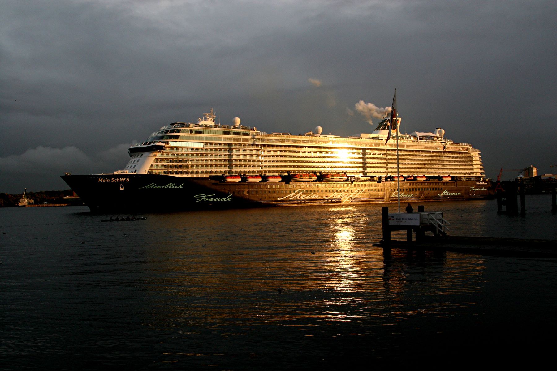Die "Mein Schiff 6" fährt um 19:00h ihr Auslaufmanöver auf der "Kieler Förde" im abendlichen Lichterglanz der untergehenden Sonne