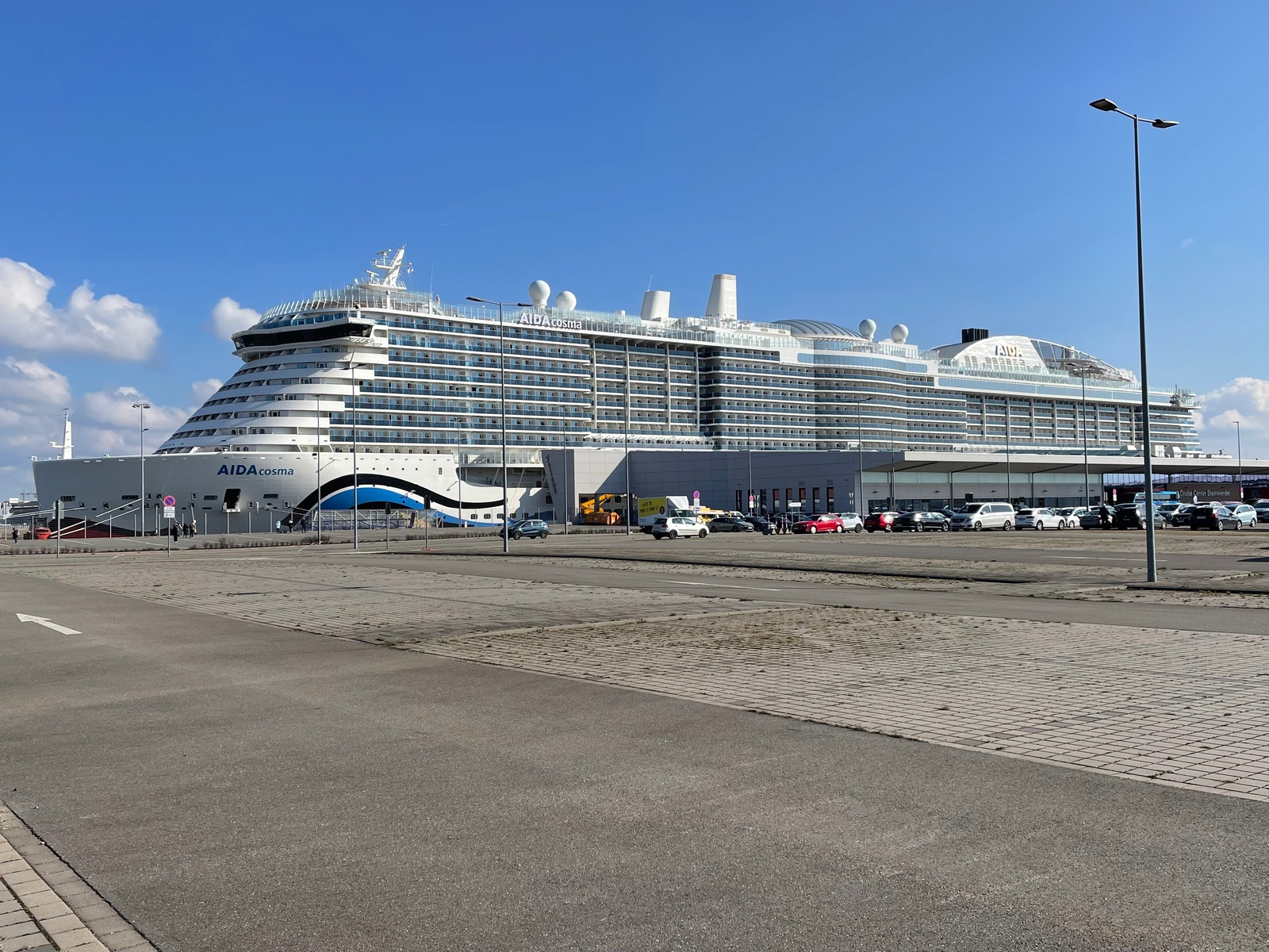 So, heute war ich nun tapfer bei Wind und Nieselregen vor Ort am Cruisecenter und bin dort auf der Aussichtsplattform sogar noch bis ganz rauf - das Absperrseil habe ich gar nicht gesehen, die Brille war so beschlagen…