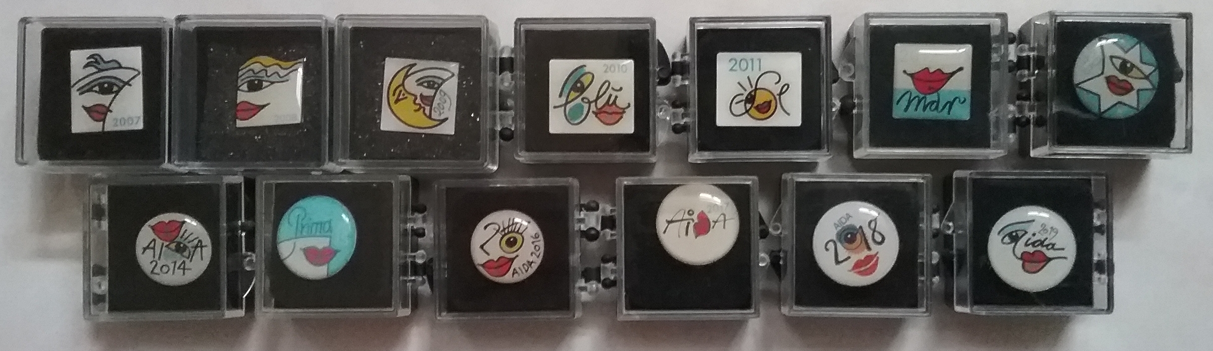Vorher gab es keine Pins, die sich auf ein Schiff oder ein Jahr bezogen, wohl aber solche mit dem AIDA-Schriftzug und Hintergrund in Schwarz, Orange, Grün und Dunkelblau, sowie Sondereditionen in Weiss und Silber.