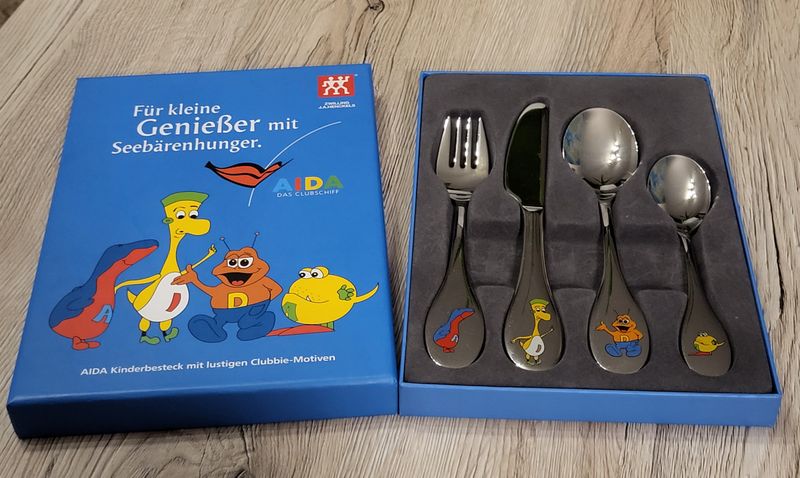 Edit: Mein Sohn hat mir gerade eine Sprachnachricht von Bord geschickt. Auf der Luna ist das Kinderbesteck nicht mehr vorrätig. Tipp: Ich soll mal in Rostock nachfragen, ob es überhaupt noch auf irgendeinem Schiff erhältlich wäre.