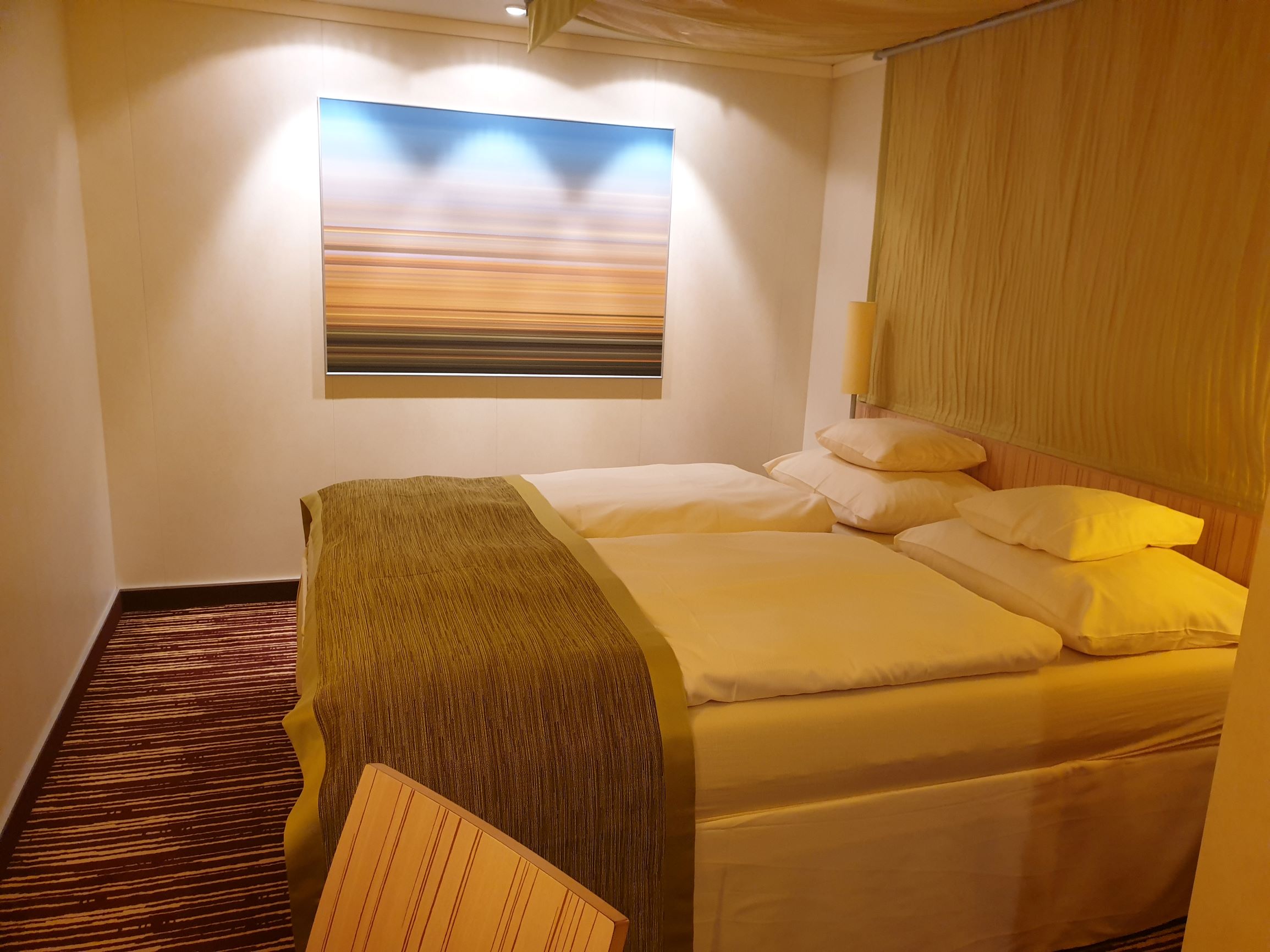 Eine sehr schöne Innen-Kabine mit Doppelbett und Kopf in Fahrtrichtung. Farben sehr angenehm in lindgrün gehalten.