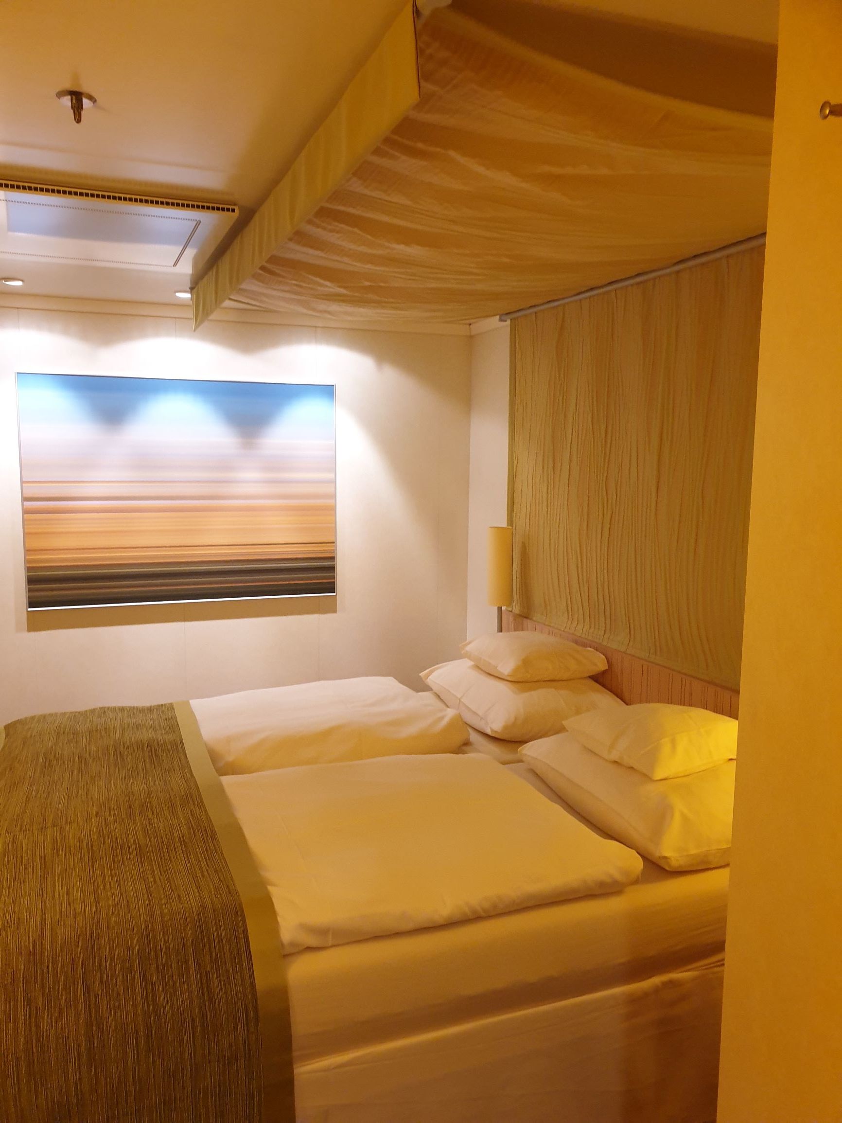 Eine sehr schöne Innen-Kabine mit Doppelbett und Kopf in Fahrtrichtung. Farben sehr angenehm in lindgrün gehalten.