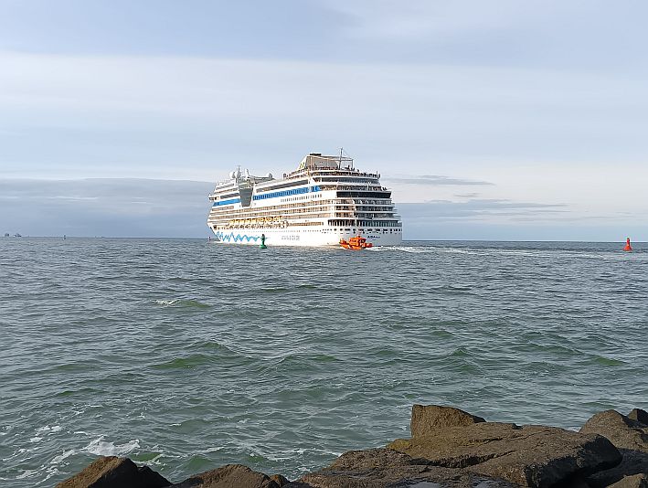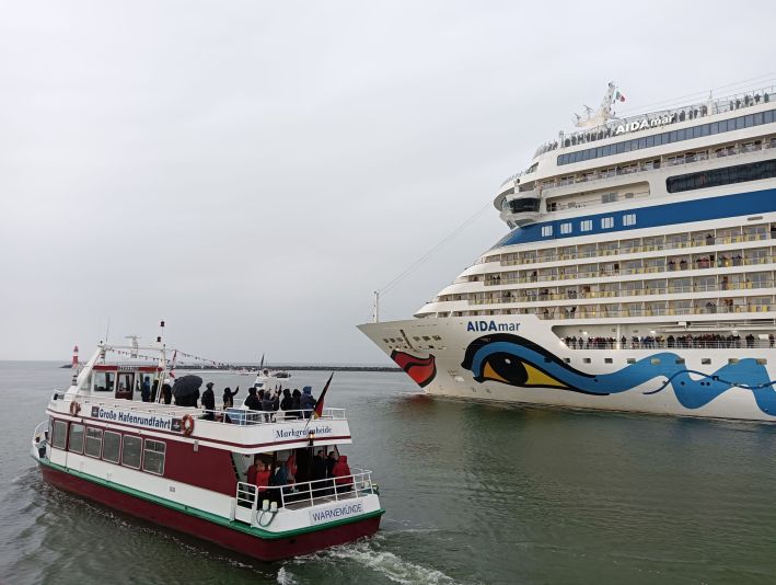 Um 17:15 Uhr ging´s los vom Alten Strom und zunächst eine "Runde" um die noch vertäute AIDAmar. Doch wir bekamen die Info, dass es pünktlich um 18 Uhr losgehen würde.